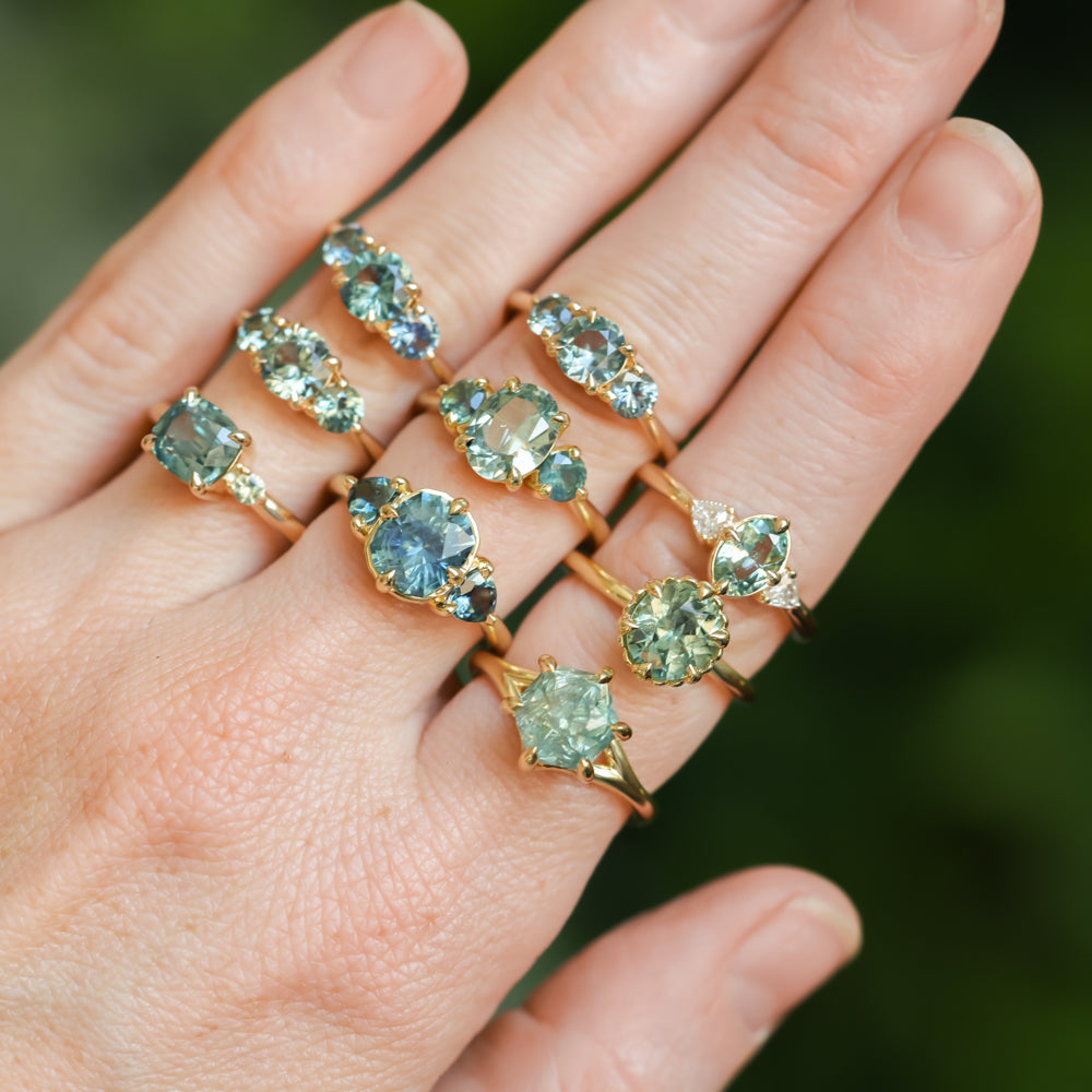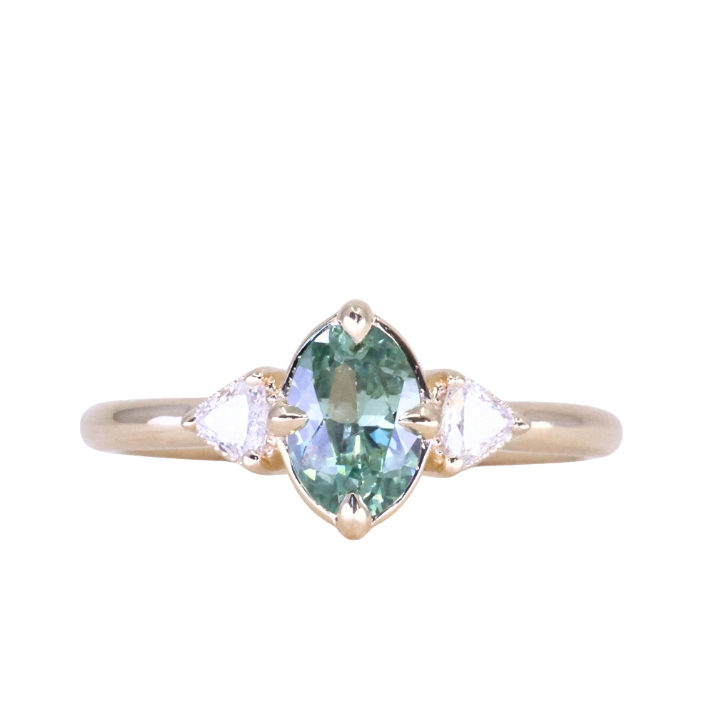 Low profile, minimalist three stone ring featuring a minty unheated Montana sapphire and natural, white diamonds framed by dainty milgrain.