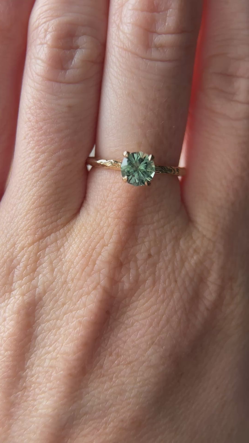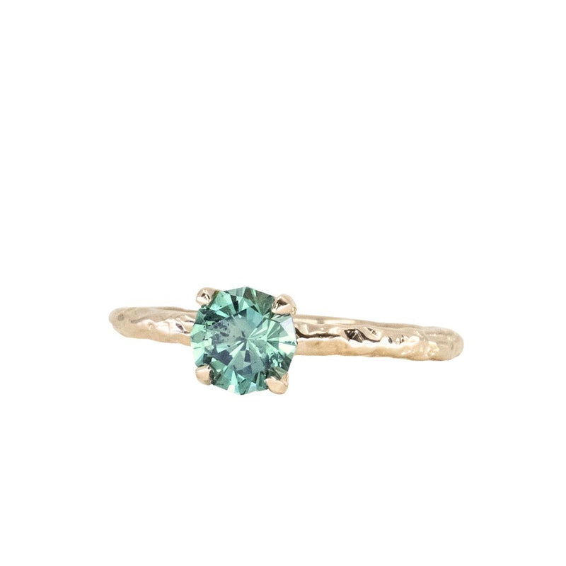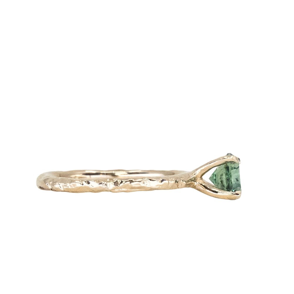 0.83ct Untreated Teal Montana Sapphire Evergreen Carved 4 Prong Solitaire in 14k Yellow Gold