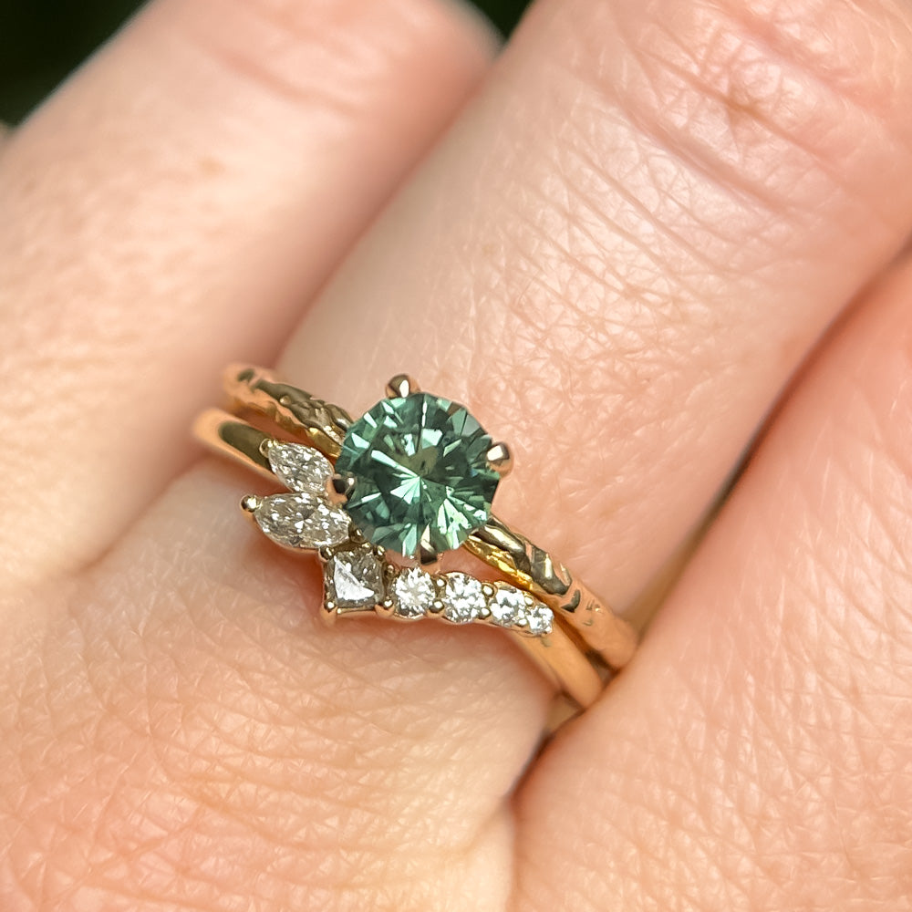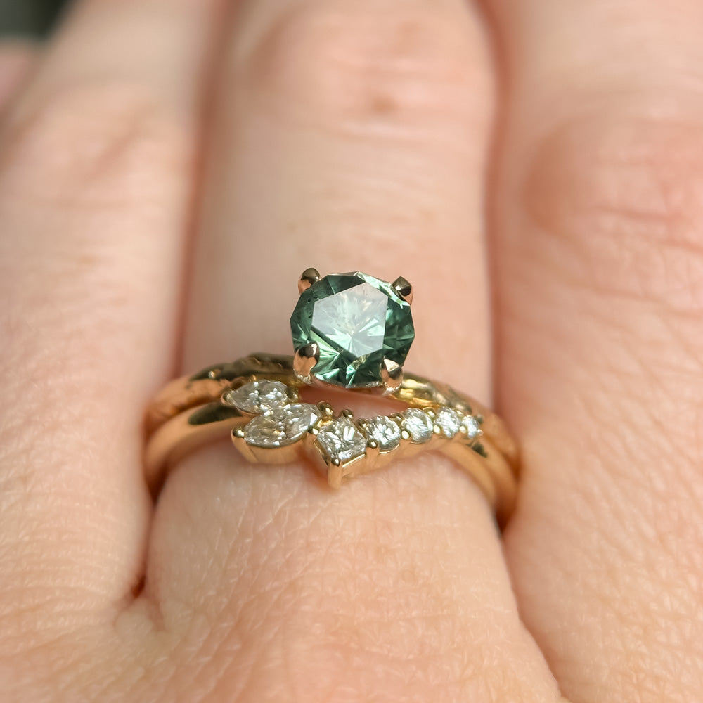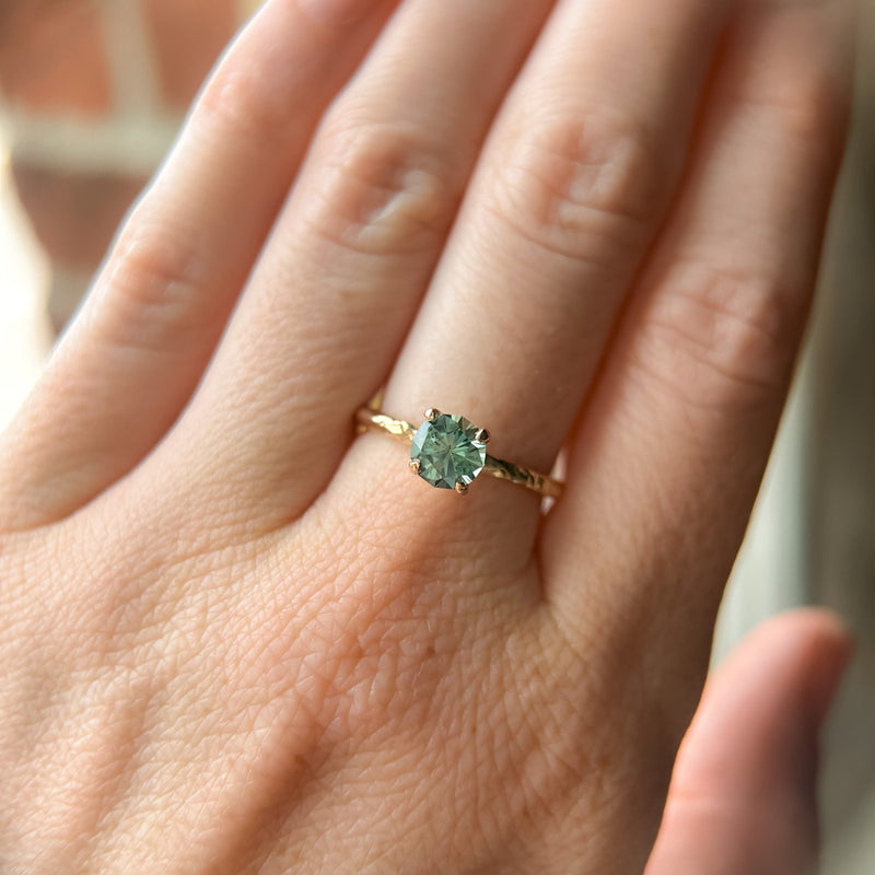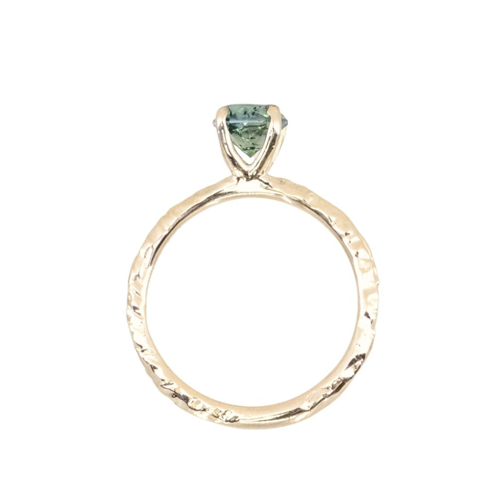 0.83ct Untreated Teal Montana Sapphire Evergreen Carved 4 Prong Solitaire in 14k Yellow Gold