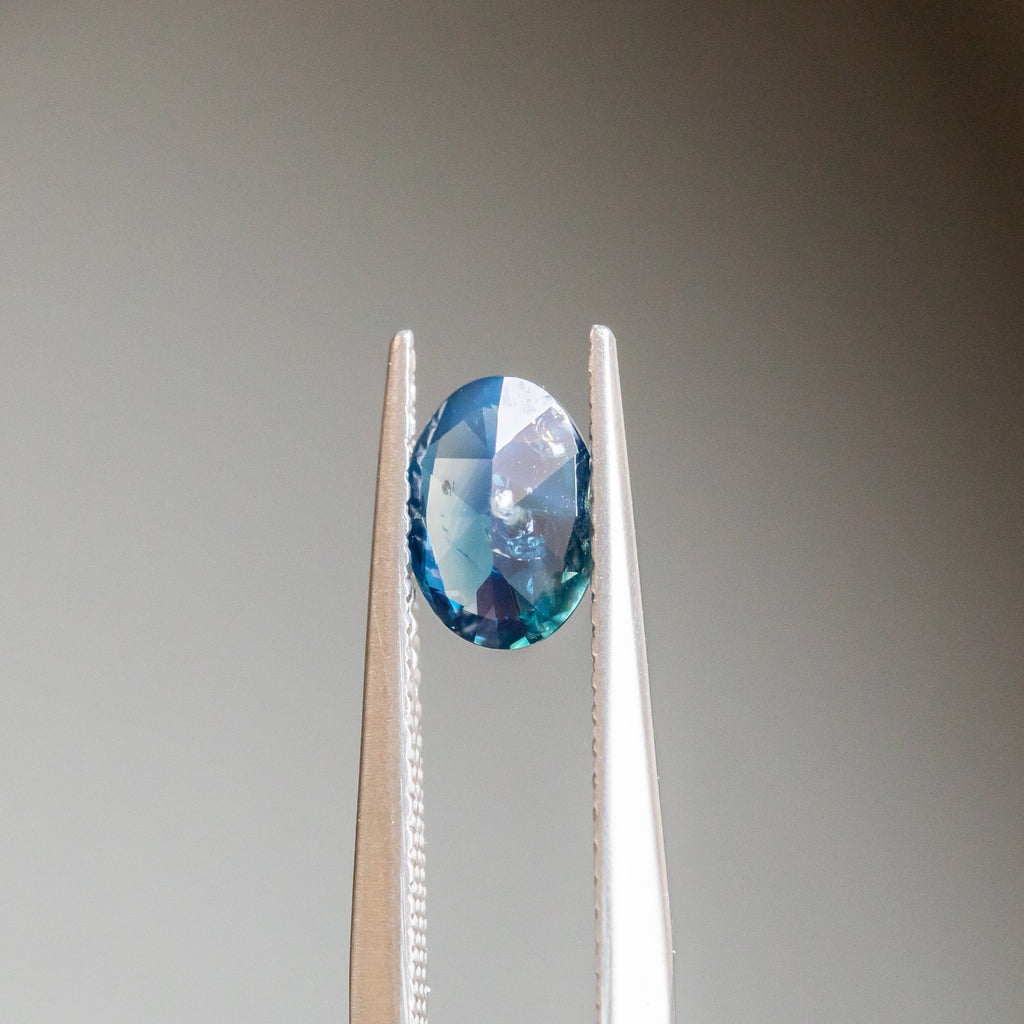 0.87CT OVAL NIGERIAN SAPPHIRE, ROYAL TEAL BLUE, 6.94X5.03X3.12MM, UNTREATED. Some natural, visible inclusions in this stone which make it a budget but. The color is vibrant and has lighter teal flashes that catch the light!