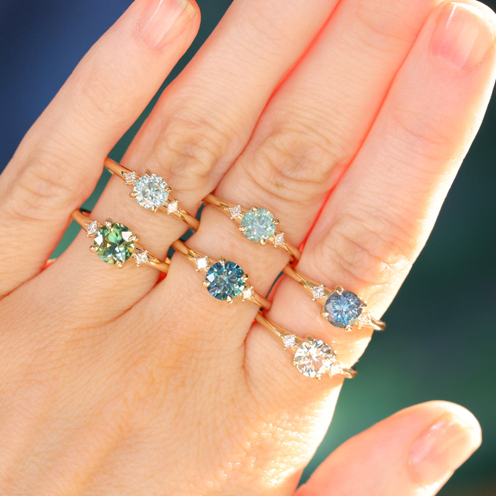 Brand *NEW* low profile, diamond-accented style for our minimalists! The "Rapids" ring features two natural princess cut diamonds set compass-style in a smooth, contoured band, and a four prong low profile-set center stone, in this case a 0.91ct round white, silvery and untreated Montana sapphire. This style stacks best with curved bands if you are creating a ring stack.