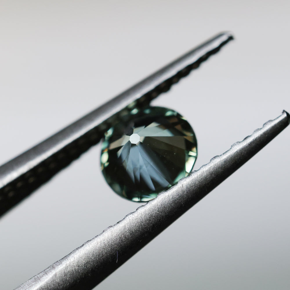 Sparkling Montana sapphire with a flowery brilliant cut and an open culet, a nod to antique Old European Cut stones. Light, even silk but very brilliant. Will shift in color from teal blue green in natural light to grey green indoors.