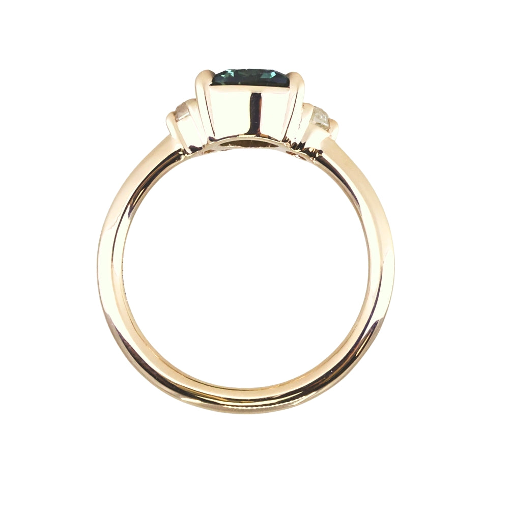 The setting is cast in 14k recycled yellow gold and sits low to the hand, stacking well with curved bands or straight bands with a slight gap. We made this one with a round, polished band but can add our signature Evergreen hand carved texture by request.