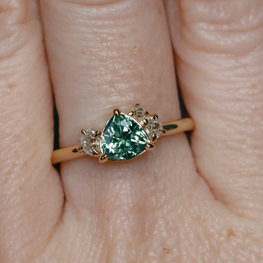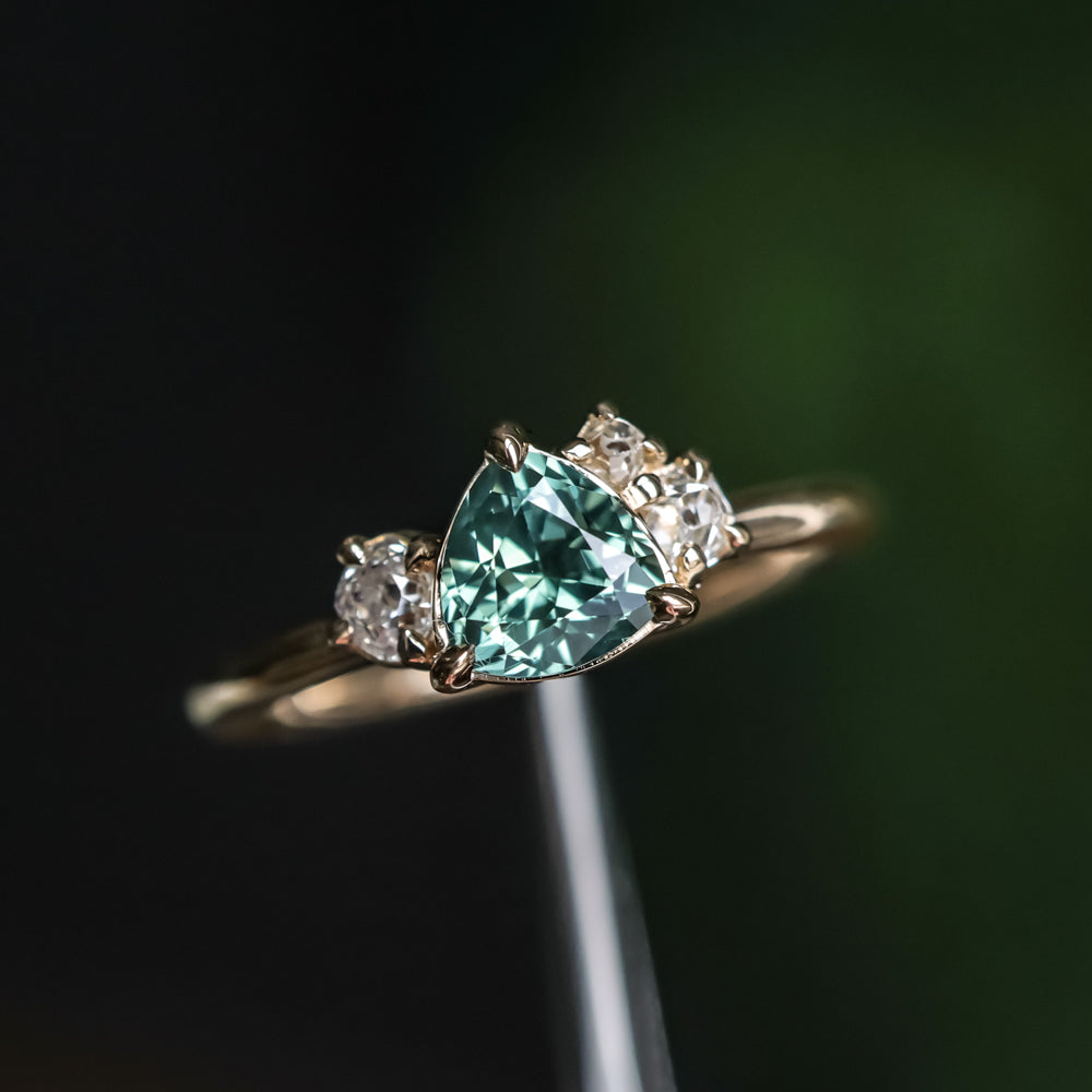 The mountain-inspired style that sells out fast! Our low profile "mountainscape" rings typically feature a trillion or triangle center sapphire and asymmetrical clustered diamonds on either side; like your favorite mountain peak and its rolling foothills! This one features a one-of-a-kind sapphire mined in Australia and genuine, funky antique diamonds.