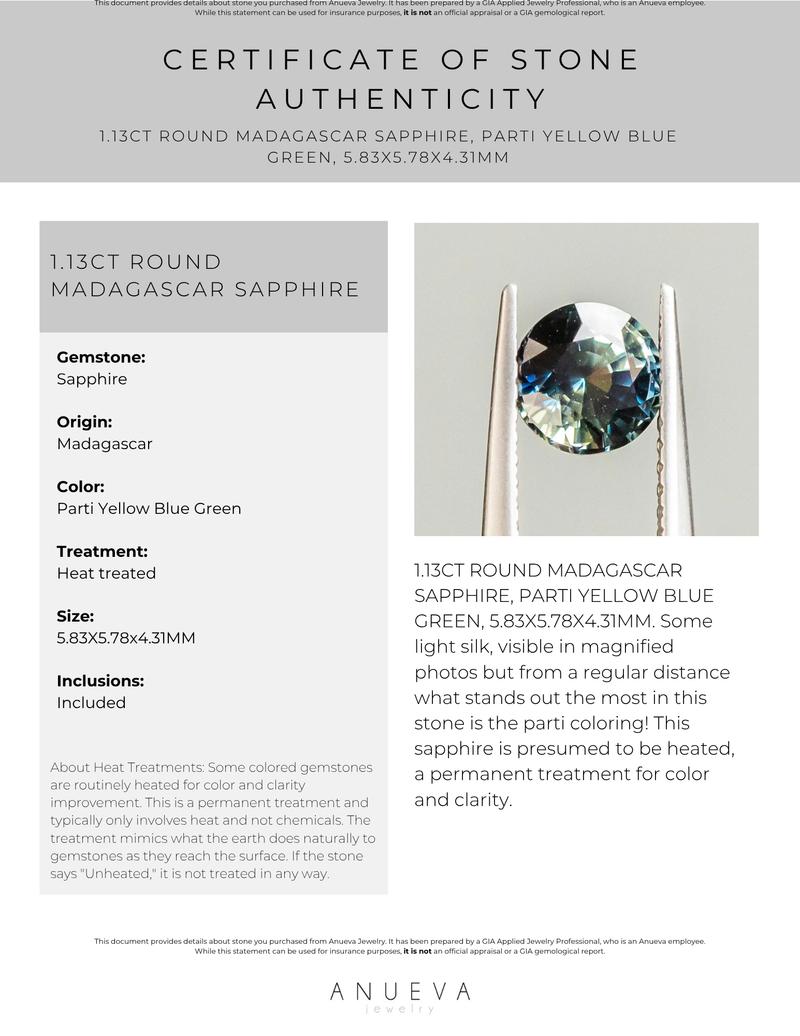 1.13CT ROUND MADAGASCAR SAPPHIRE, PARTI YELLOW BLUE GREEN, 5.83X5.78X4.31MM. Some light silk, visible in magnified photos but from a regular distance what stands out the most in this stone is the parti coloring! This sapphire is presumed to be heated, a permanent treatment for color and clarity.