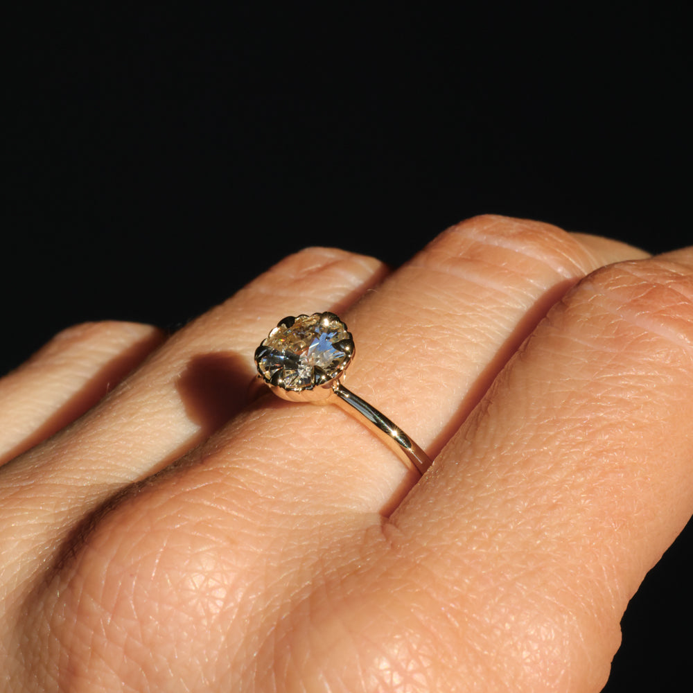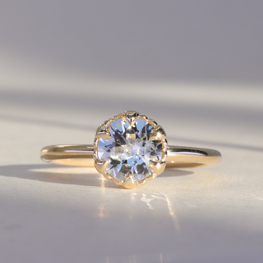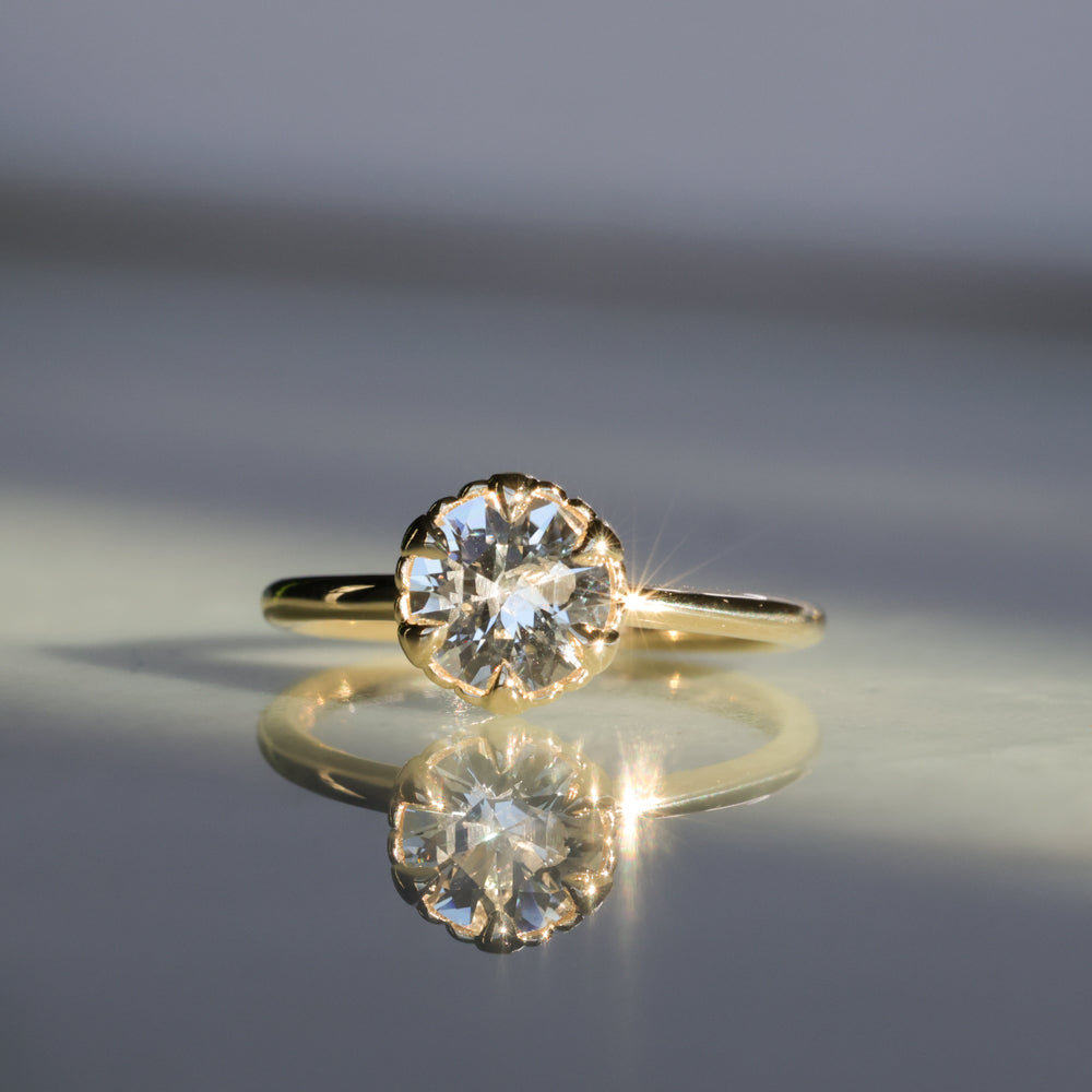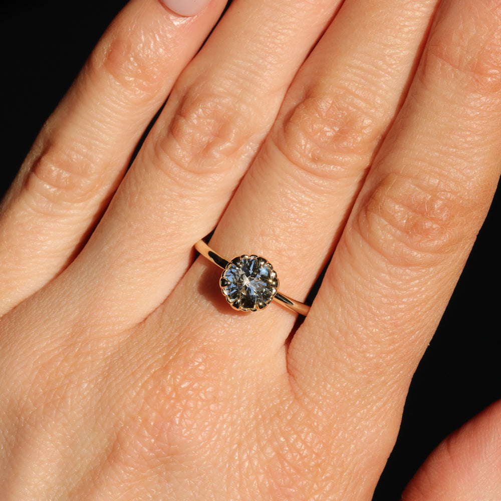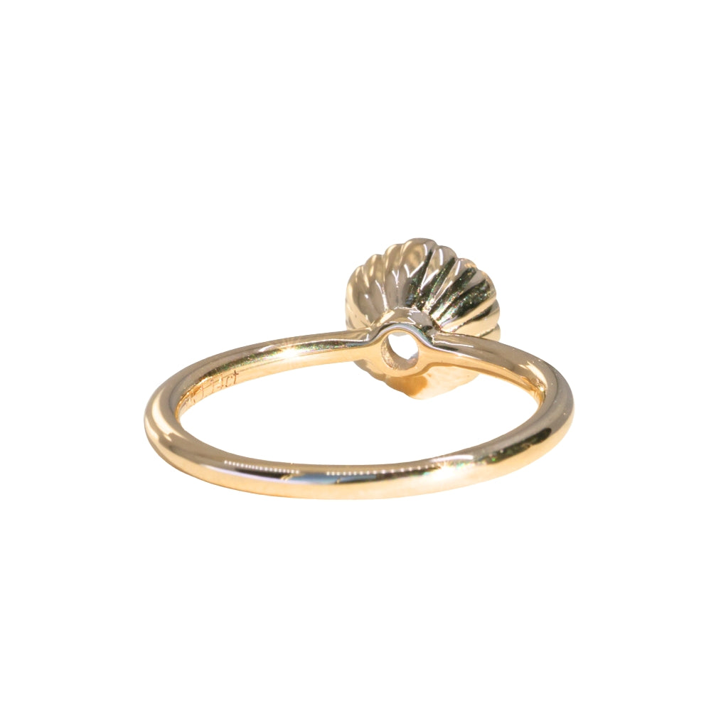 Combining timeless elegance with a touch of sea-inspired charm, our Scallop Cup Solitaire is a one-of-a-kind ring! It features a weighty, 14k recycled yellow gold band with a classic, rounded shank and polished finish. This specific Scallop Cup Solitaire features a silvery white Sri Lankan sapphire weighing 1.14ct.