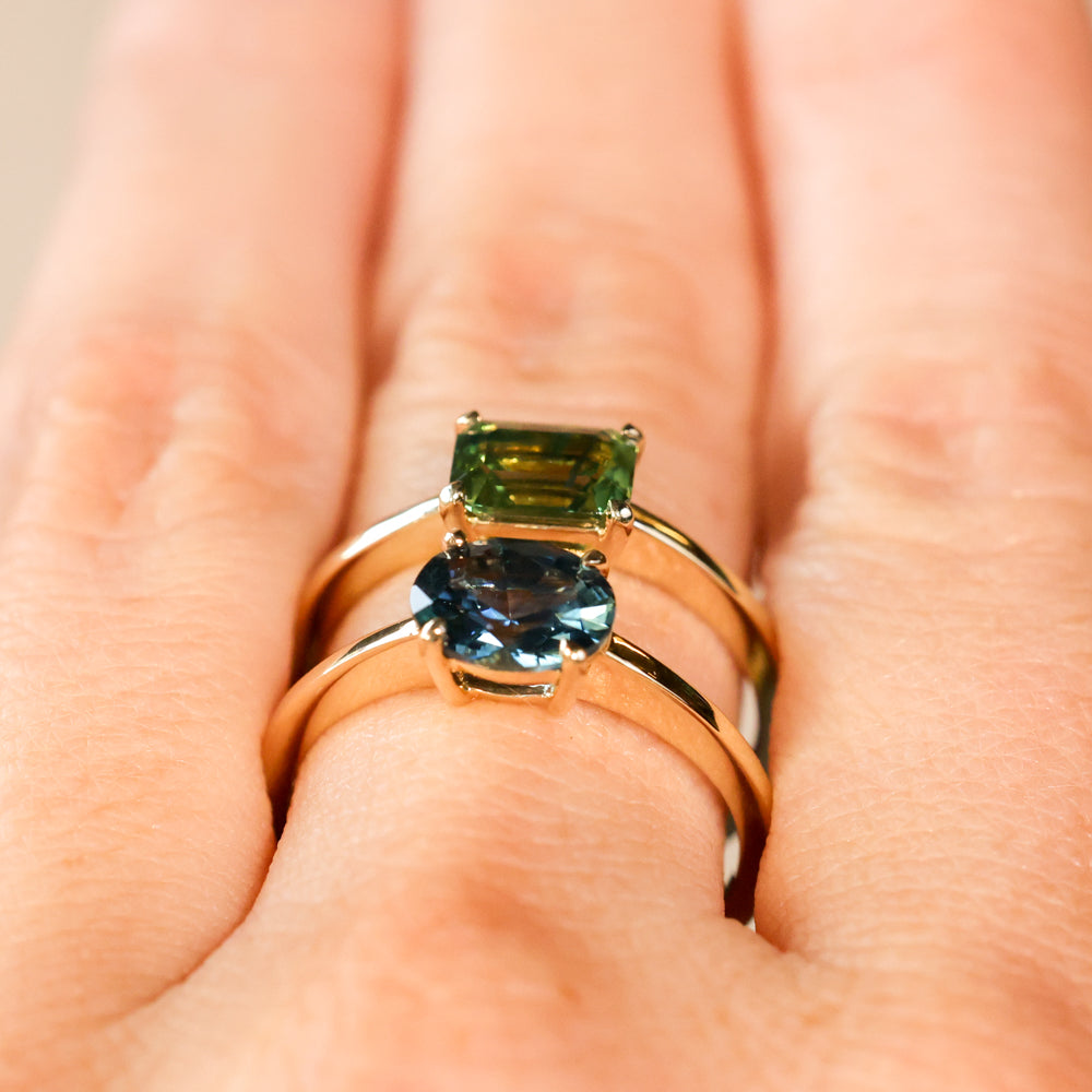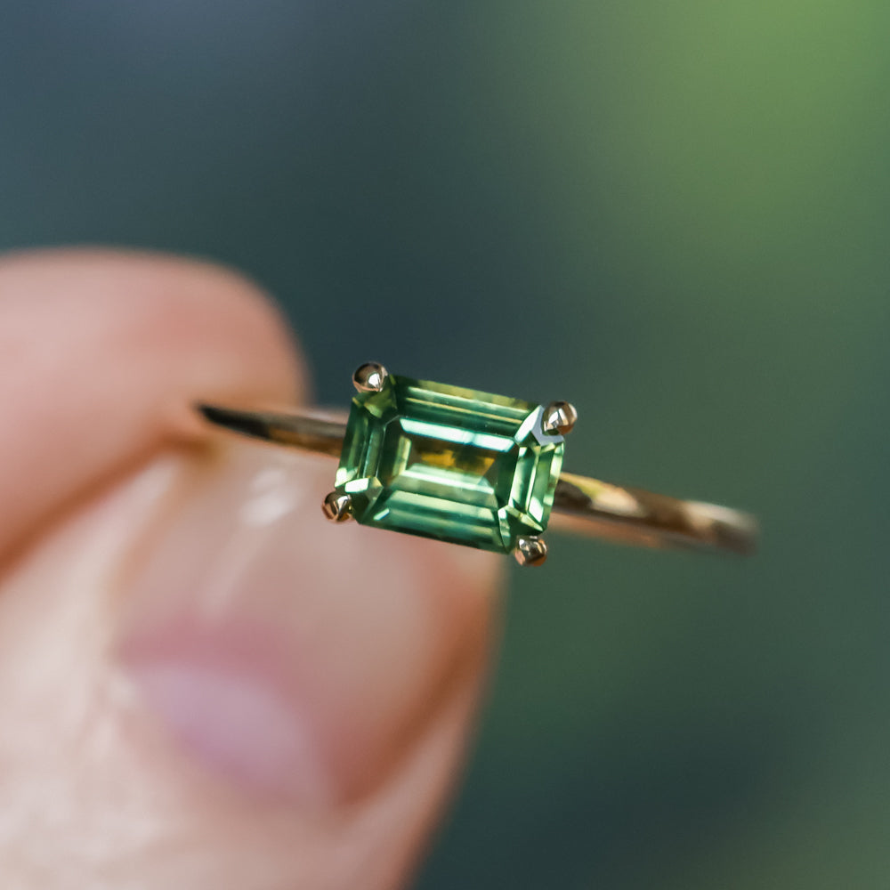 Minimalist, light and airy low profile Australian emerald cut sapphire ring set East-West in 14k yellow gold. The sapphire has beautiful, bright apple green coloring with parti segments of blue color.