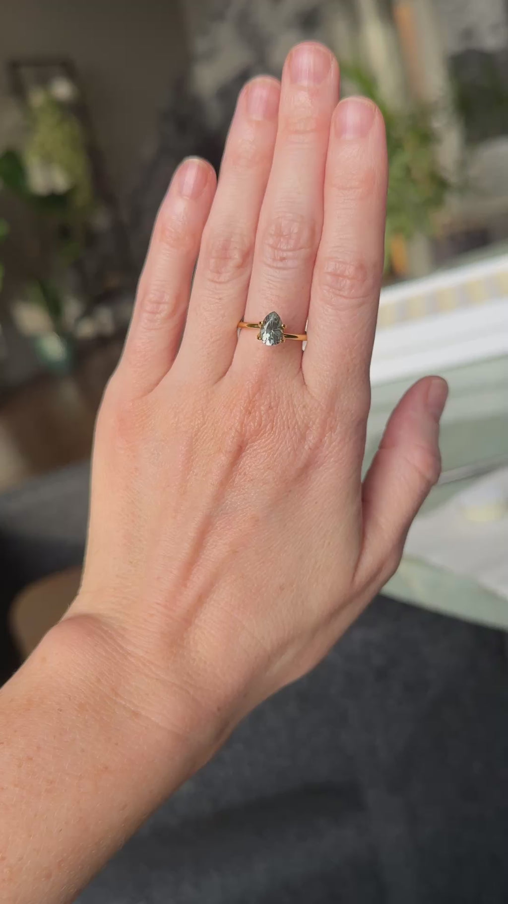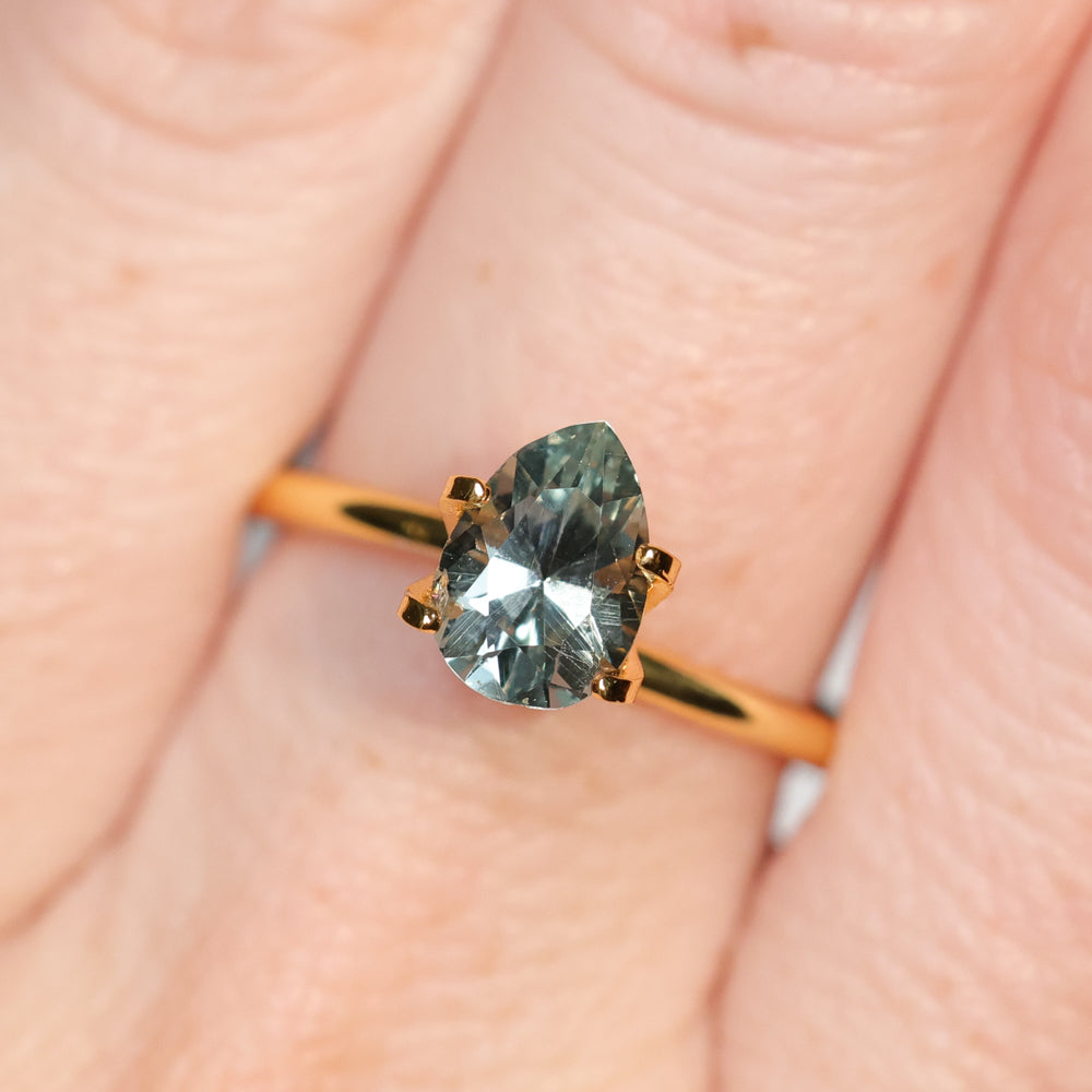 1.23CT PEAR BRILLIANT MONTANA SAPPHIRE, LIGHT BLUE GREY, UNTREATED, 8.09X5.69X3.99MM. Old stock from Ruby Creek Mine in Montana! This sapphire is totally natural/untreated and is a medium-light blue grey in natural light and more green indoors. Does have some light visible silk but the brilliant cut is lovely!