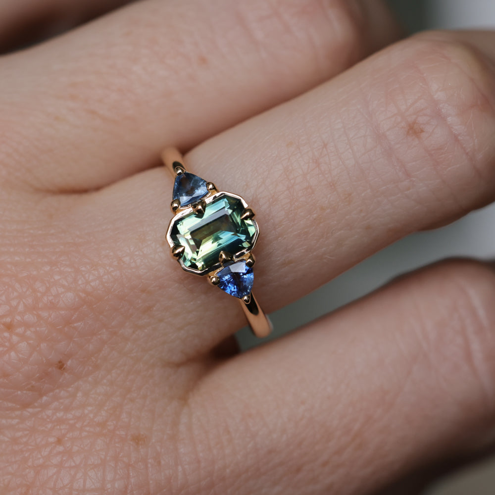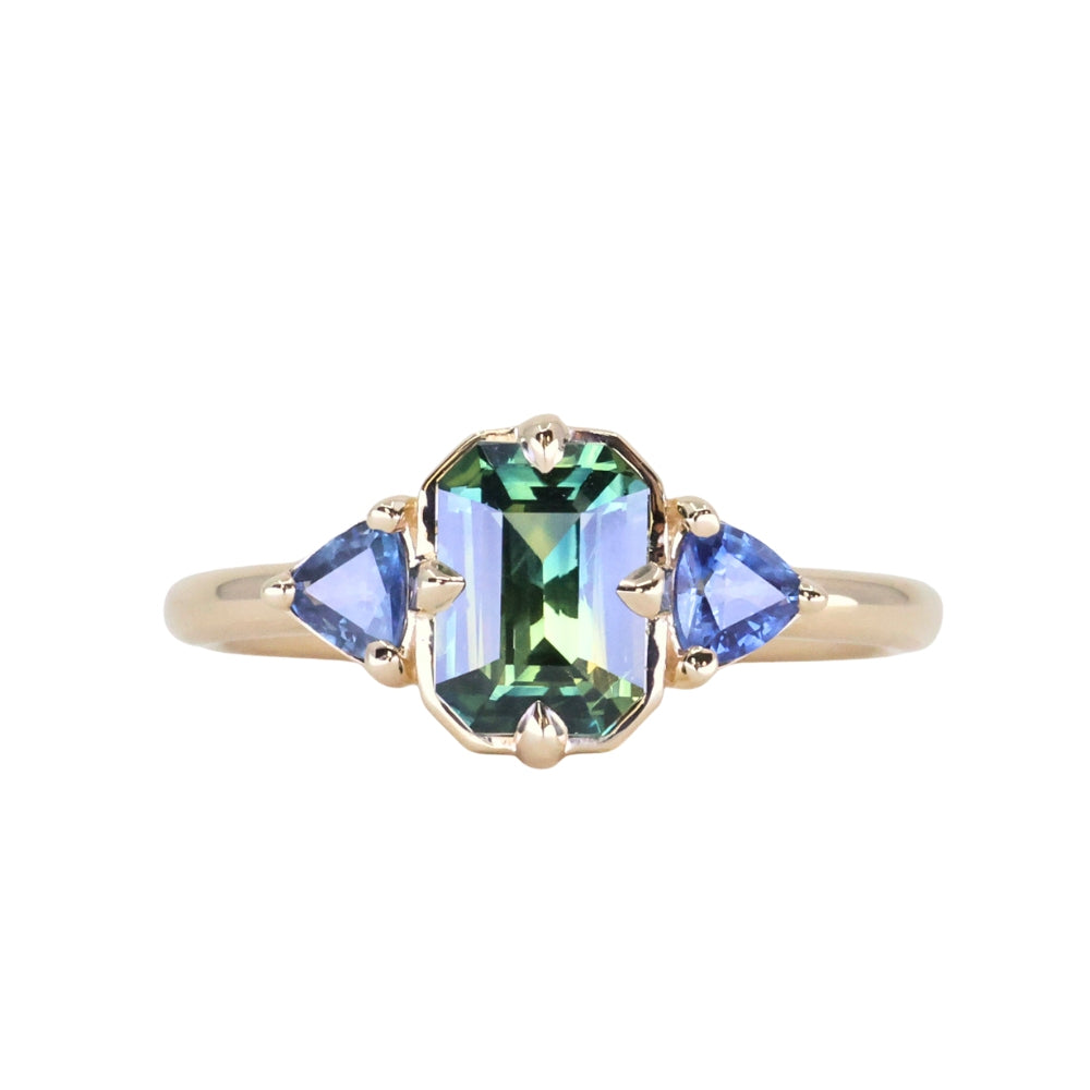 Antique-inspired and low profile sapphire ring with hand applied milgrain, featuring natural blue and parti green sapphires, the center being a unique, untreated parti emerald cut Madagascar sapphire.
