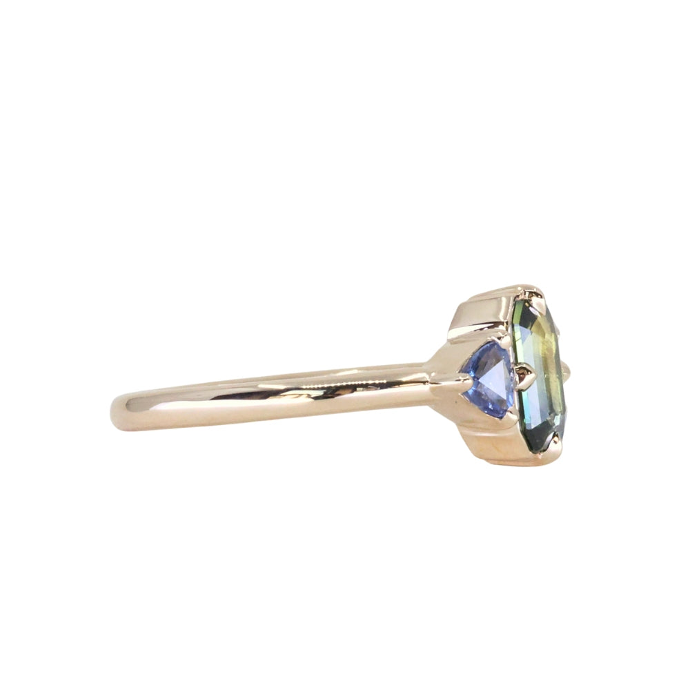 1.24ct Untreated Emerald Cut Parti Madagascar Sapphire and Trillion Sapphire Compass Set Low Profile Ring in 14k Yellow Gold