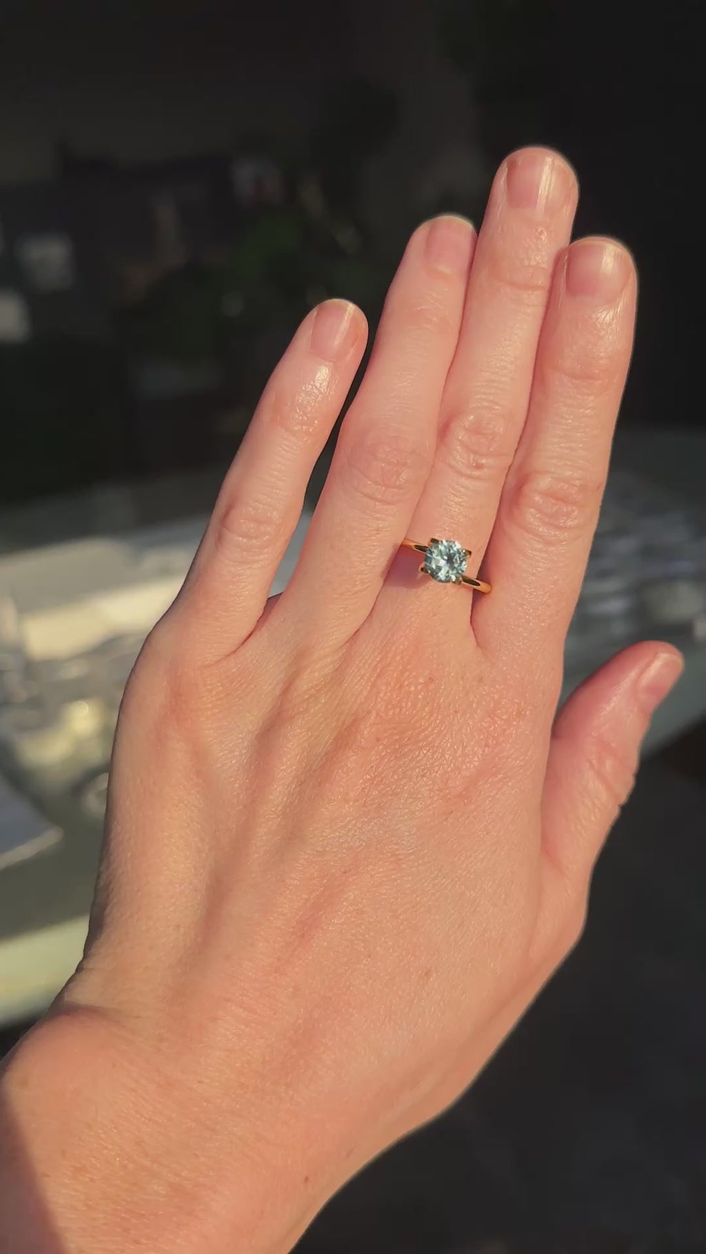 Old stock from Ruby Creek, Montana, USA, with a transitional vintage type, brilliant cut. This sapphire is totally natural/untreated and will shift from blue in natural light to green-grey indoors. Light, even silk.