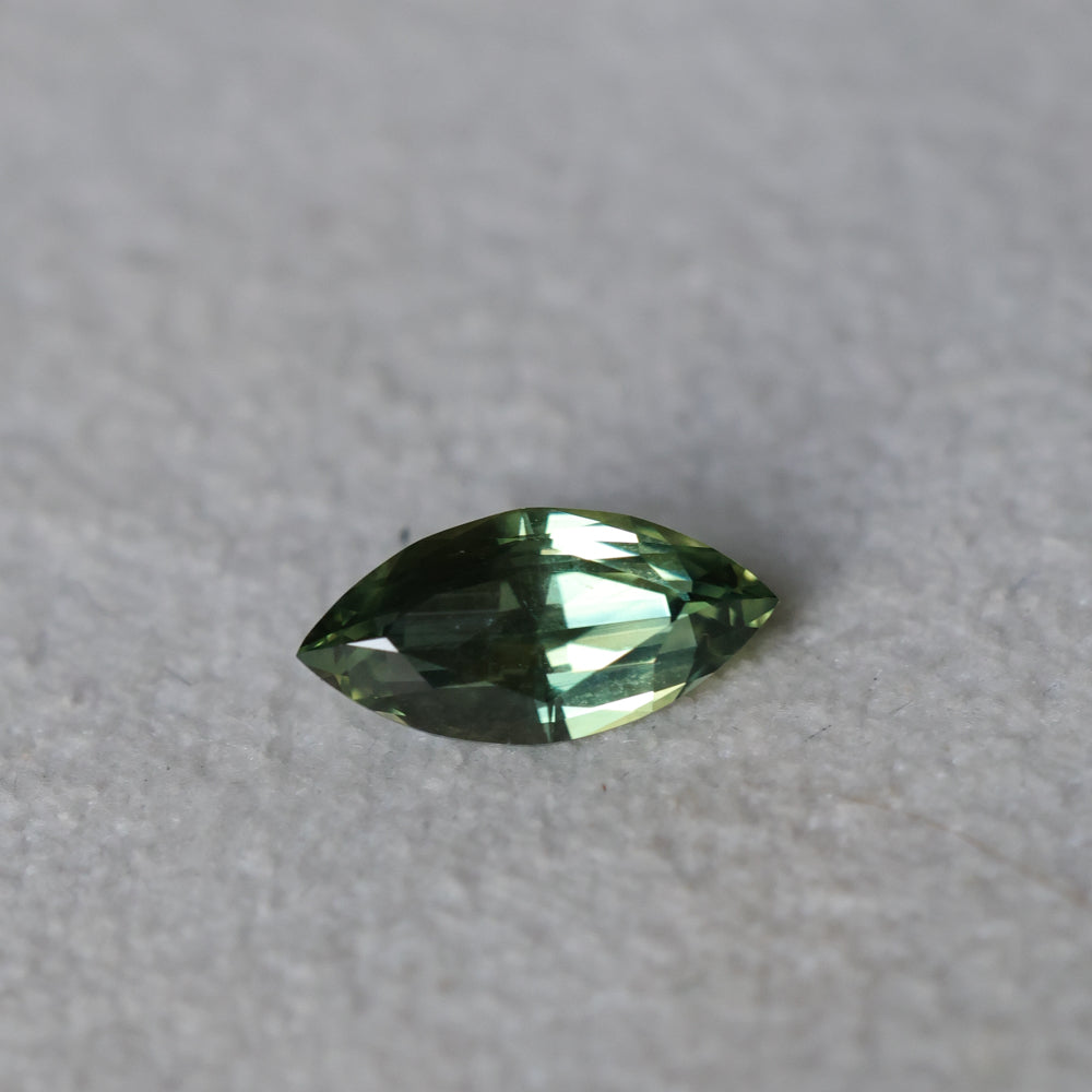 1.28CT AUSTRALIAN MARQUISE SAPPHIRE, PARTI LIGHT AND DARK GREEN, UNTREATED, 9.9X4.88X3.22MM.Totally natural/untreated marquise brilliant sapphire from Australia. Very light silk, sparkling clean and flashes with vibrant greens and yellows.