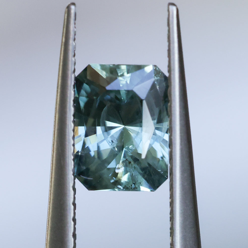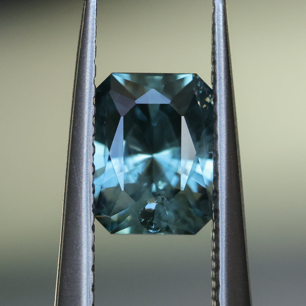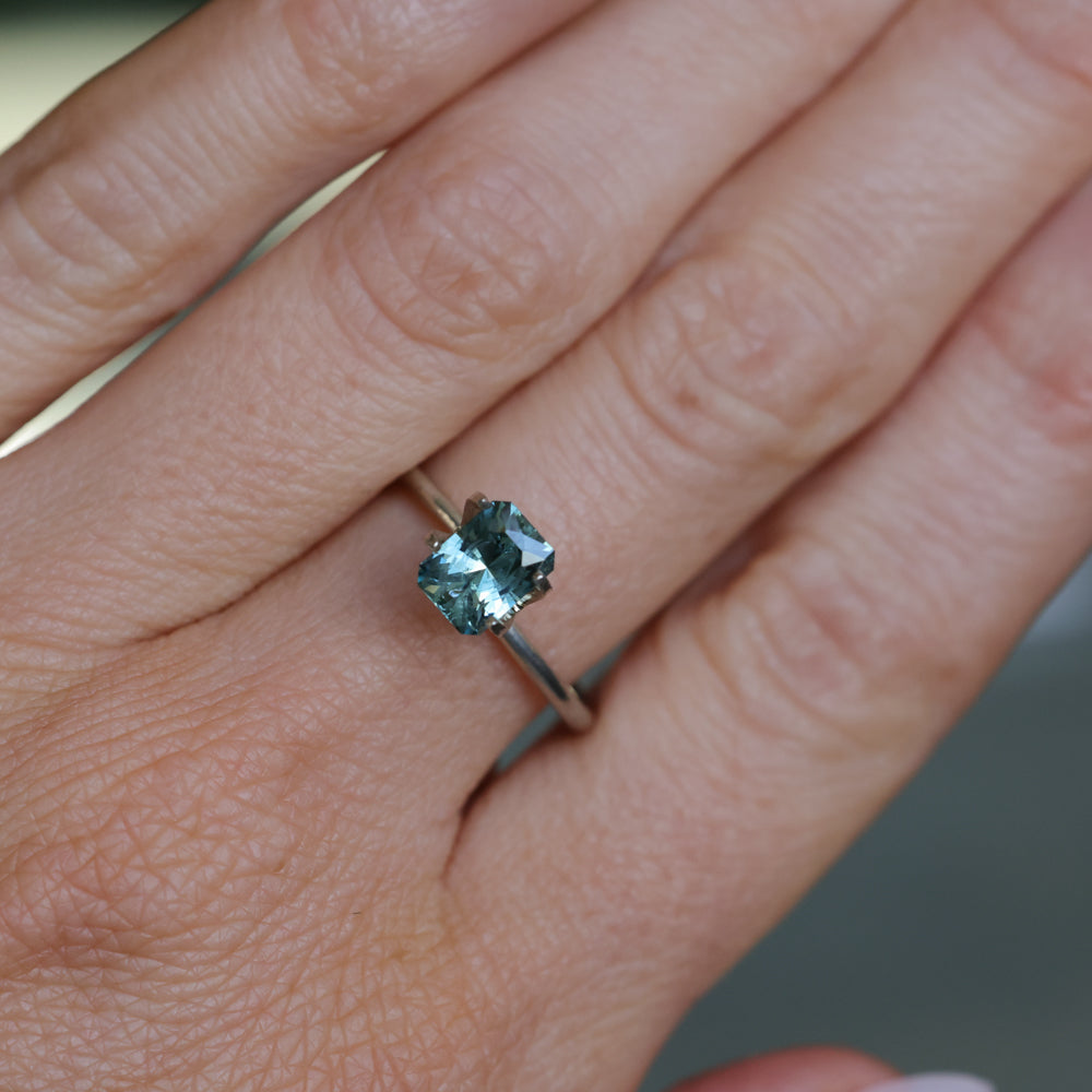 1.30CT RADIANT CUT MONTANA SAPPHIRE, MEDIUM BLUE, 6.9X5.07X3.7MM. This sapphire was mined in Rock Creek, Montana, USA and is heated, a permanent treatment for color and clarity. Visible silk inclusions, common for sapphires mined in Montana. This sapphire is a medium blue in natural light and shifts a little more teal green indoors.