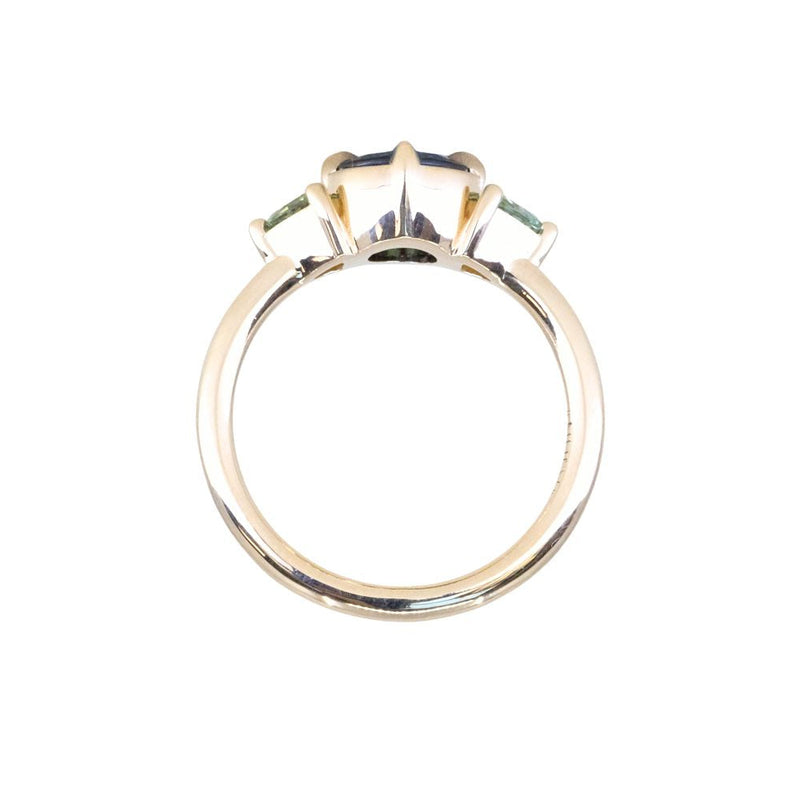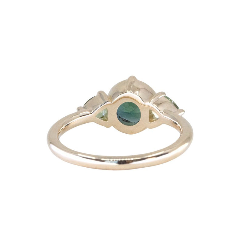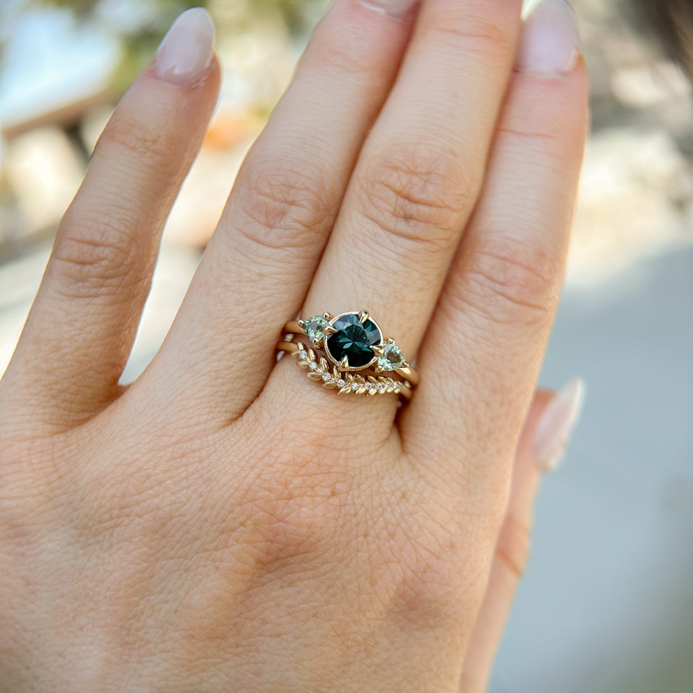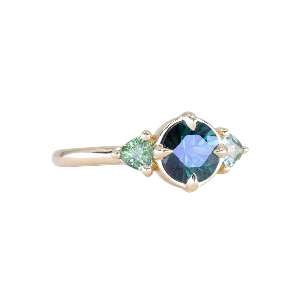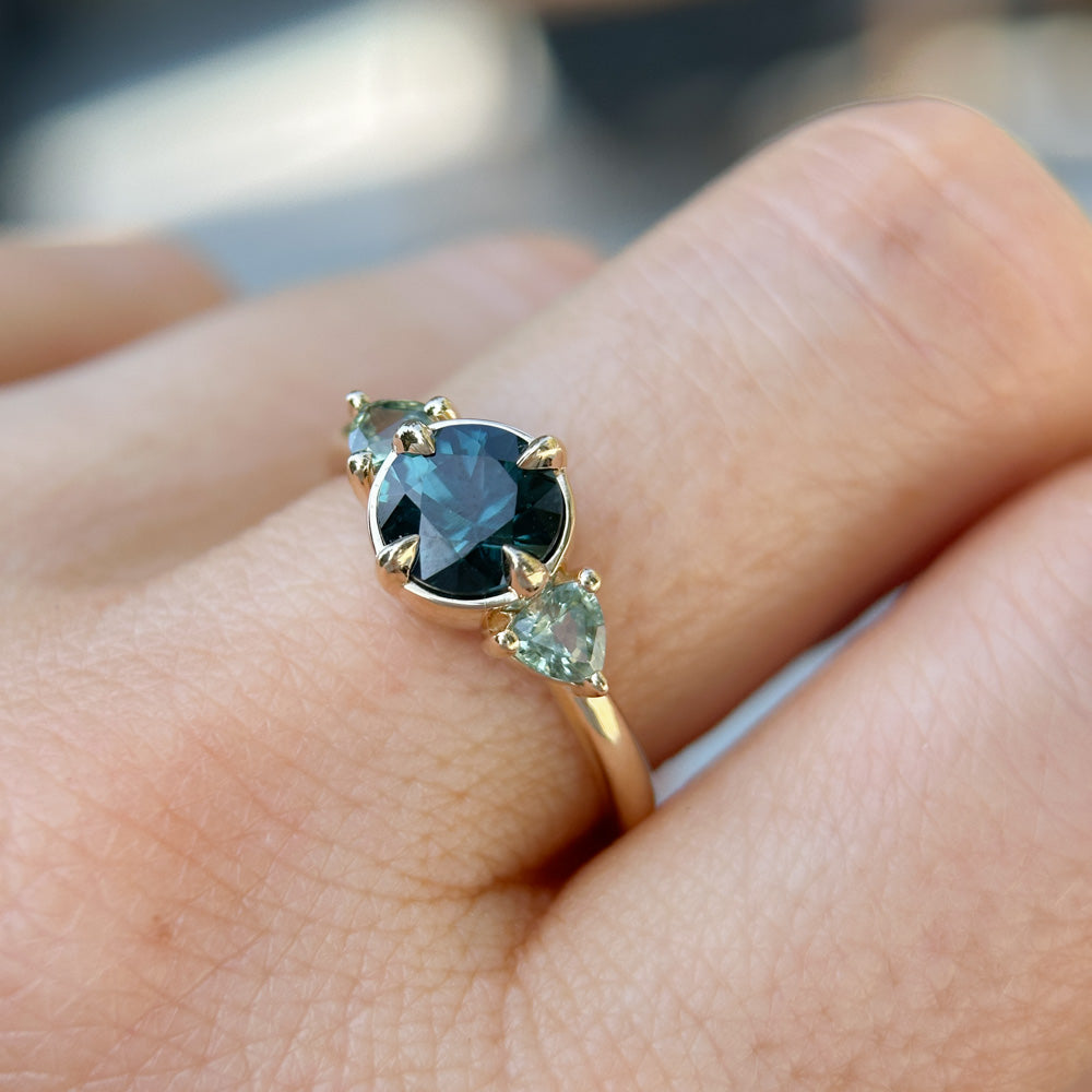 Antique-inspired and low profile sapphire ring with hand applied milgrain, featuring natural blue and seafoam green sapphires, the center being a deep teal 1.31ct Songean sapphire.