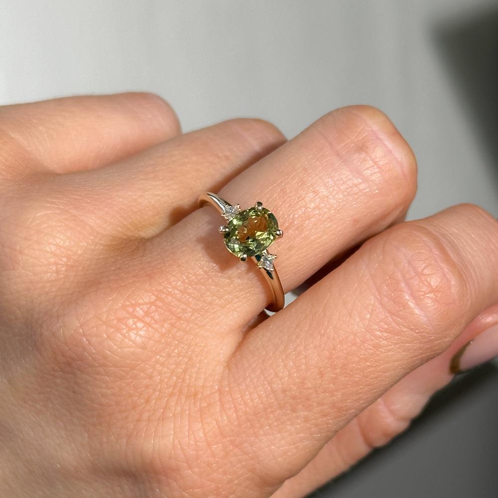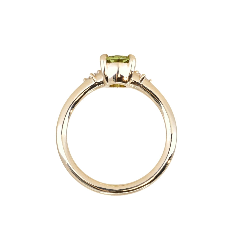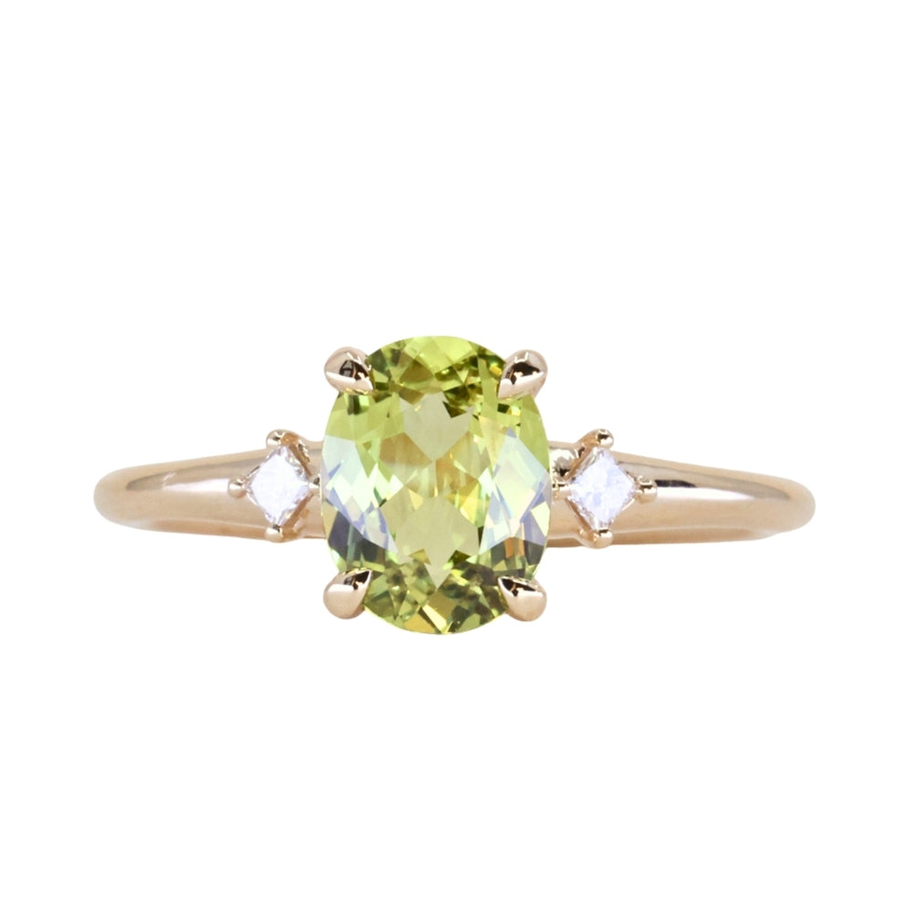 Brand *NEW* low profile, diamond-accented style for our minimalists! The "Rapids" ring features two natural princess cut diamonds set compass-style in a smooth, contoured band, and a four prong low profile-set center stone, in this case a 1.31ct untreated lemon-lime hued Australian oval sapphirein 14k. yellow gold. This style stacks best with curved bands if you are creating a ring stack.