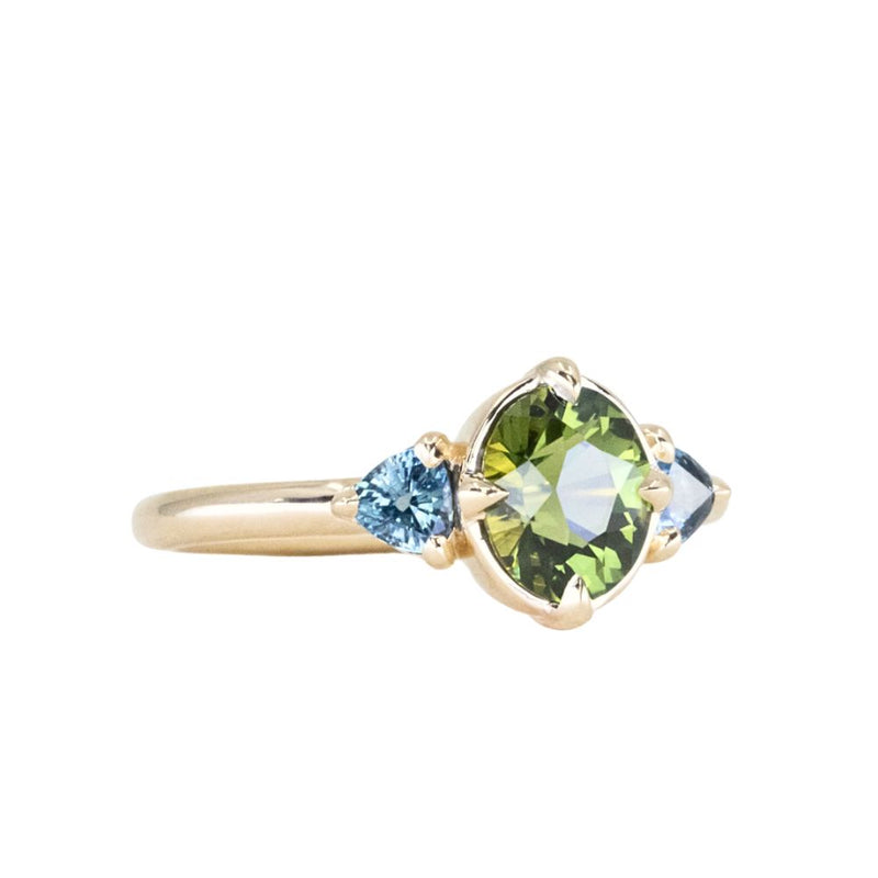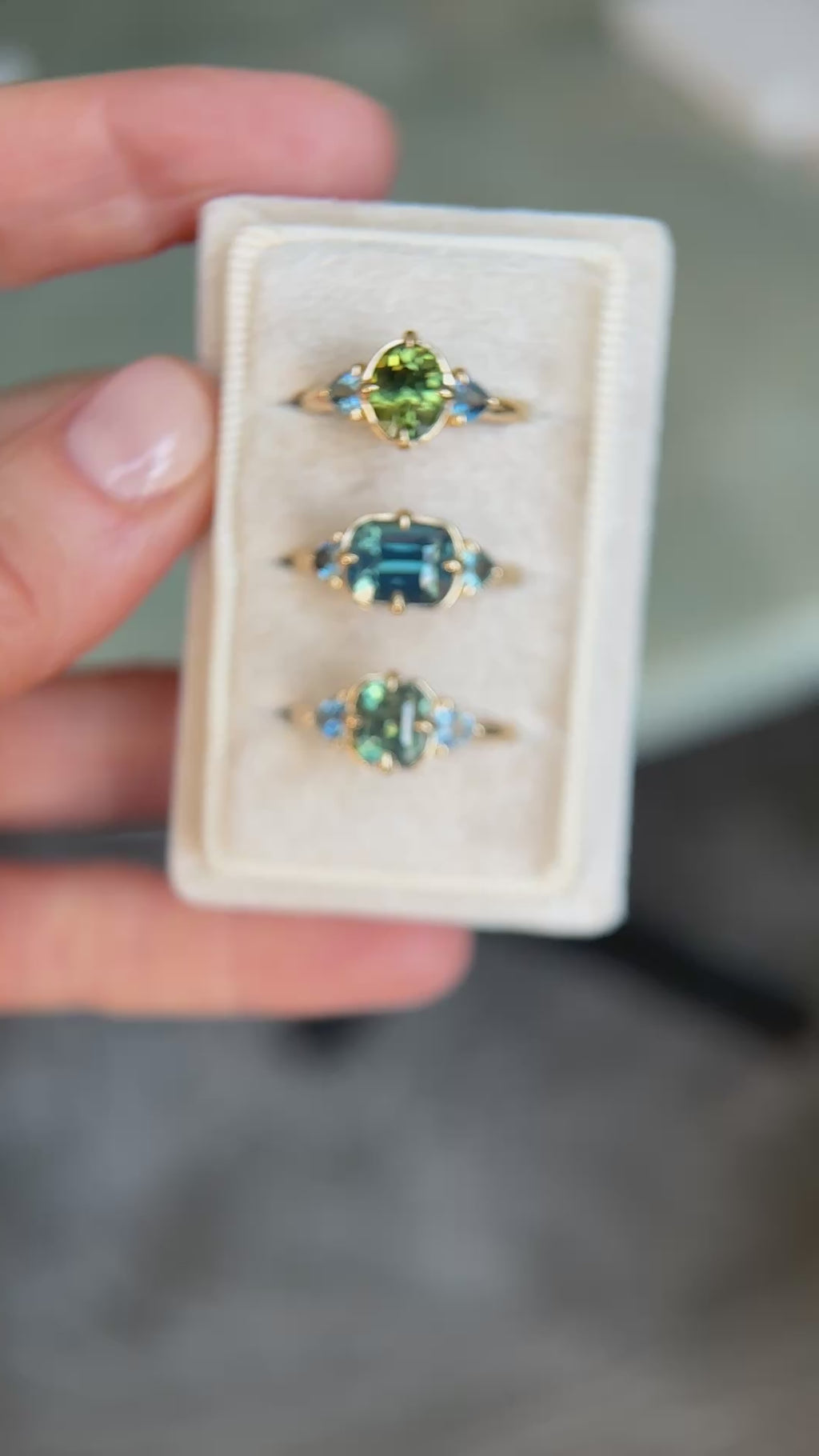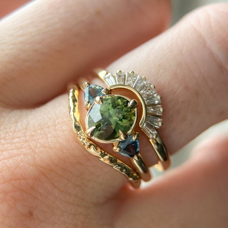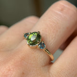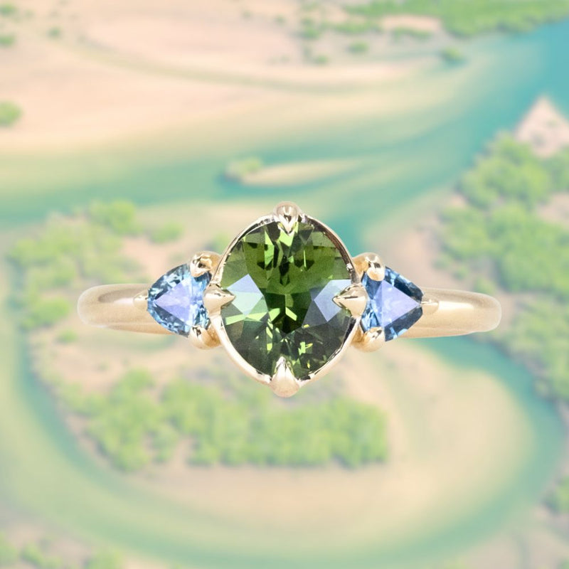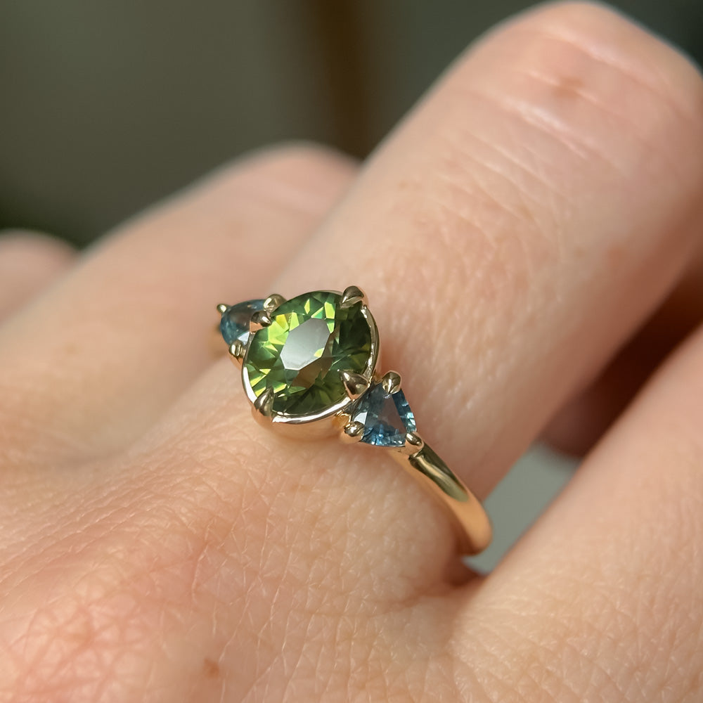 Antique-inspired and low profile sapphire ring, featuring blue and green sapphires, the center being a brilliant oval green Madagascar sapphire.
