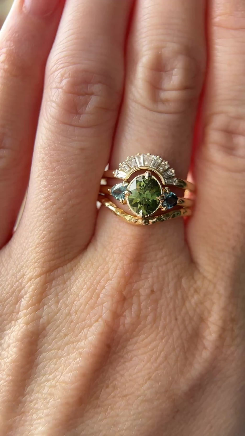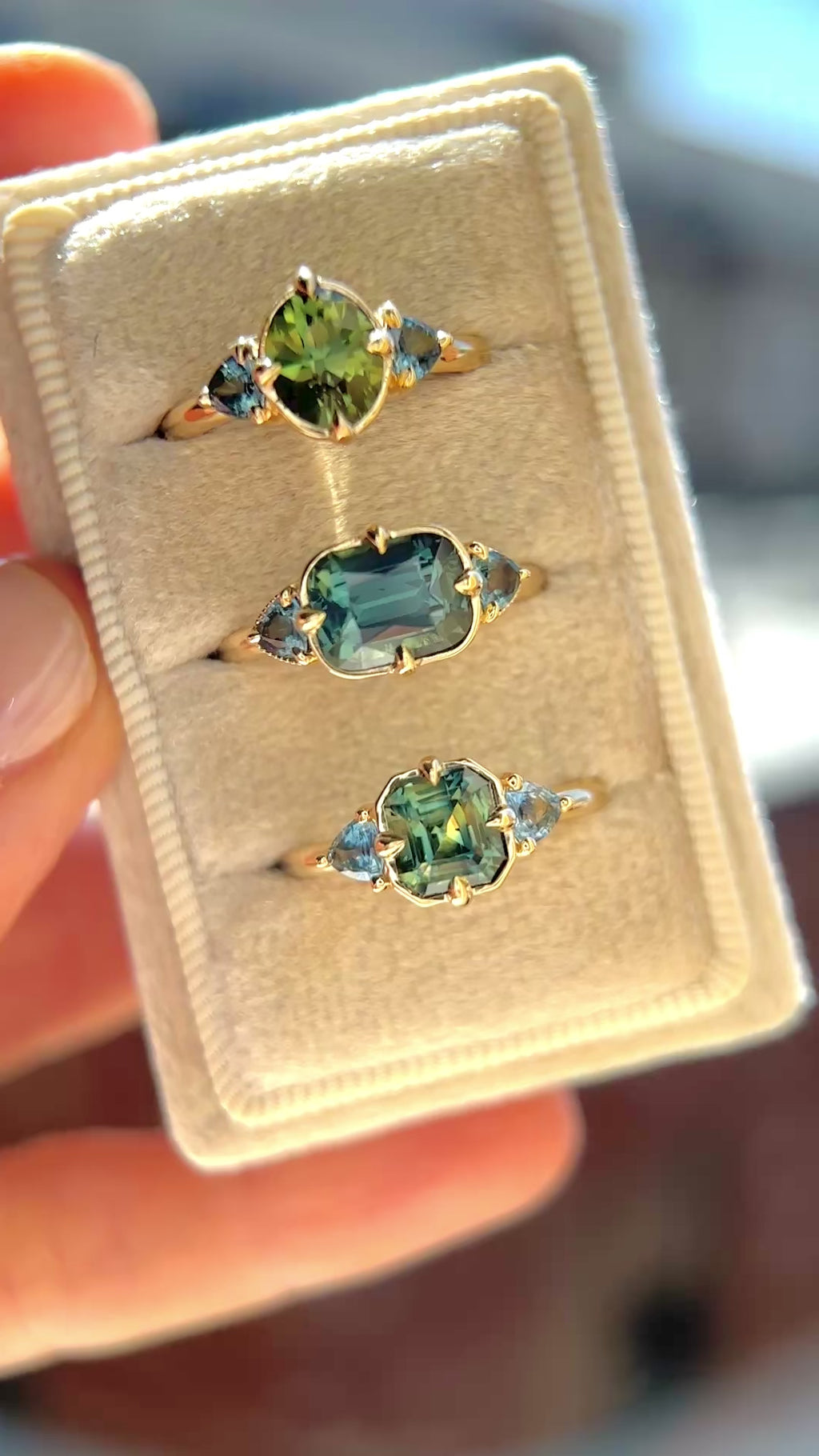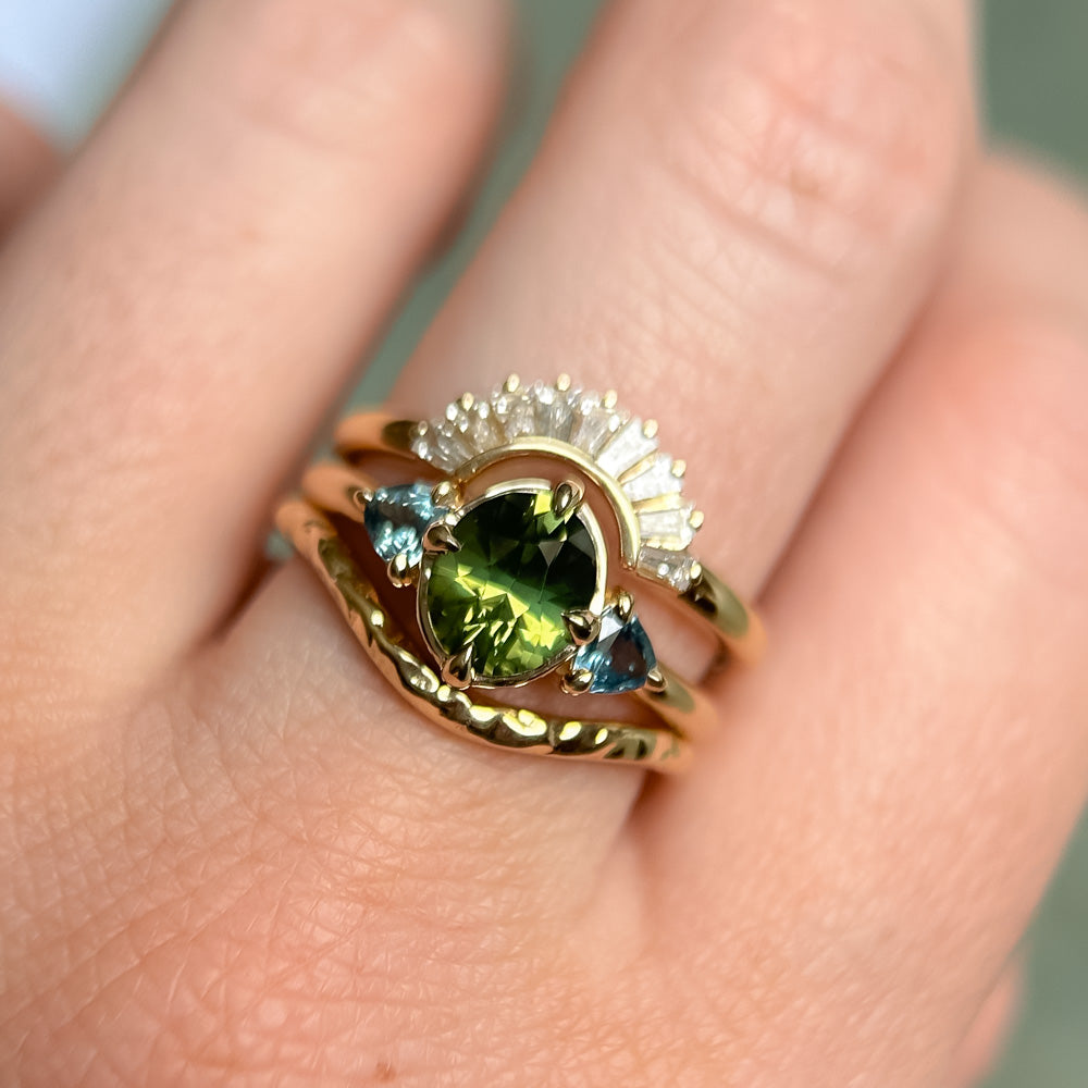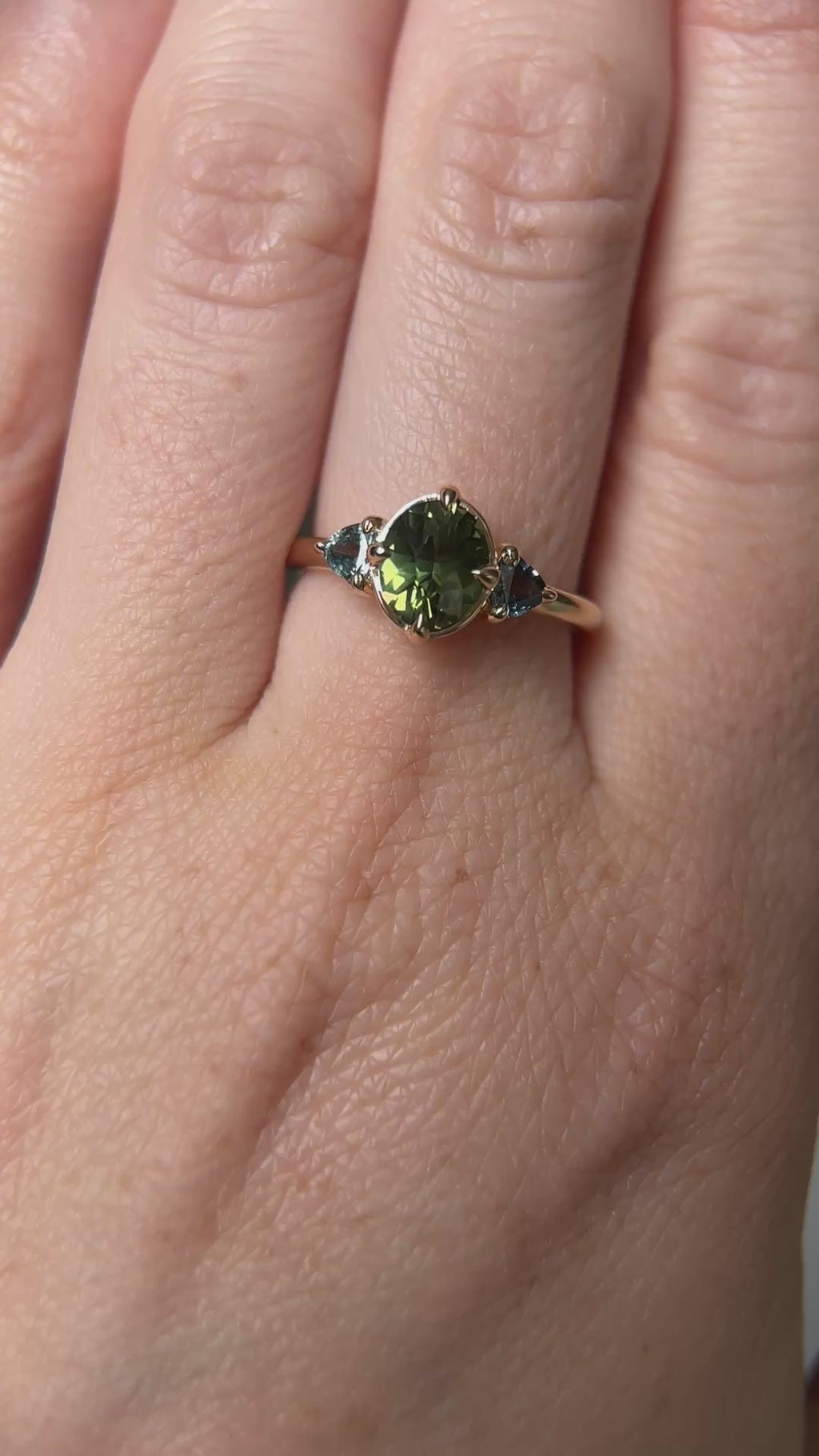 Antique-inspired and low profile sapphire ring, featuring blue and green sapphires, the center being a brilliant oval green Madagascar sapphire.