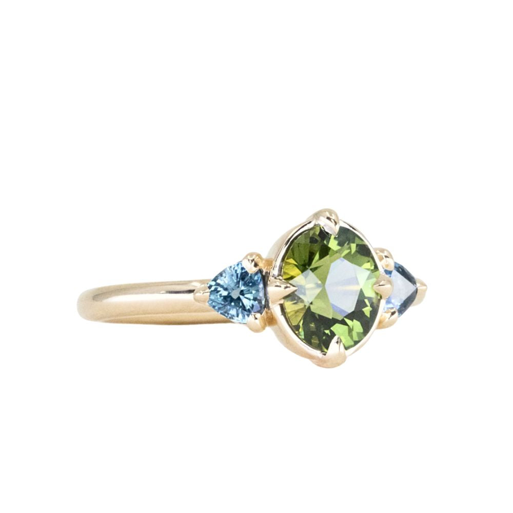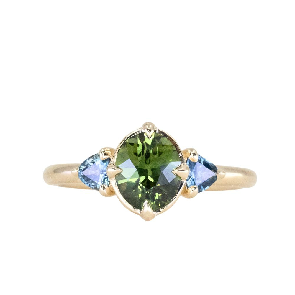1.41ct Oval Green Madagascar Sapphire and Trillion Sapphire Antique Compass Set Low Profile Ring in 14k Yellow Gold