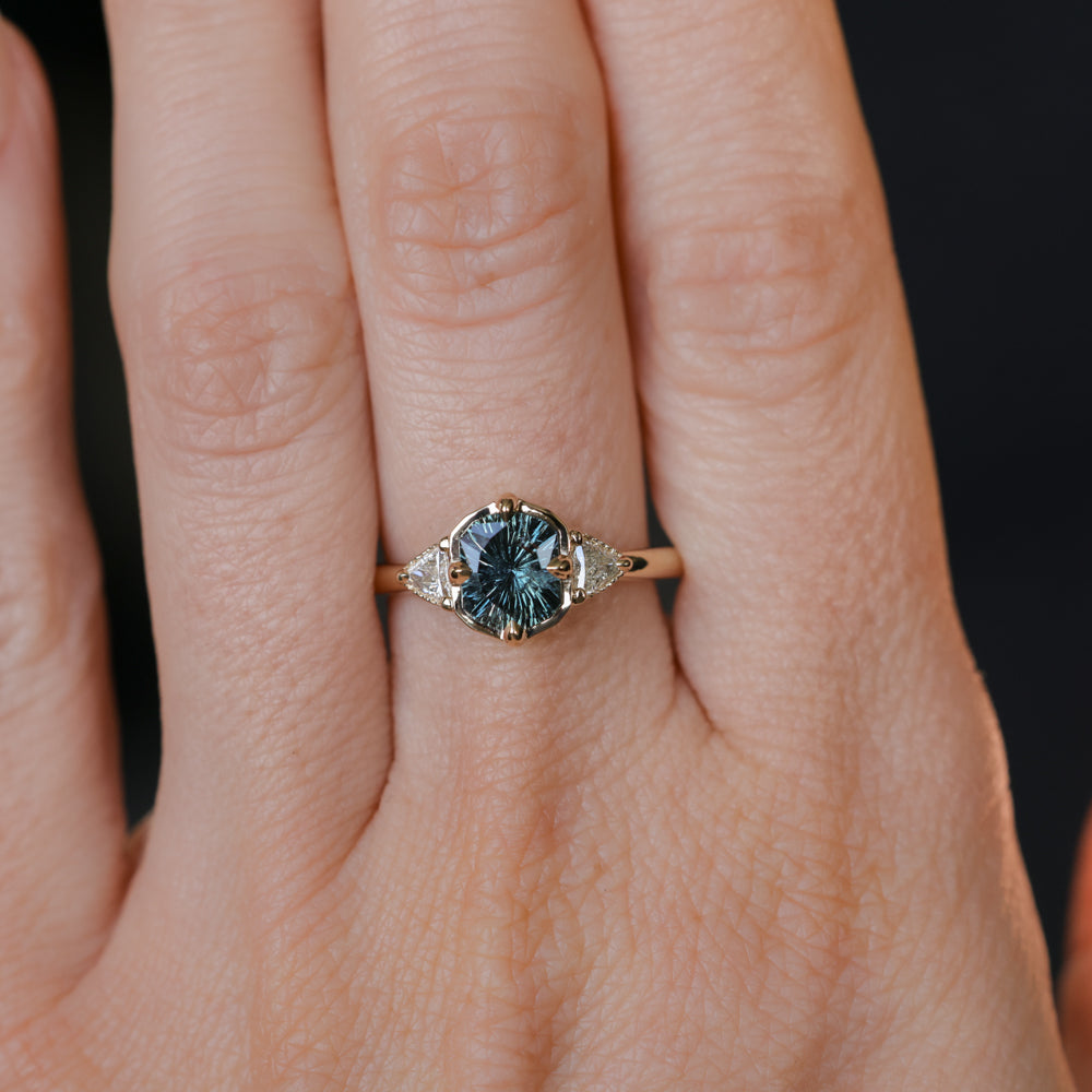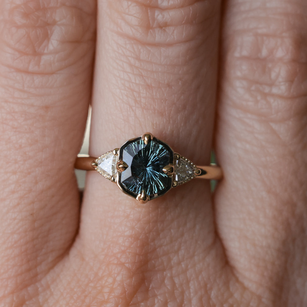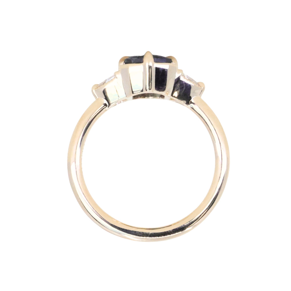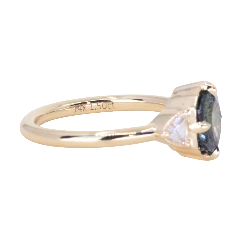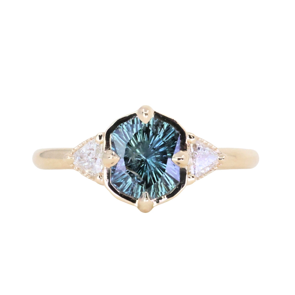 We've set this specialty cut, untreated color shifting Tanzanian sapphire in our low profile antique style compass set three stone design in 14k yellow gold.