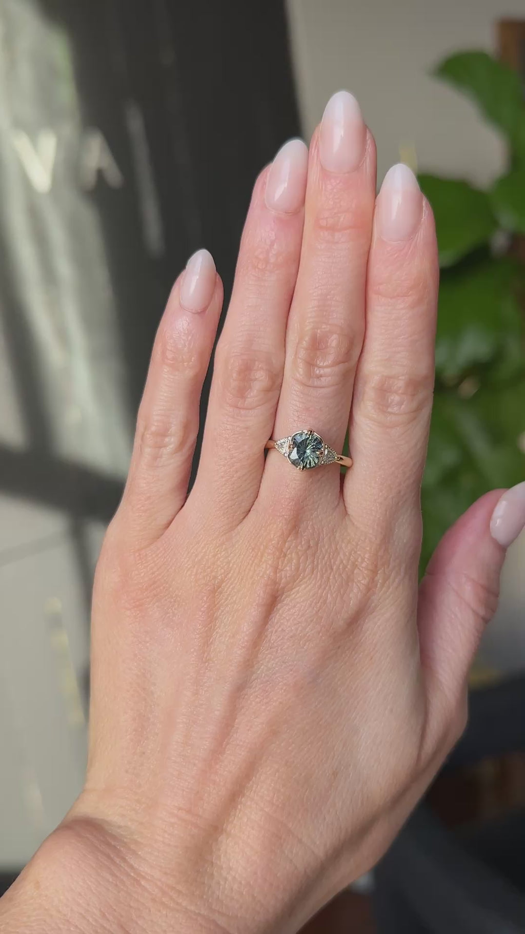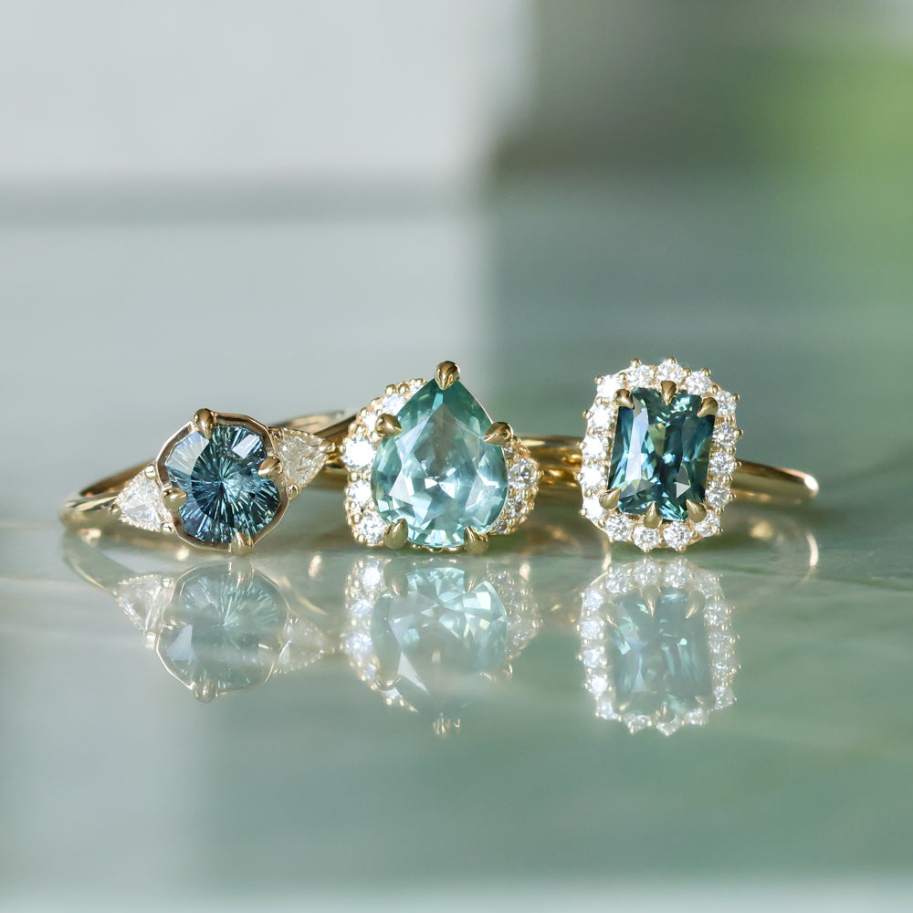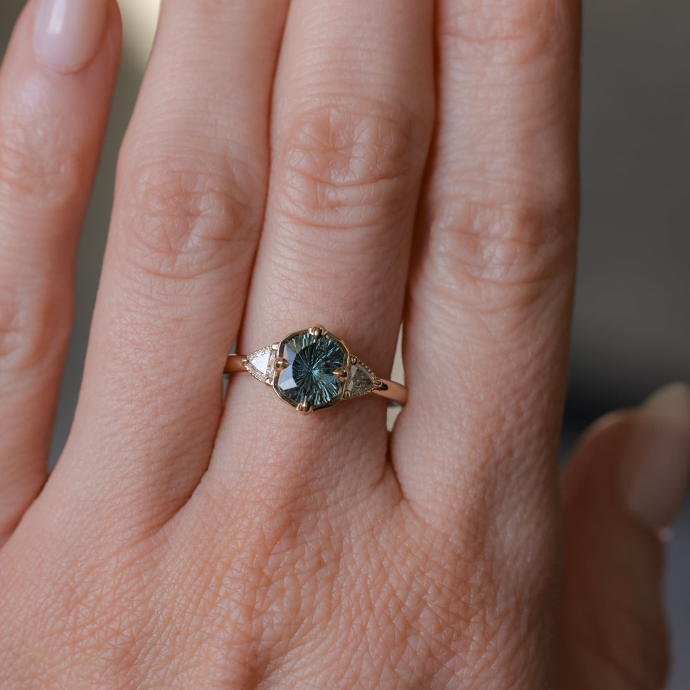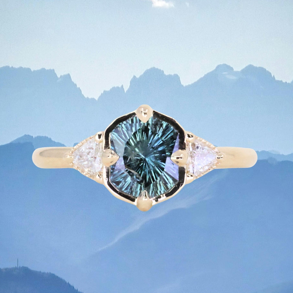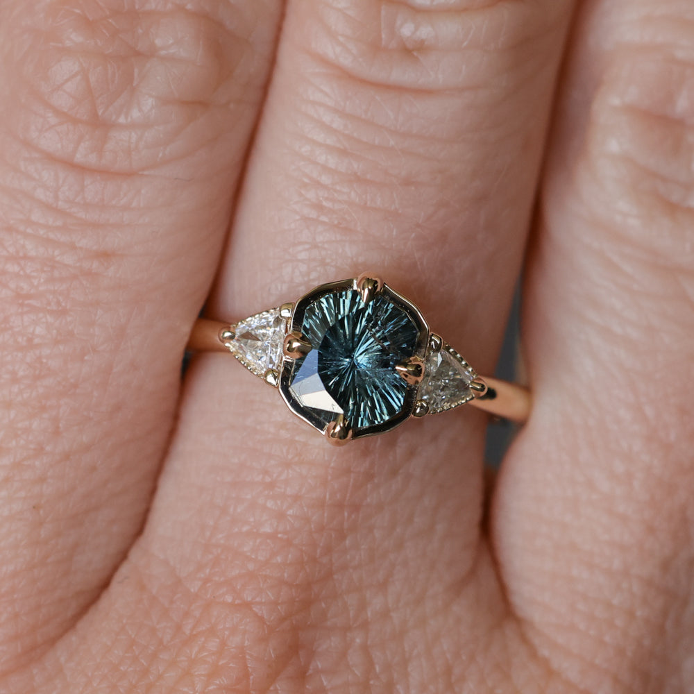 We've set this specialty cut, untreated color shifting Tanzanian sapphire in our low profile antique style compass set three stone design in 14k yellow gold.