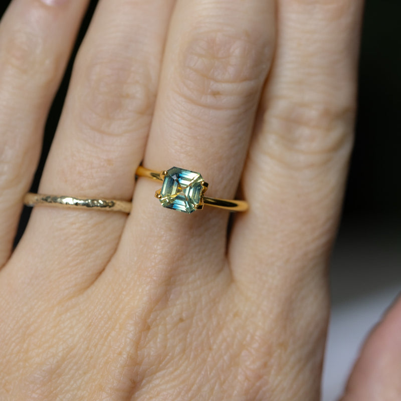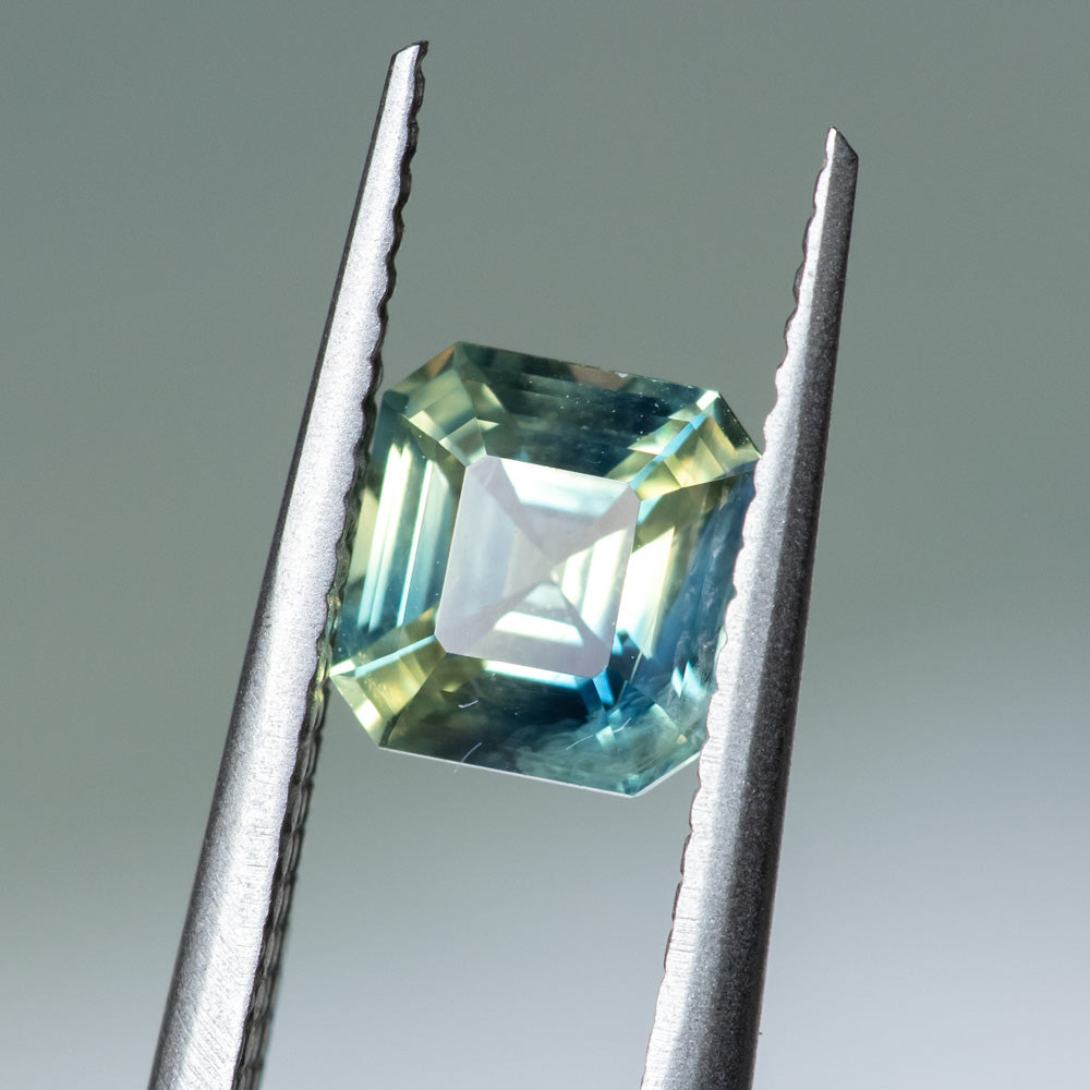 1.53CT RADIANT CUT MADAGASCAR SAPPHIRE, PARTI TEAL GREEN YELLOW, 6.28X5.92X3.89MM. Very cool segments of color in this "parti" sapphire! Like nature's work of art! Very clean and sparkling step cut. This sapphire is heated, a permanent treatment for color and clarity.