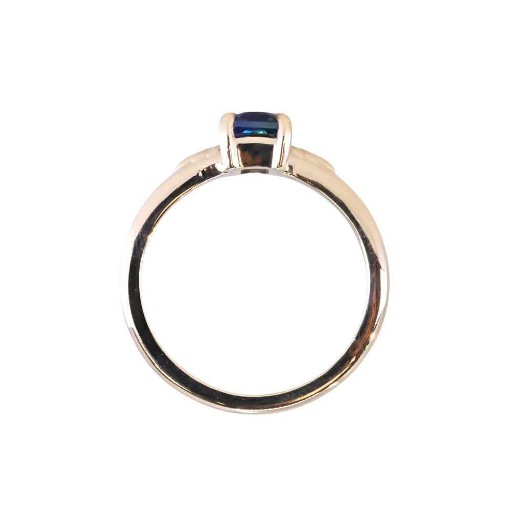Brand new low profile solitaire setting with subtle, leafy Spring Blooms. We've set an untreated Madagascar Emerald Cut Parti Sapphire weighting 1.53ct in this four prong solitaire in 14k yellow gold.