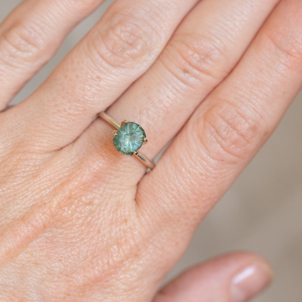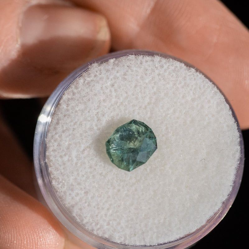 1.56CT FANCY ELONGATED CUSHION MONTANA SAPPHIRE, TEAL GREEN, 7.3X6.3X4.6MM. This sapphire was mined in Rock Creek, Montana, USA! Visibly included/silky with swirling patterns, which is common for sapphires from the area. Will darken indoors. This sapphire is heated, a permanent treatment for color and clarity. Precision cut for sparkle and glows in indirect sunlight!
