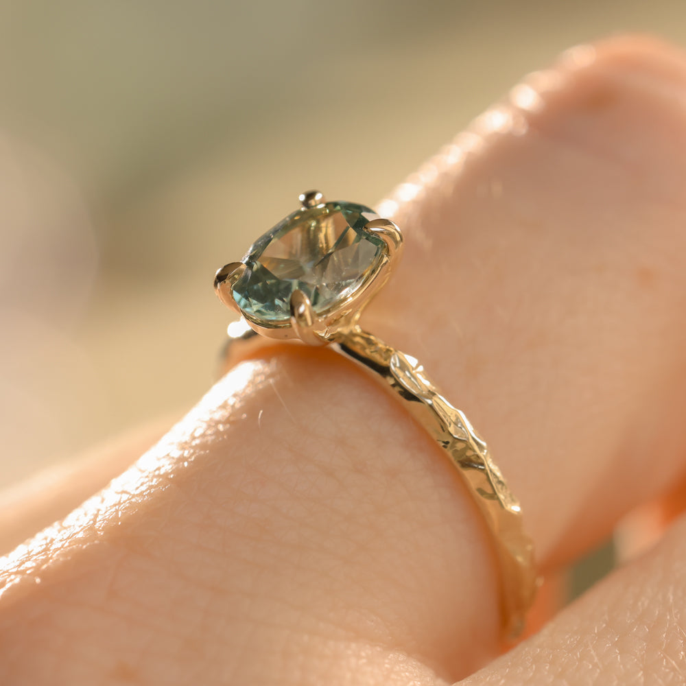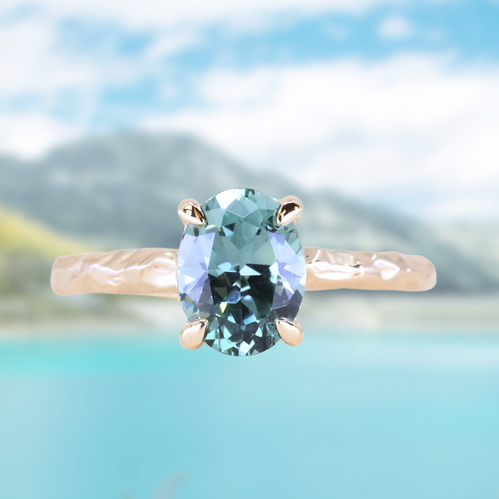Ocean blue, petite Montana sapphire in an oval brilliant design, set in an Evergreen 4 prong solitaire.