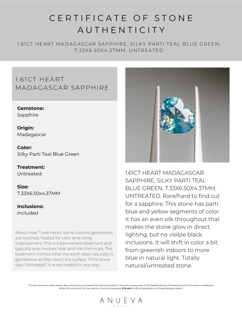 1.61CT HEART MADAGASCAR SAPPHIRE, SILKY PARTI TEAL BLUE GREEN, 7.33X6.50X4.37MM, UNTREATED. Rare/hard to find cut for a sapphire. This stone has parti blue and yellow segments of color. It has an even silk throughout that makes the stone glow in direct lighting, but no visible black inclusions. It will shift in color a bit from greenish indoors to more blue in natural light. Totally natural/untreated stone.