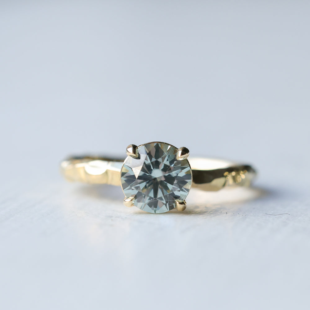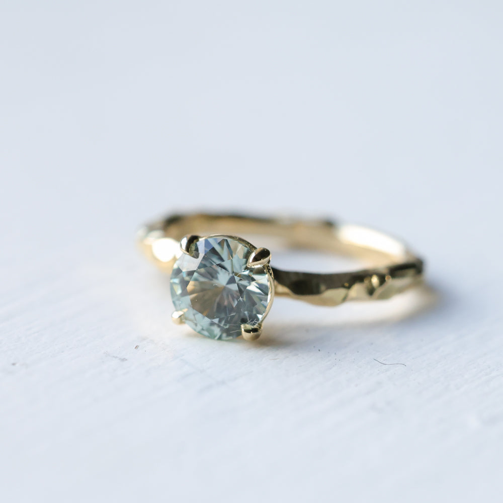 Enjoy your own Montana sapphire ring, set in recycled 18k yellow gold and made in the Pacific Northwest. We've set a stunning, precision cut round 1.64ct untreated Montana sapphire in this popular and earthy design.