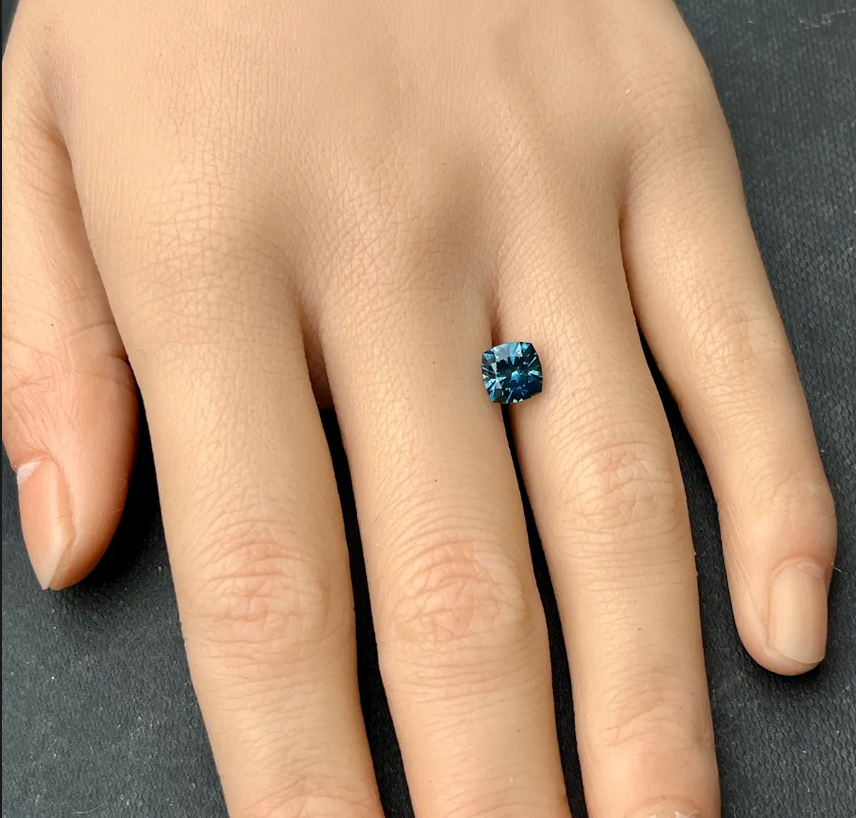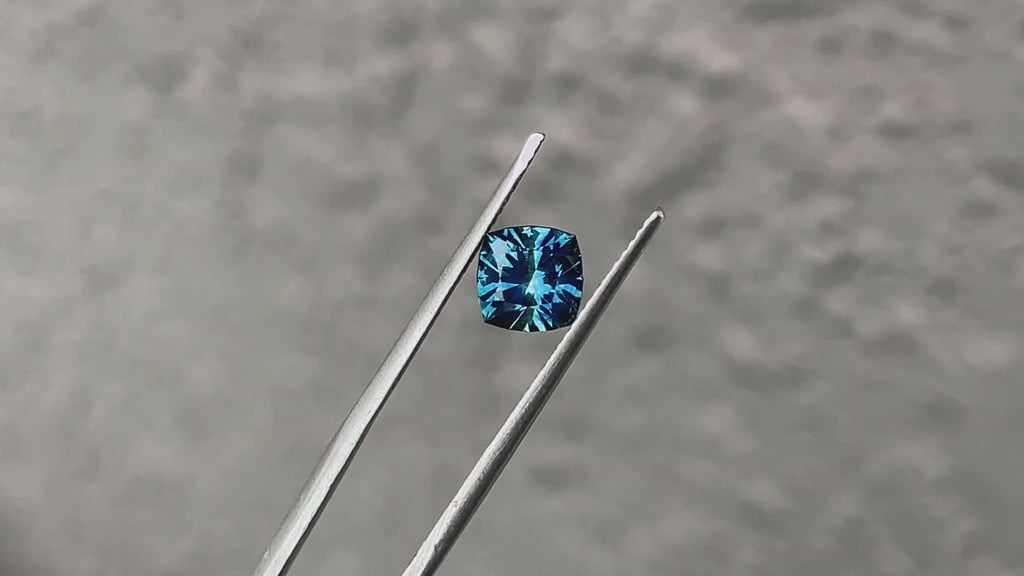 1.68CT PRECISION CUT CUSHION BRILLIANT MONTANA SAPPHIRE, DEEP OCEAN BLUE, 6.5MM. A diamond-like precision "antique cushion" brilliant cut, eye-clean clarity. Mined and faceted in the USA. This sapphire has been heated, a permanent treatment for color and clarity. Gorgeous teal blue with parti coloring to yellow inside, will shift in color from more teal to more traditional blue, depending on the light available.