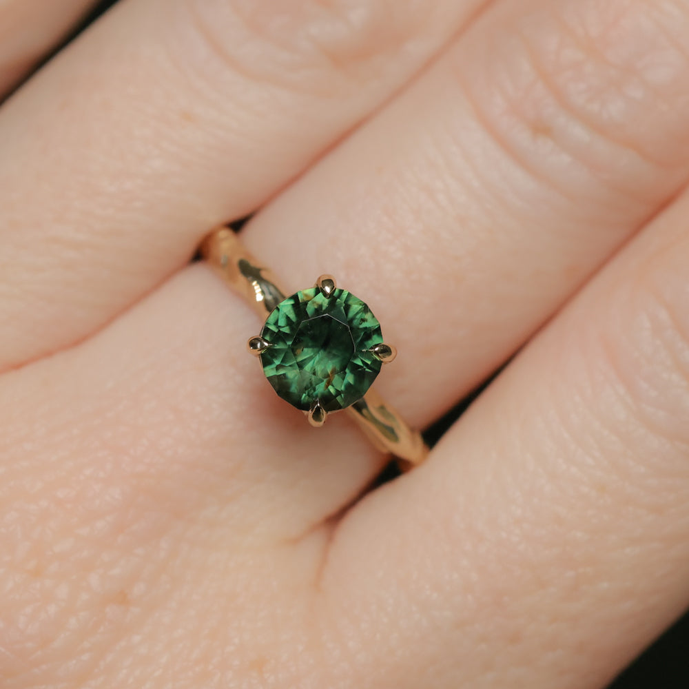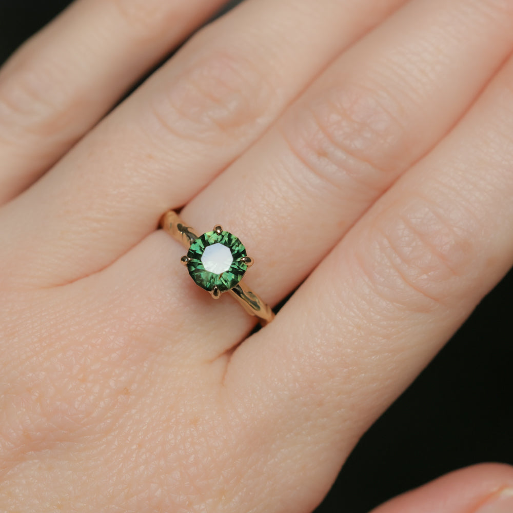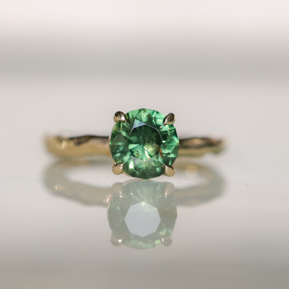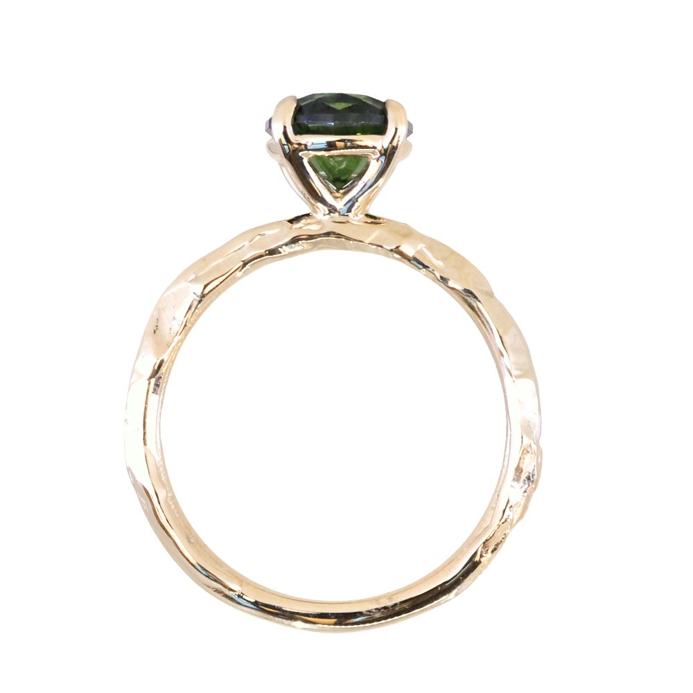 Earthy and weighty hand carved Evergreen four prong solitaire featuring a deep green 1.72 ct round fancy brilliant cut sapphire. Classic, stackable style in our hand carved Evergreen texture.