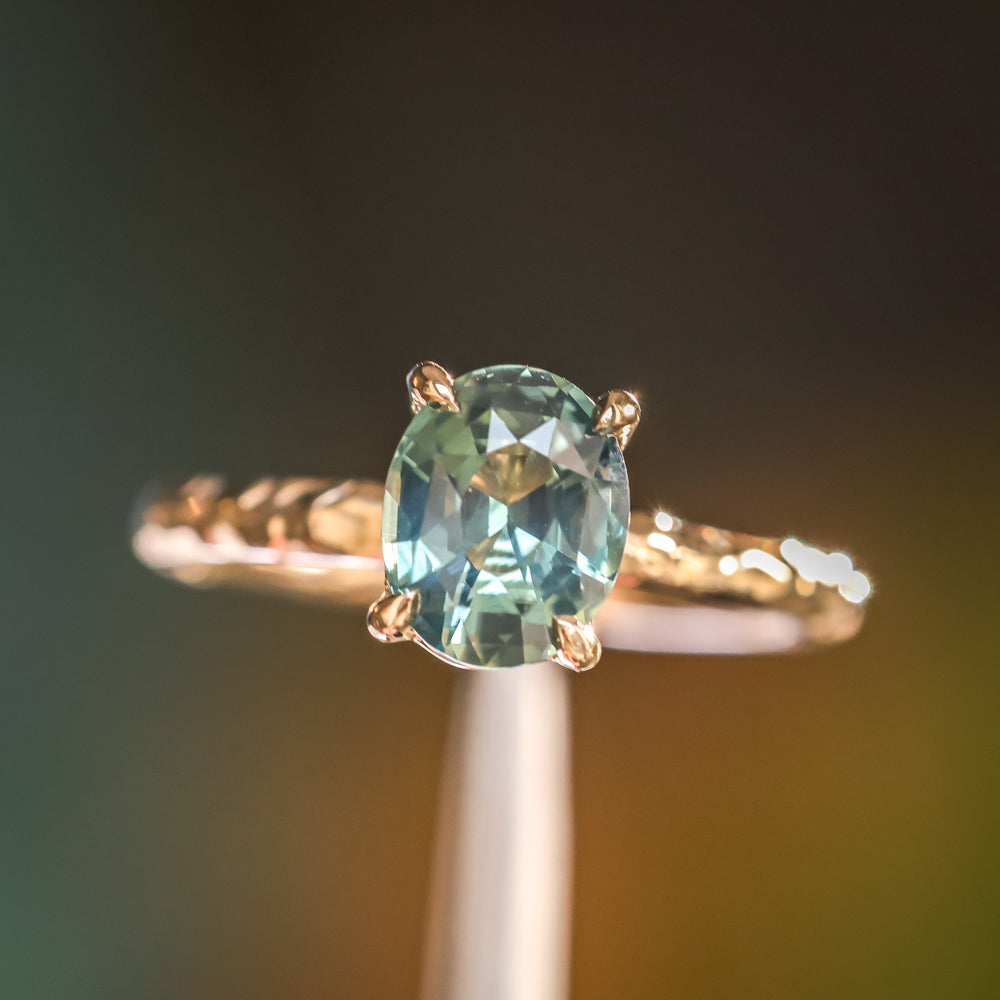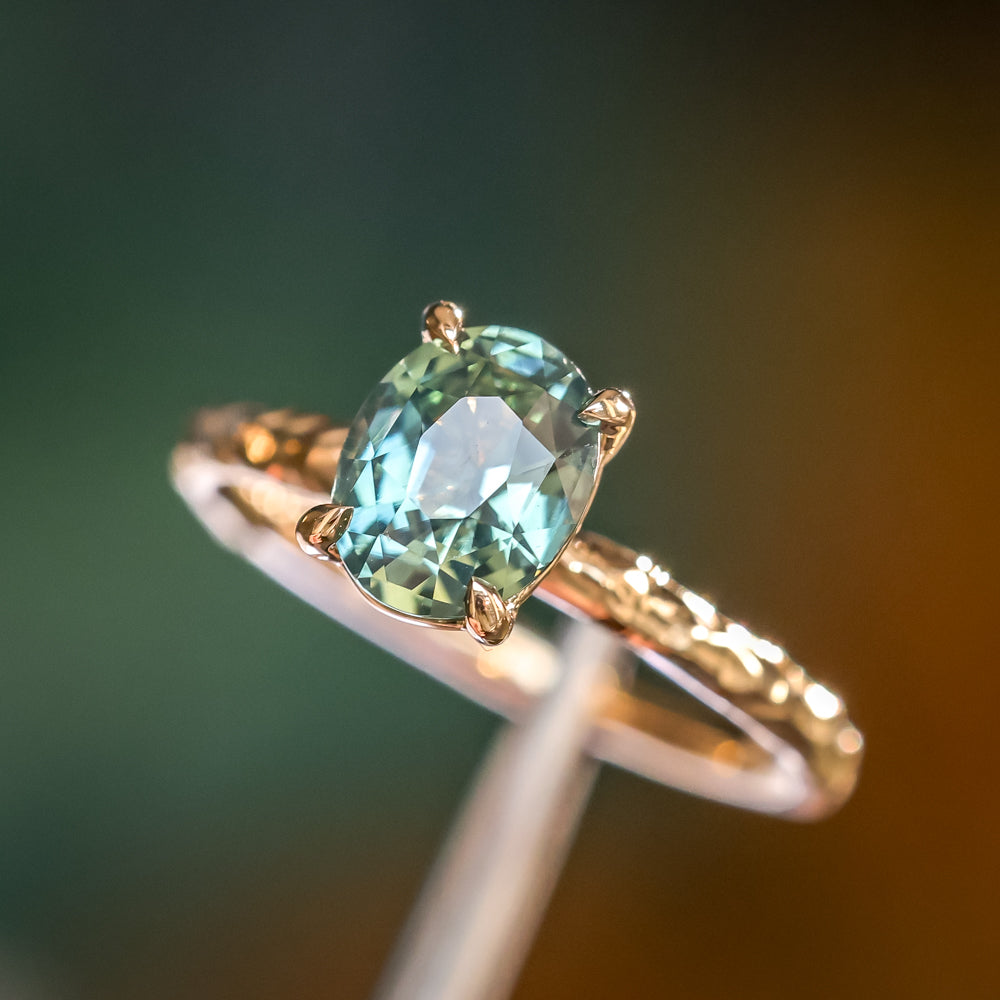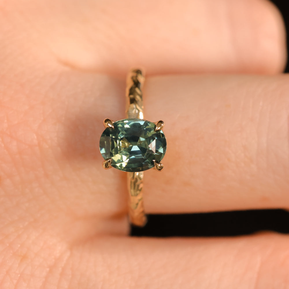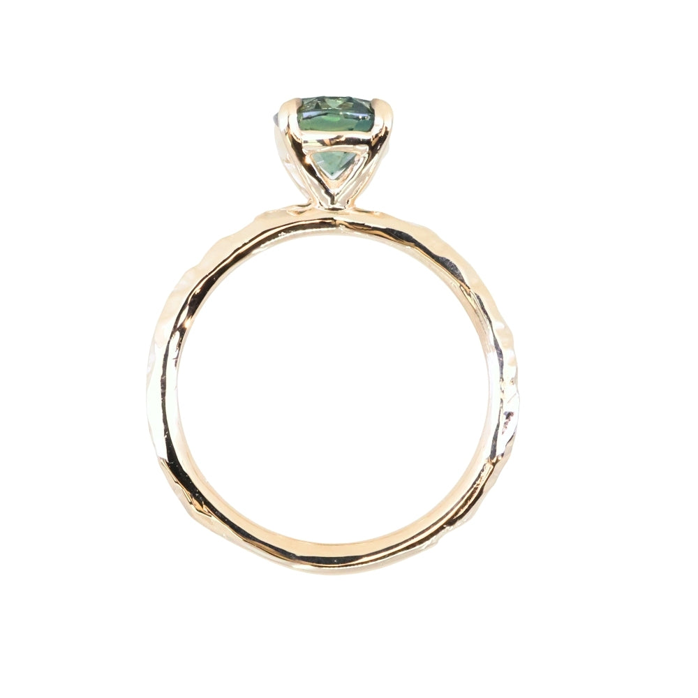 Earthy, hand carved Evergreen four prong solitaire featuring an untreated 1.74ct Madagascar sapphire. Classic, stackable style in our hand carved Evergreen texture.