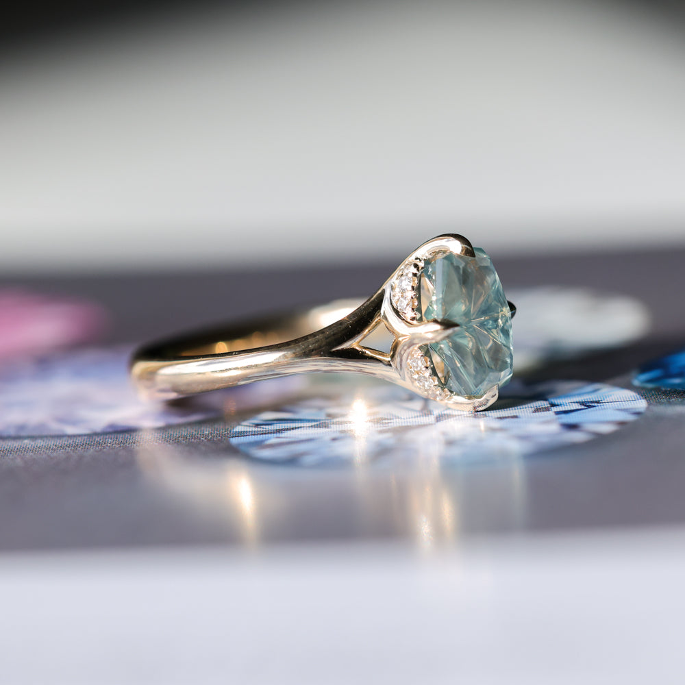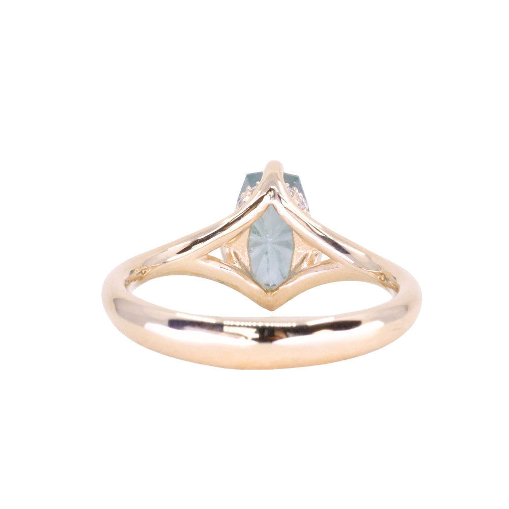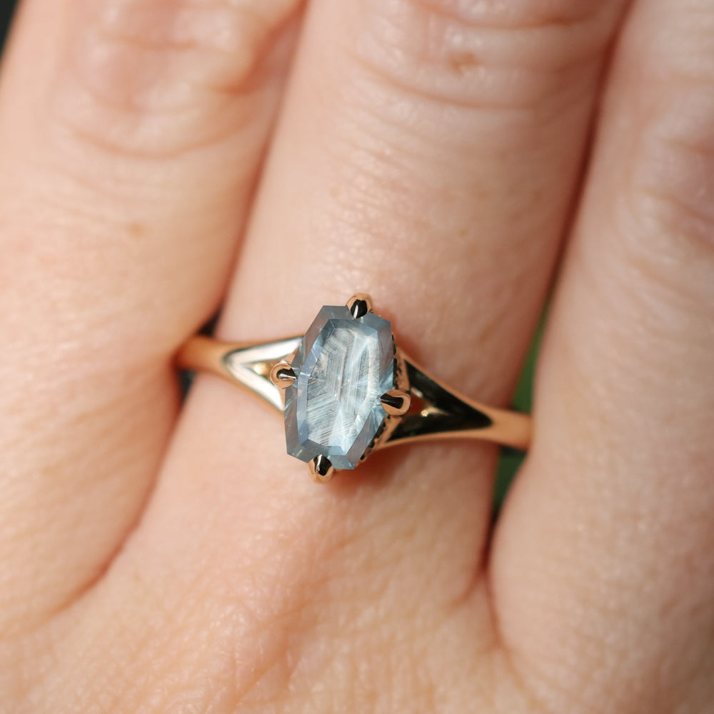Specialty cut "fantasy" Montana sapphire with light silk and a unique hidden halo setting. This ring is cast in 14k recycled yellow gold and sits low to the hand. It would stack best with curved or pointed bands!