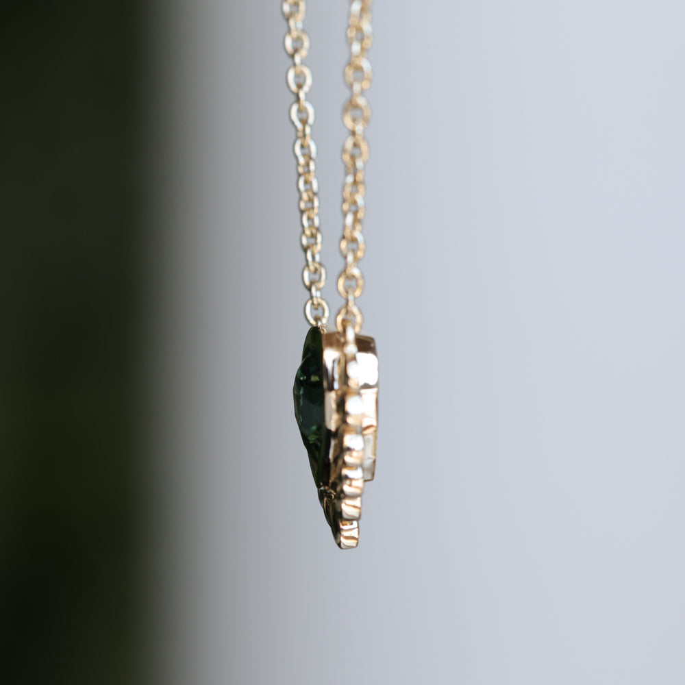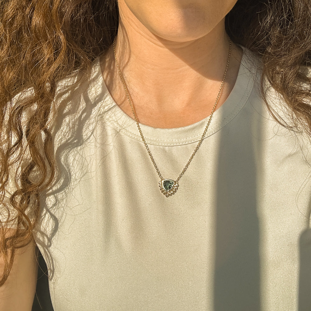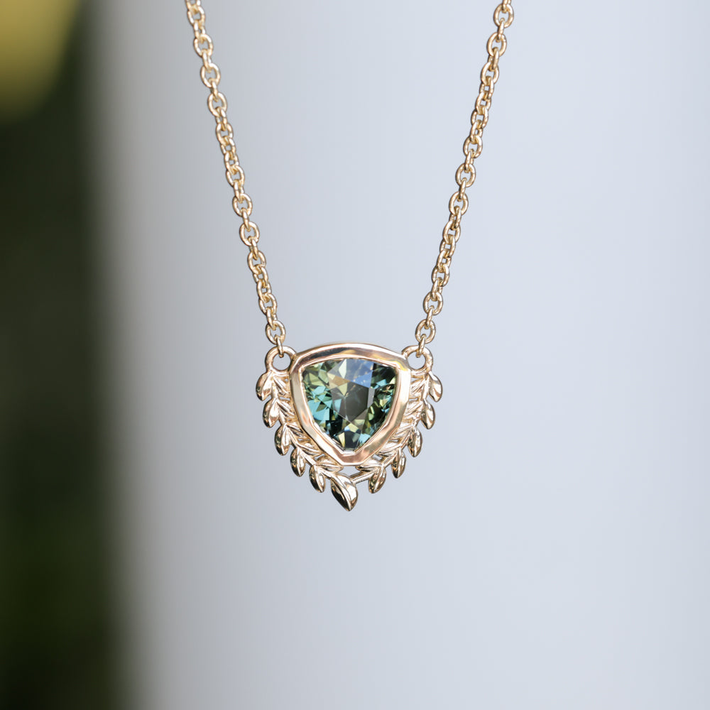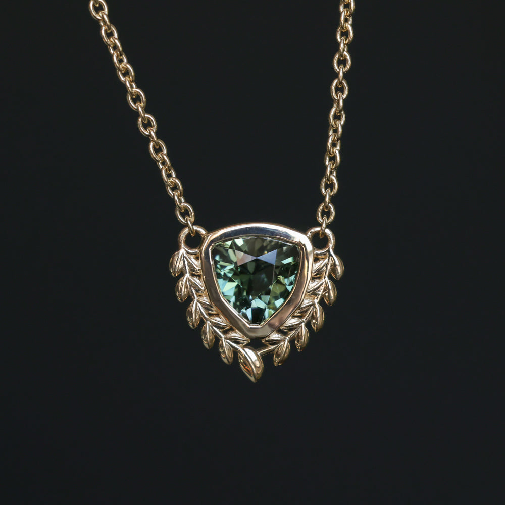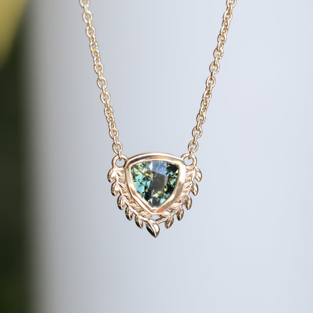 1.87ct ANZA Green Trillion Untreated Tanzanian Sapphire Vine Frame Necklace in 14k Yellow Gold