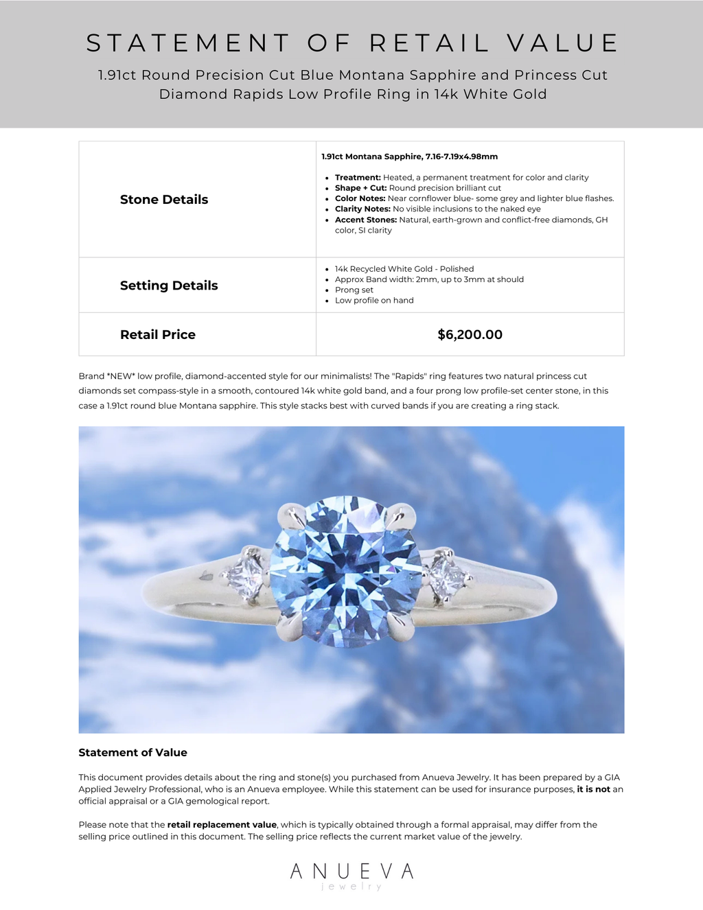 Rings will ship in an Anueva Jewelry ring box, with the exception of most bands which will ship in a ring pouch. The package will be insured and require signature confirmation. Please be sure to use an address that will have someone available to sign during mail delivery times. If providing a business address, please include the business name.