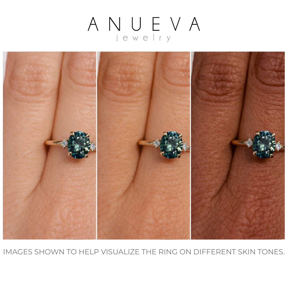 Brand *NEW* low profile, diamond-accented style for our minimalists! The "Rapids" ring features two natural princess cut diamonds set compass-style in a smooth, contoured band, and a four prong low profile-set center stone, in this case a 1.98ct oval precision cut teal Montana sapphire. This style stacks best with curved bands if you are creating a ring stack.