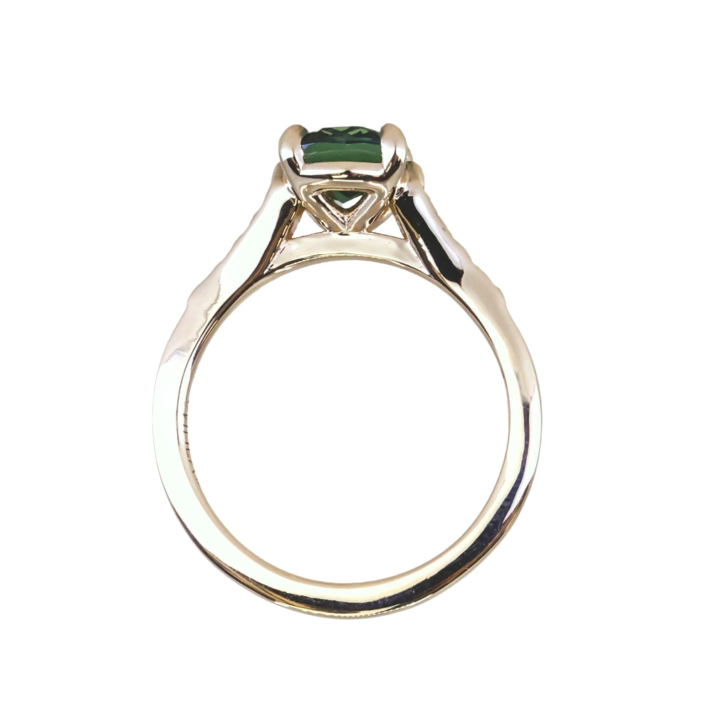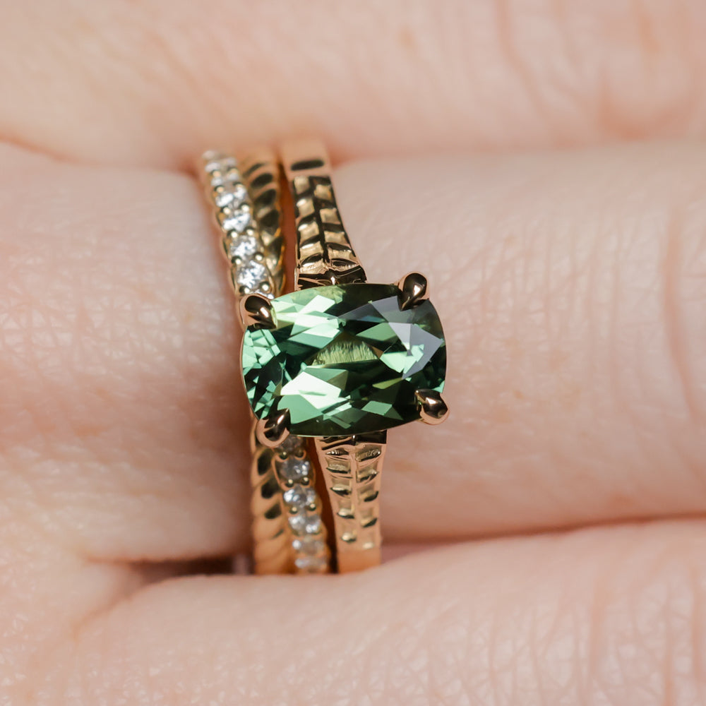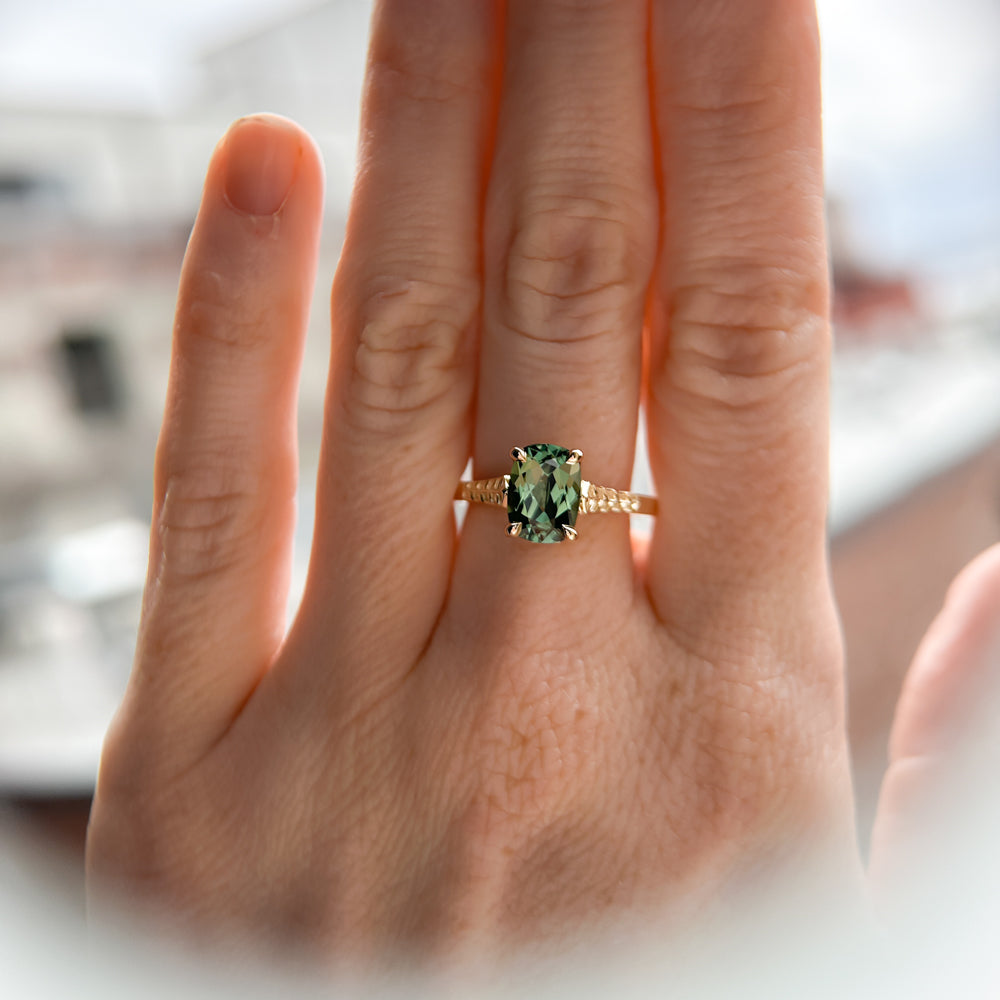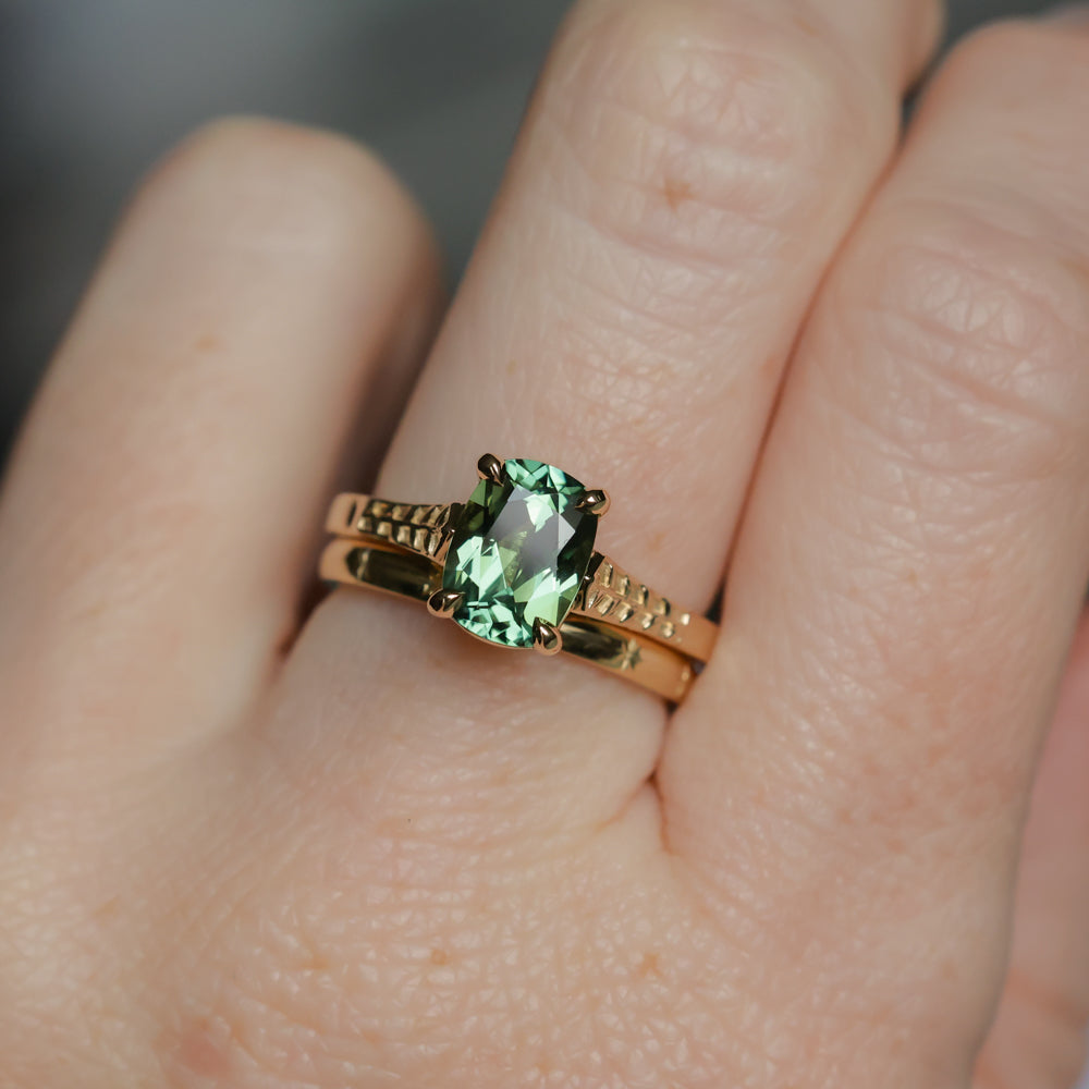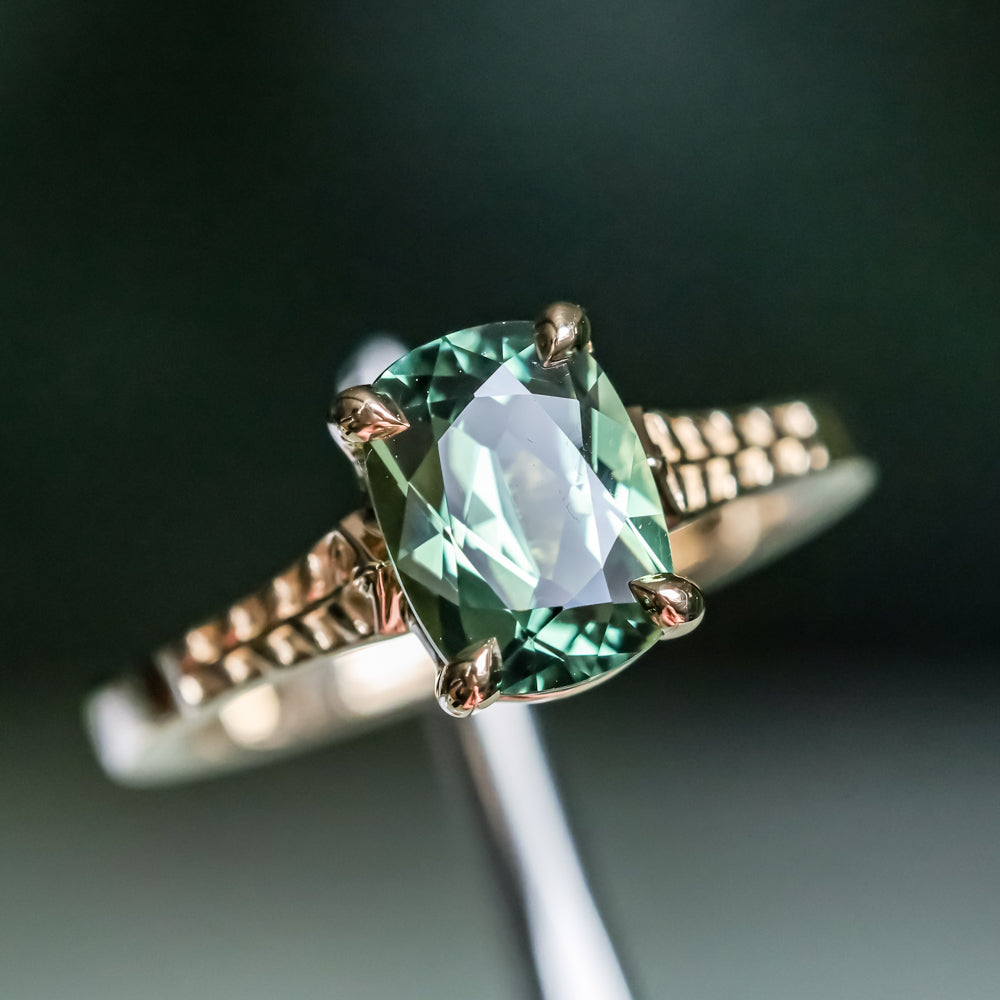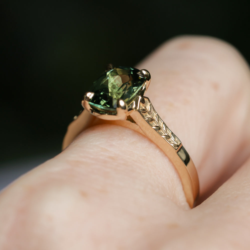 NEW STYLE! Our classic cathedral profile with tapered band and vine detailing on the shoulders. Would pair well with our vine bands! Our second ring in this style features a totally natural/untreated green and teal elongated cushion cut sapphire from Australia.