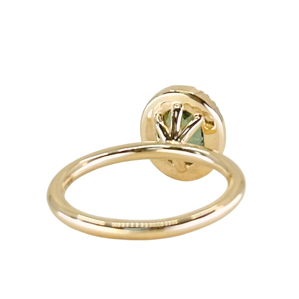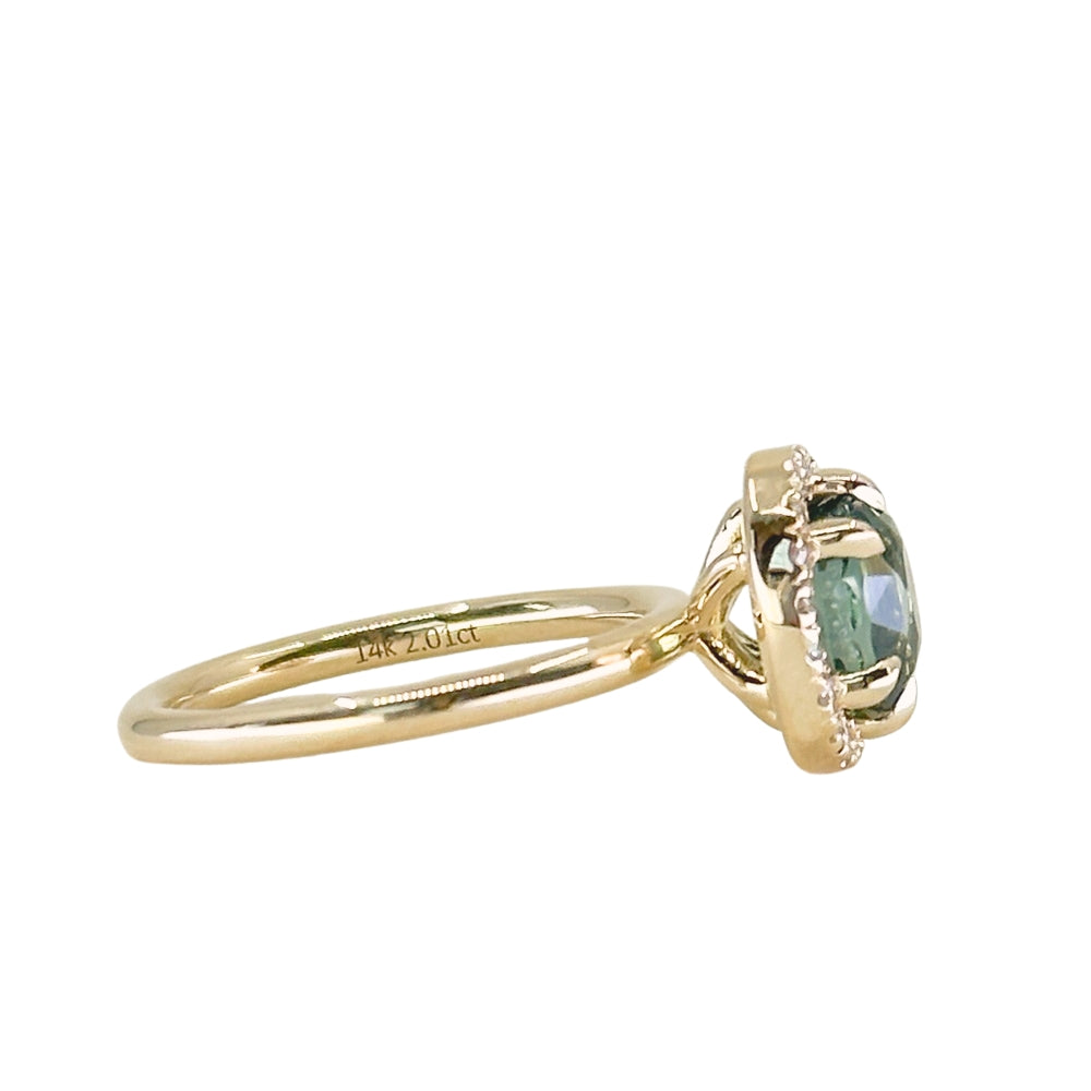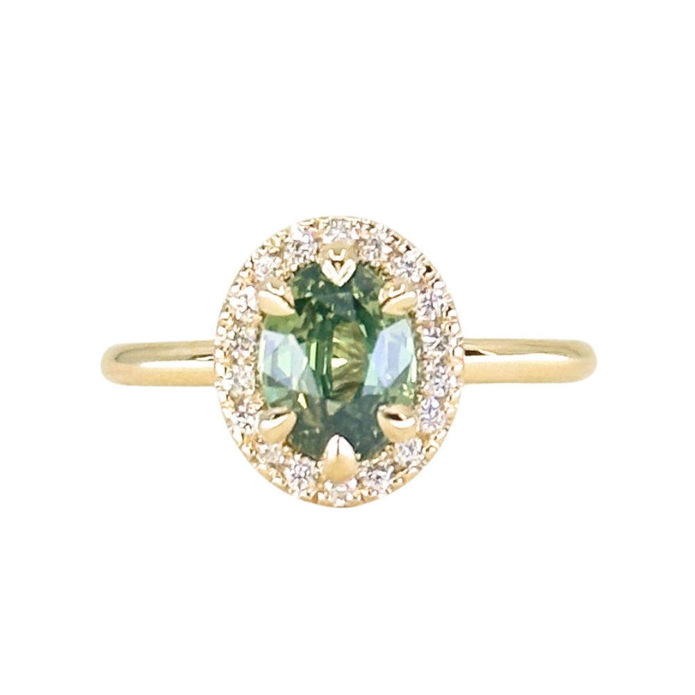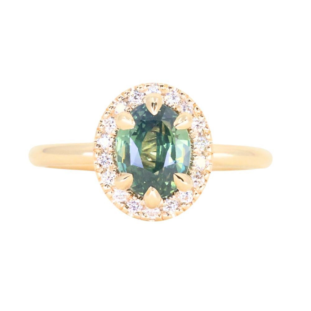 Soft teal green sapphire halo ring. This earth-mined stone glows from all angles and framed with antique-inspired six claw prongs. Made with recycled 14k yellow gold, this ring is also set with natural white diamonds for an extra touch of elegance and is stackable with bands of a similar thickness.