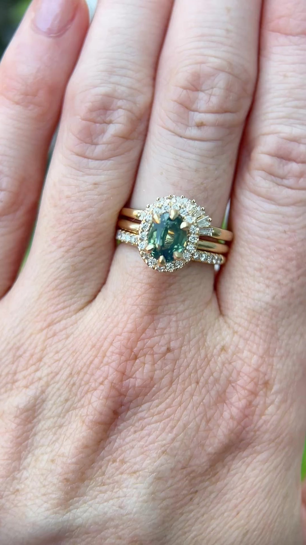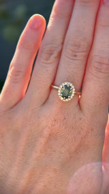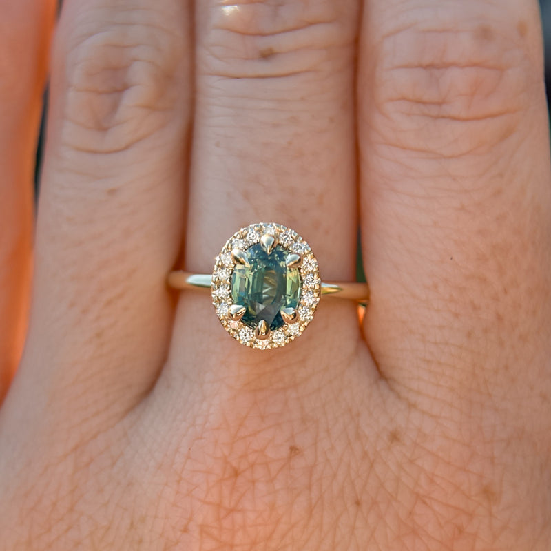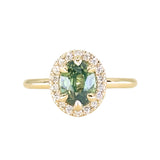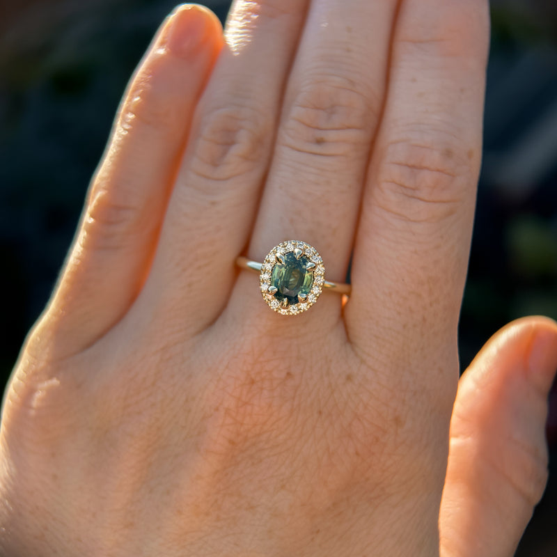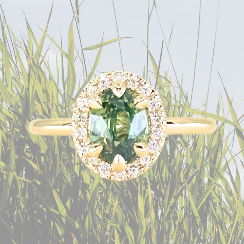 Soft teal green sapphire halo ring. This earth-mined stone glows from all angles and framed with antique-inspired six claw prongs. Made with recycled 14k yellow gold, this ring is also set with natural white diamonds for an extra touch of elegance and is stackable with bands of a similar thickness.