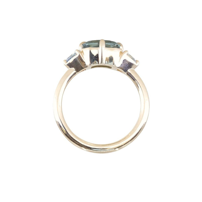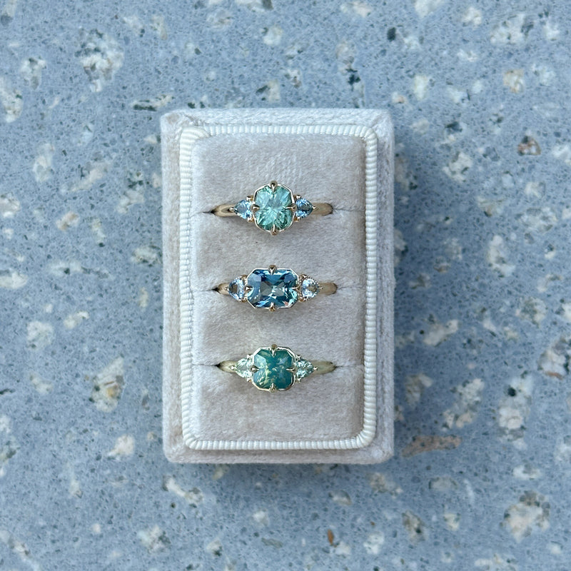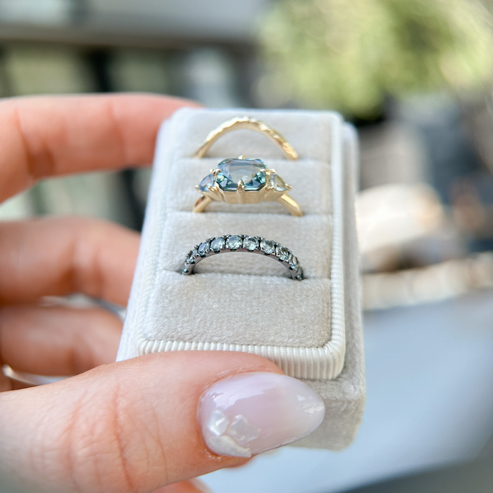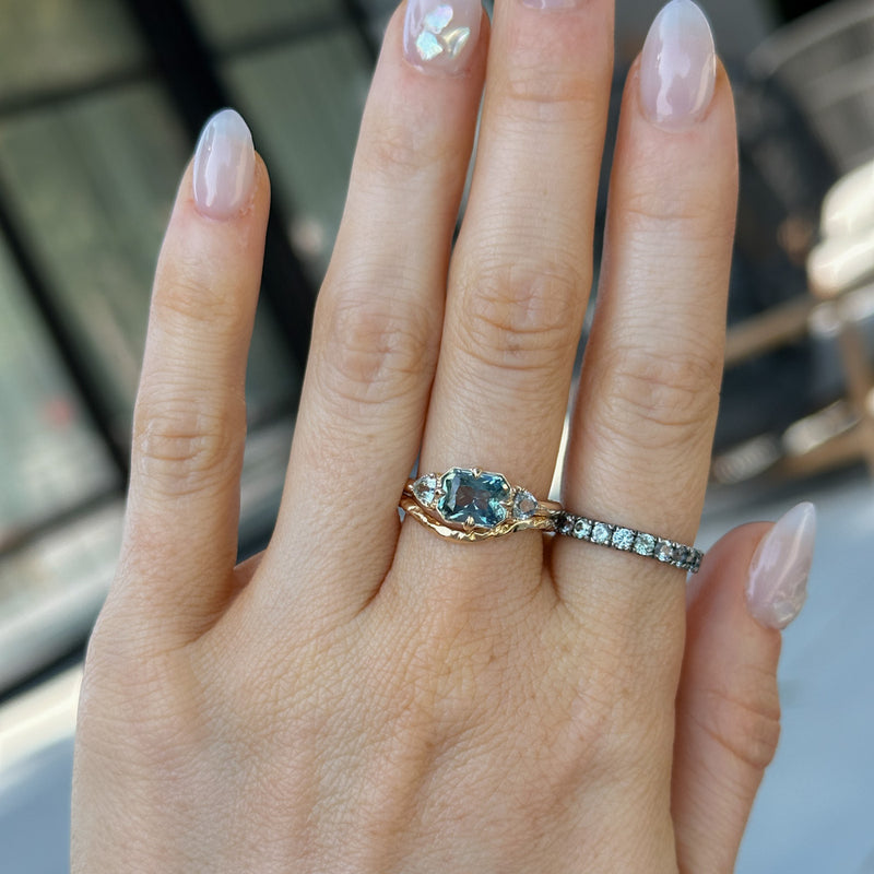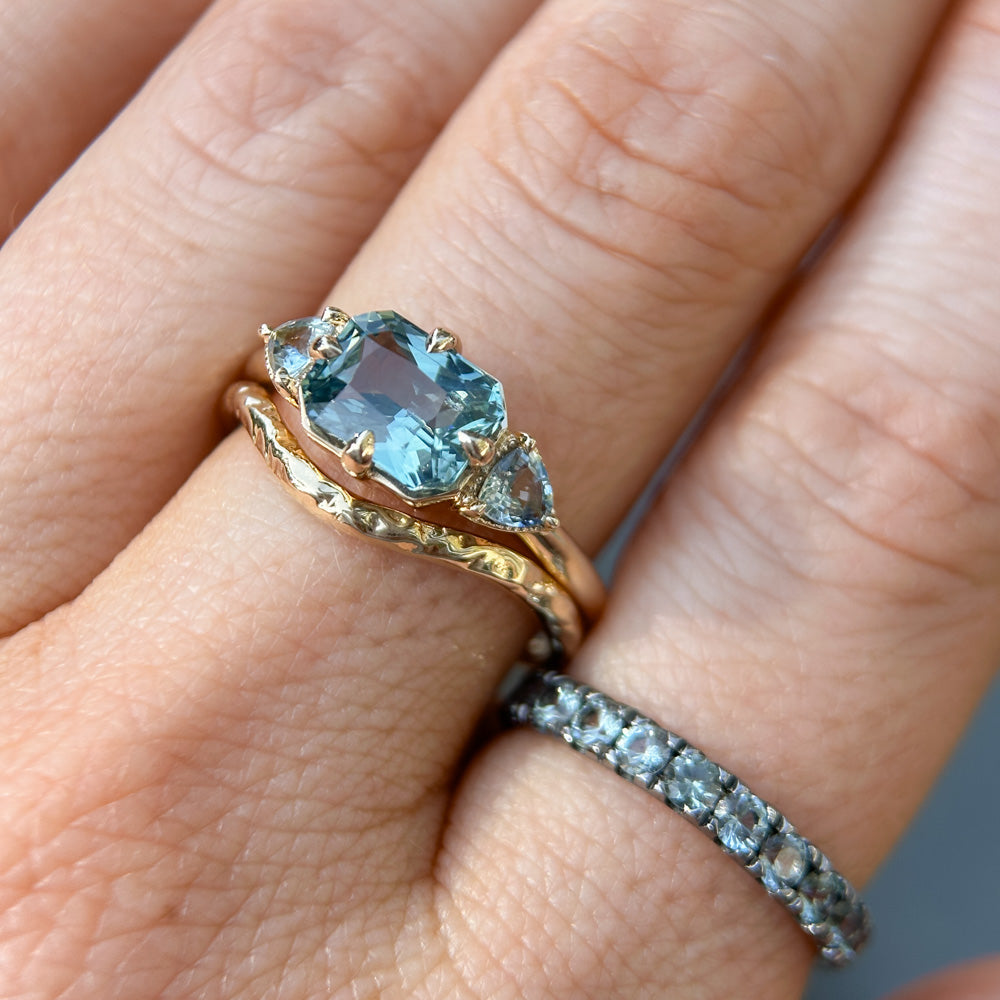 Antique-inspired and low profile sapphire ring with hand applied milgrain, featuring natural blue sapphires, the center being a gorgeous glowing blue-grey radiant cut, untreated Madagascar radiant cut.