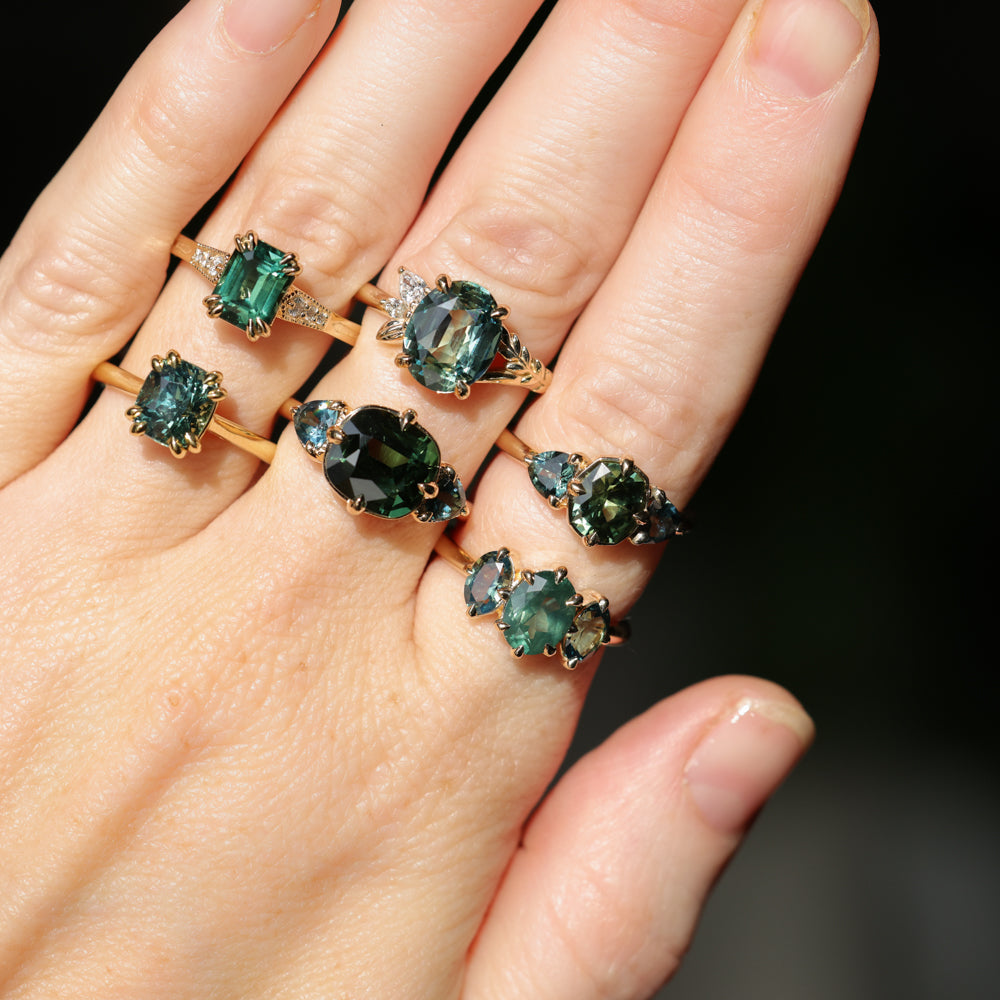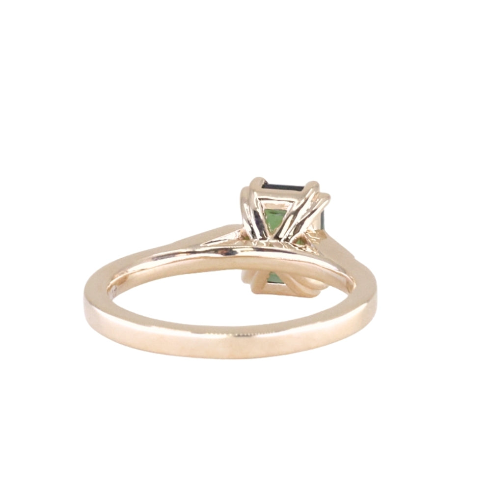 2.11ct Emerald Cut Teal Green Madagascar Sapphire and Diamond Vintage Cathedral Double Prong Ring in 14k Yellow Gold