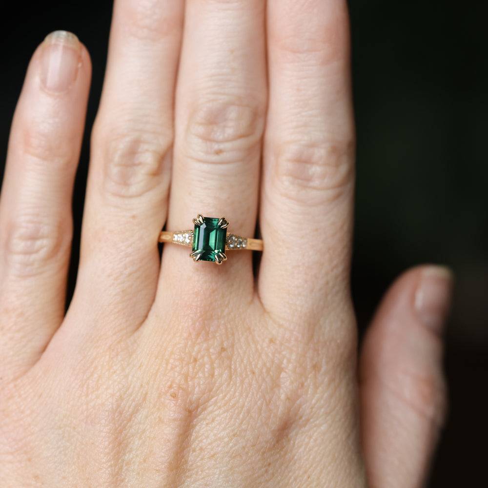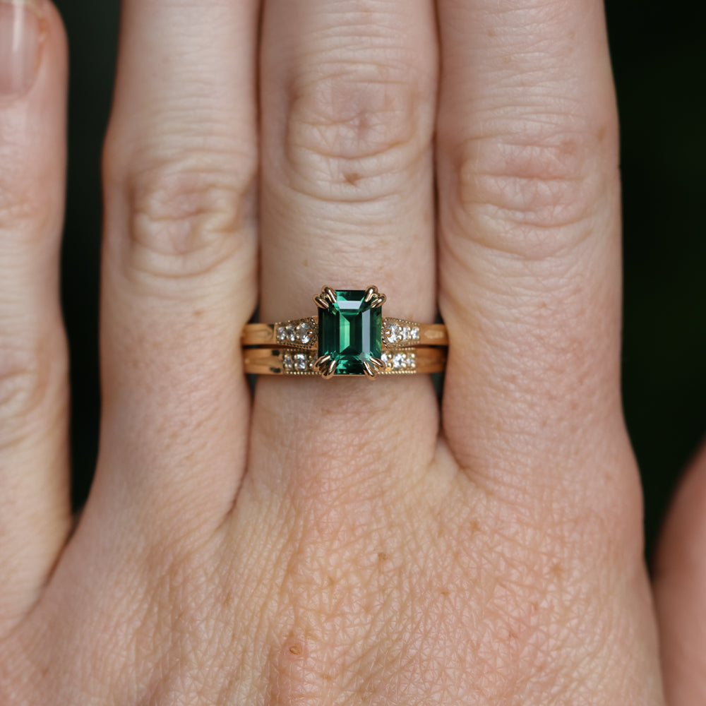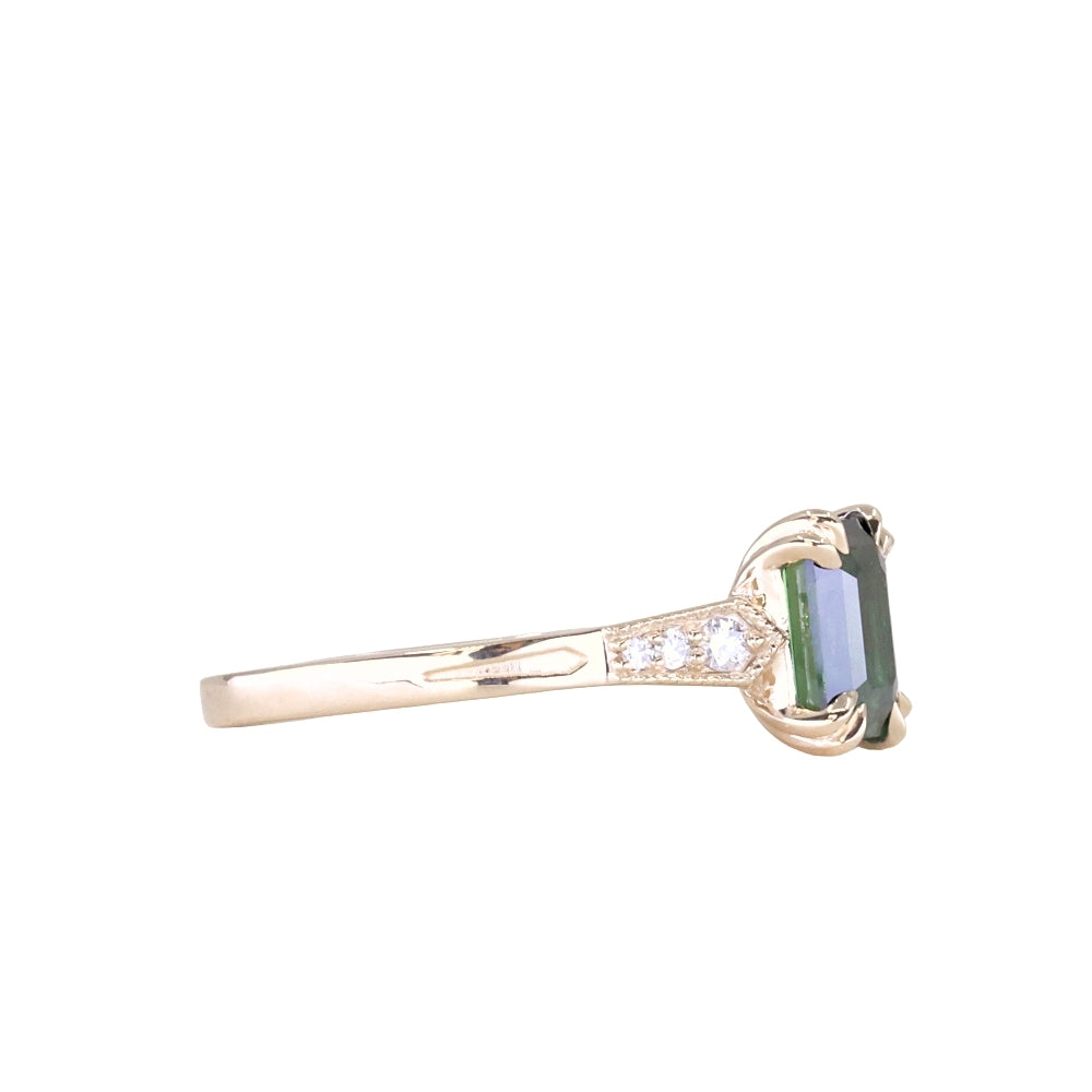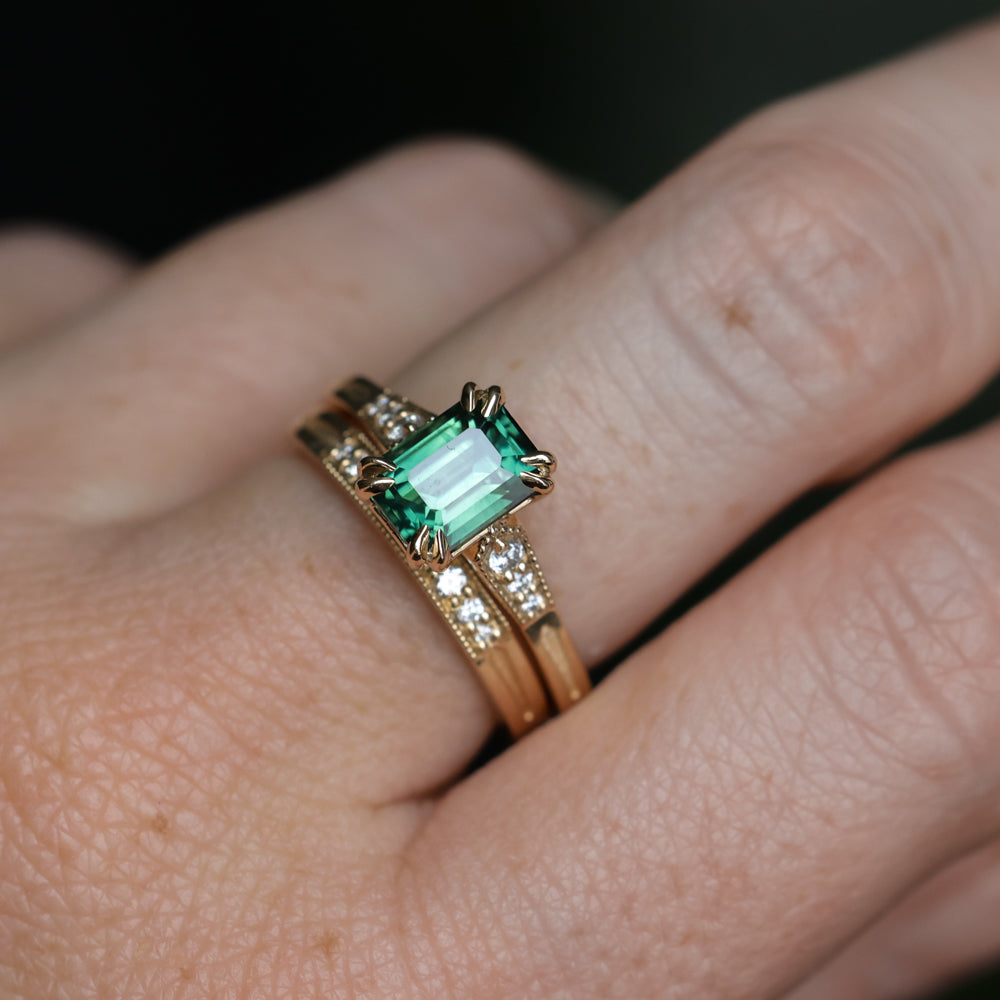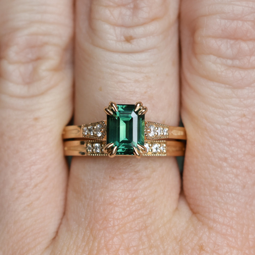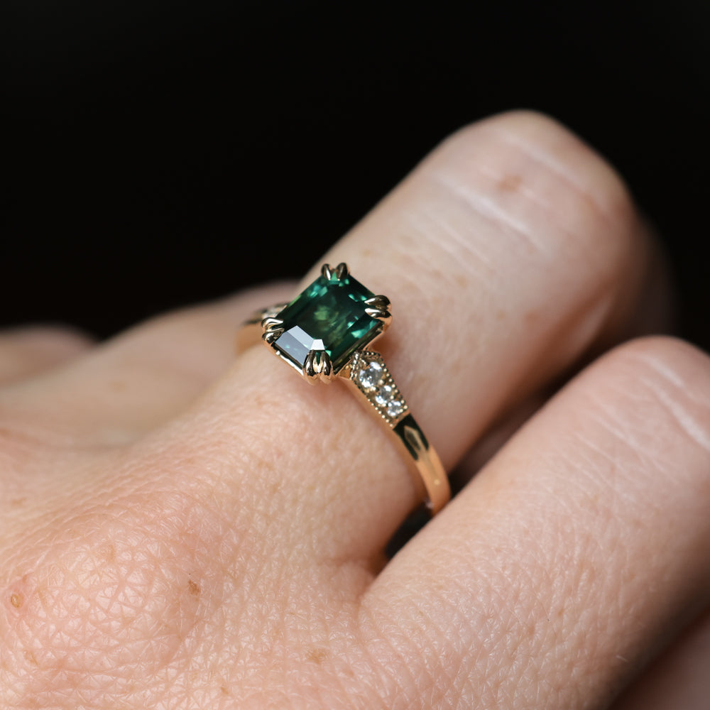 Forest green emerald cut sapphire from Madagascar in a classic, antique-inspired prong setting. The natural, white diamonds in the band are framed with delicate milgrain texture. The setting is stackable with straight bands and is made plain, without texture. This ring is made in a polished finish in solid 14k yellow gold.