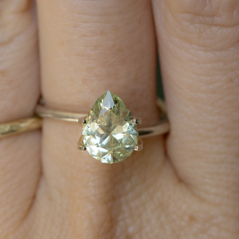 2.22CT PRECISION CUT PEAR MONTANA SAPPHIRE, LIGHT SPRING AND SEAFOAM GREEN, 10.24X7.31X4.61MM. Mined in Rock Creek, Montana, USA. Visible inclusions like the rainbow shimmer pictured here, but the sapphire is precision cut for sparkle and not hazy, and a RARE over 2ct size! Sapphires from Montana are naturally more rare to finish in a size over 2ct. This will shift in color to show some lighter seafoam and spring green hues and maybe some yellow or minty flashes. This sapphire has been heated, a permanent treatment for color and clarity.