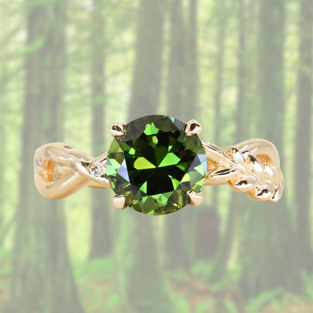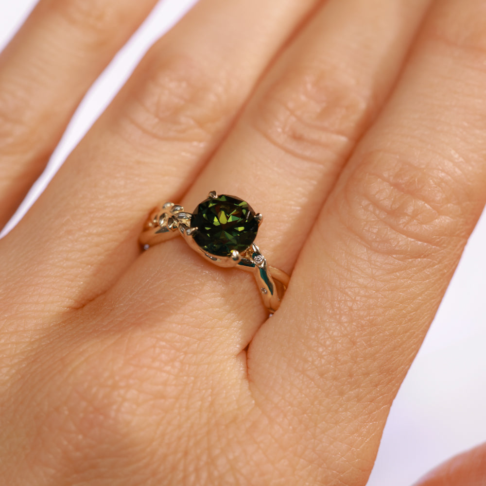 2.37ct Untreated Round Green Madagascar Sapphire Twisted Vine Split Shank Solitaire in 14k Yellow Gold with Diamonds