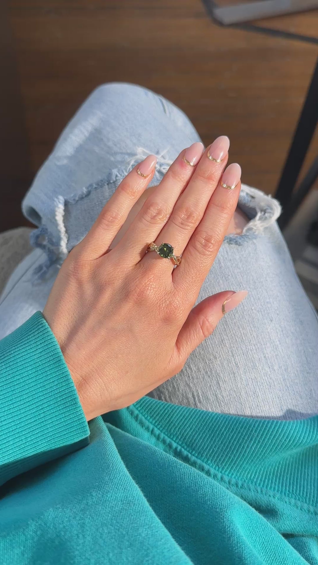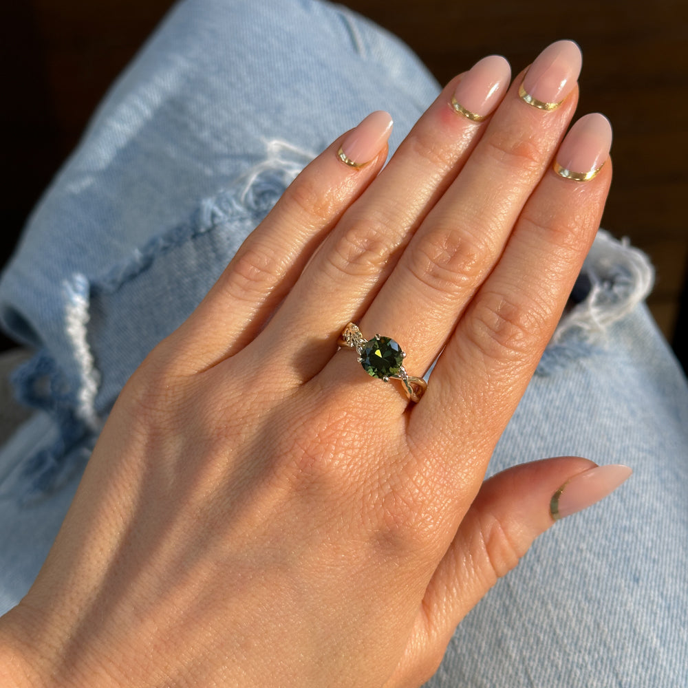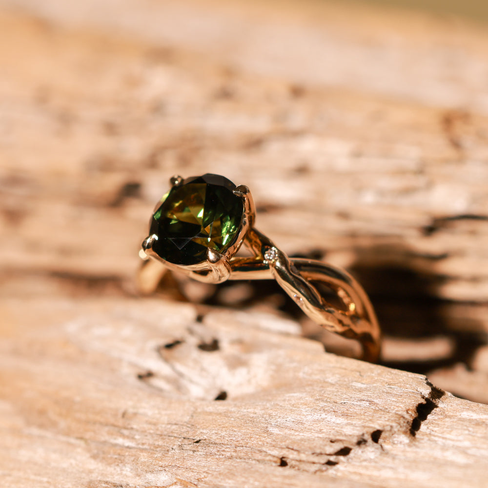 Earthy, asymmetrical twisted setting with embedded diamonds and hand carved texture! At the center of this nature-inspired setting is a beautiful deep green, untreated sapphire from Madagascar weighing 2.37ct