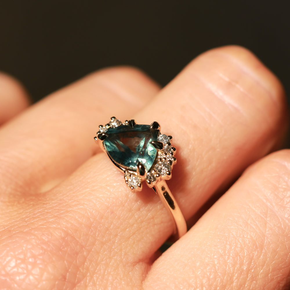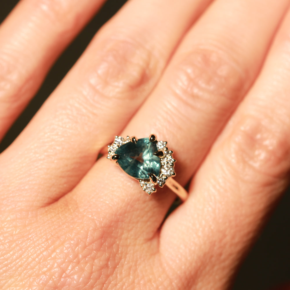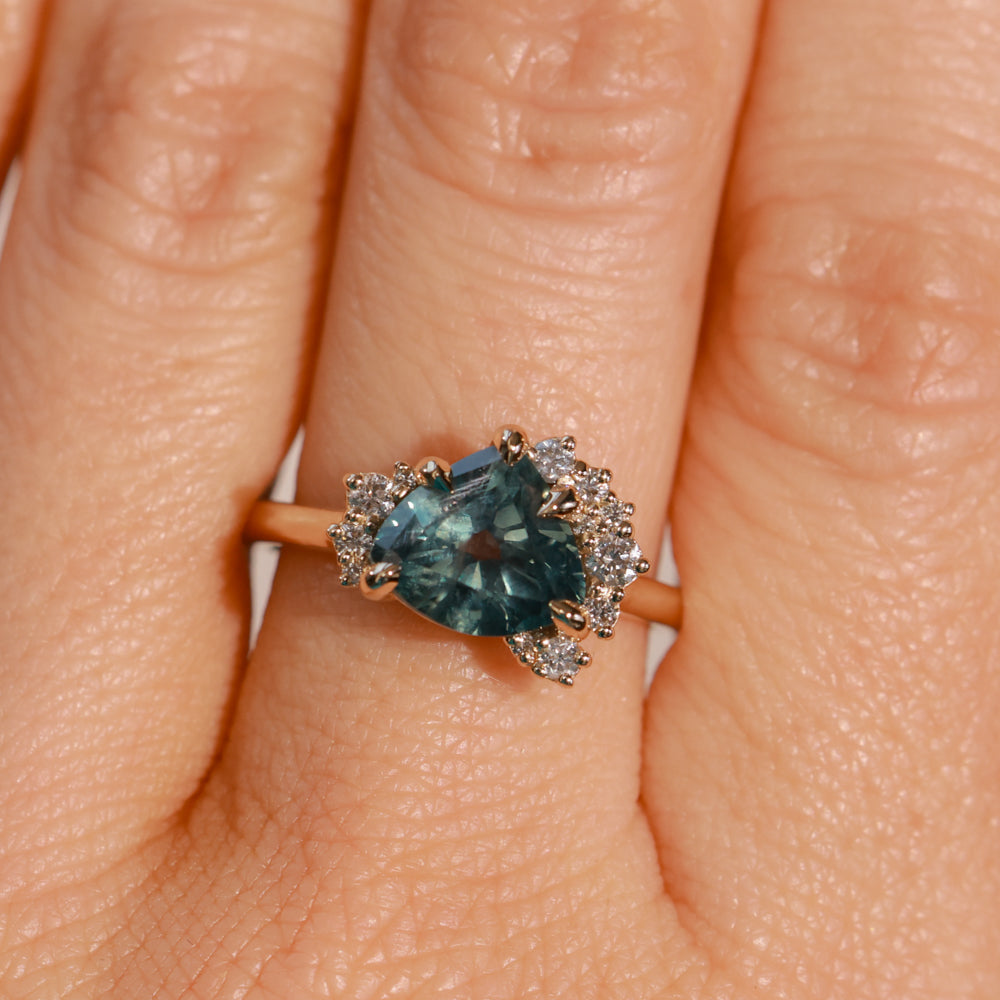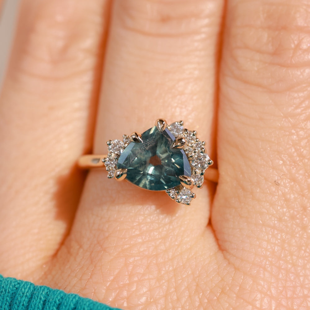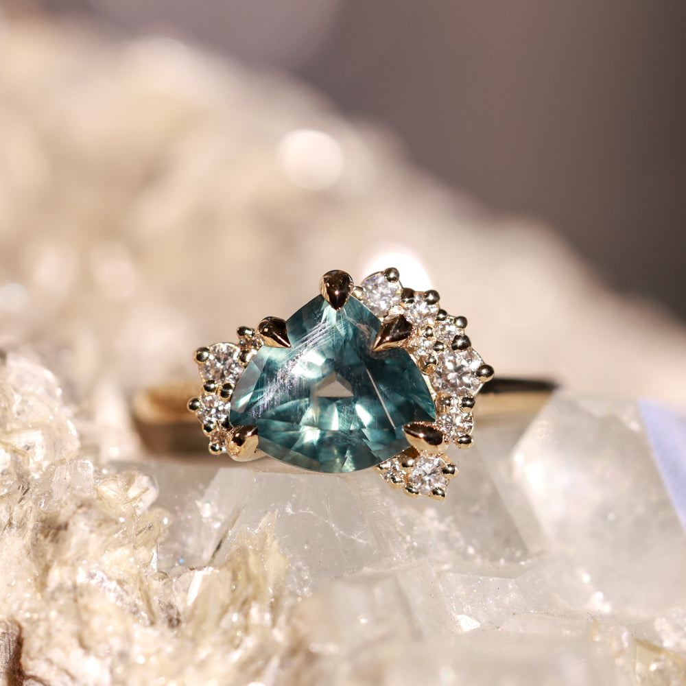 The mountain-inspired style that sells out fast! Our low profile "mountainscape" rings typically feature a trillion center sapphire and asymmetrical clustered diamonds on either side; like your favorite mountain peak and its rolling foothills! This one features a one-of-a-kind sapphire mined in Montana with a color-shifting blue teal color, and natural white brilliant cut diamonds. The setting is cast in 14k recycled yellow gold and sits low to the hand, stacking well with curved bands or straight bands with a slight gap.