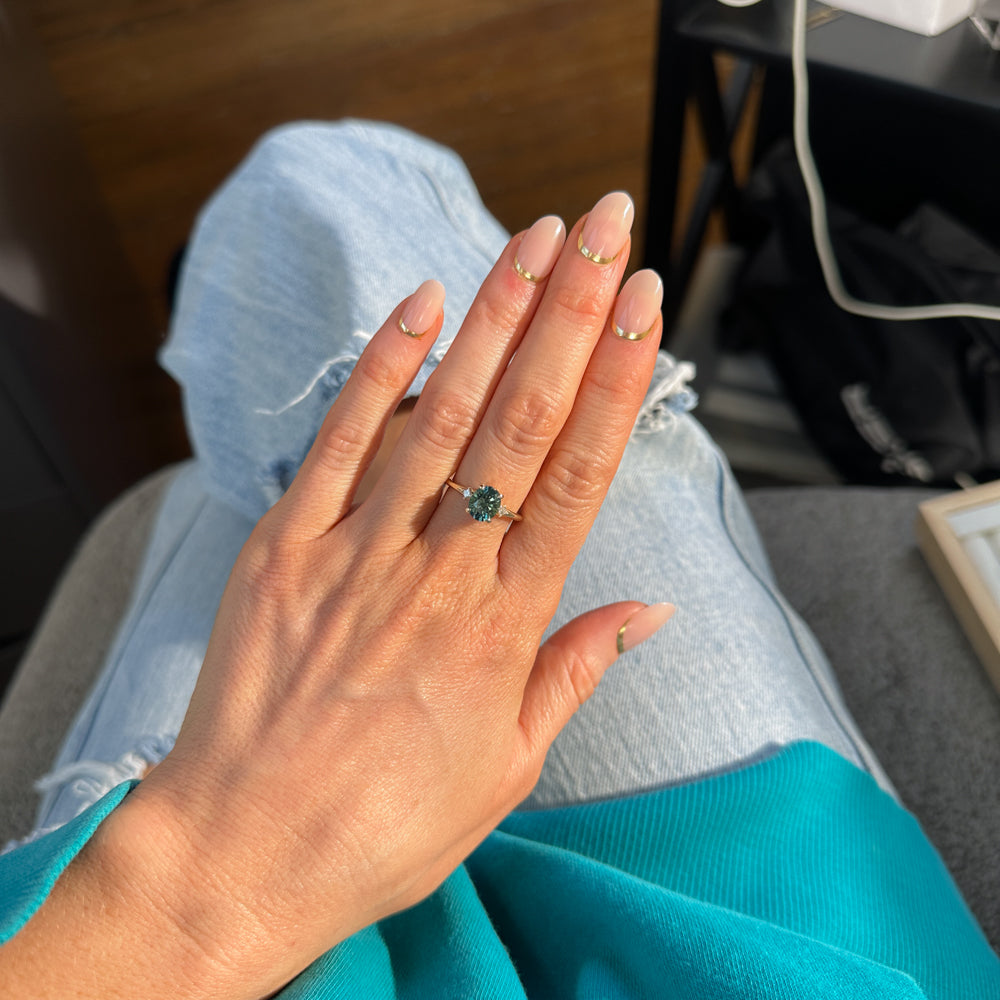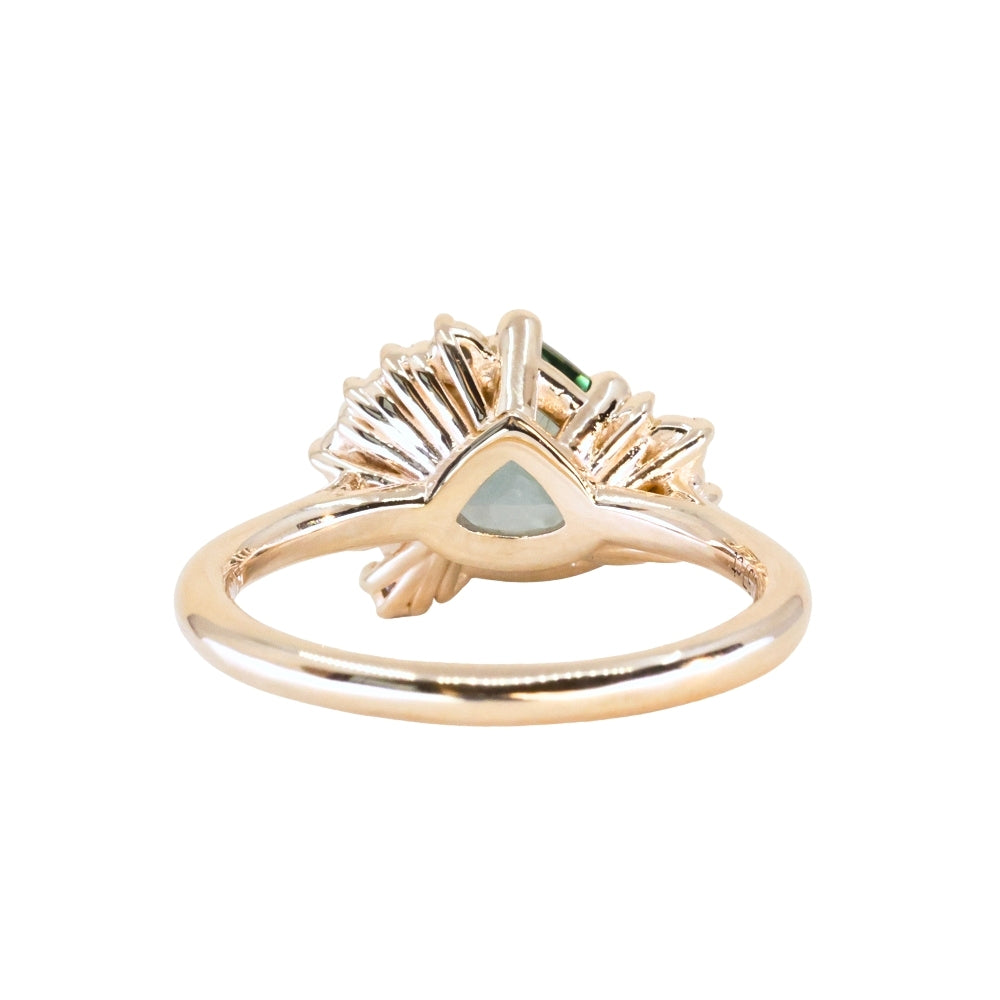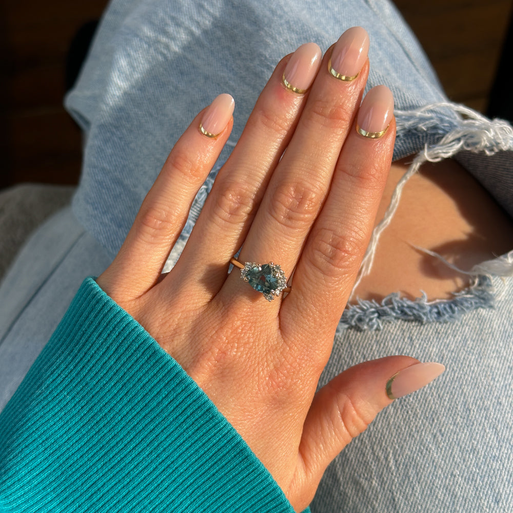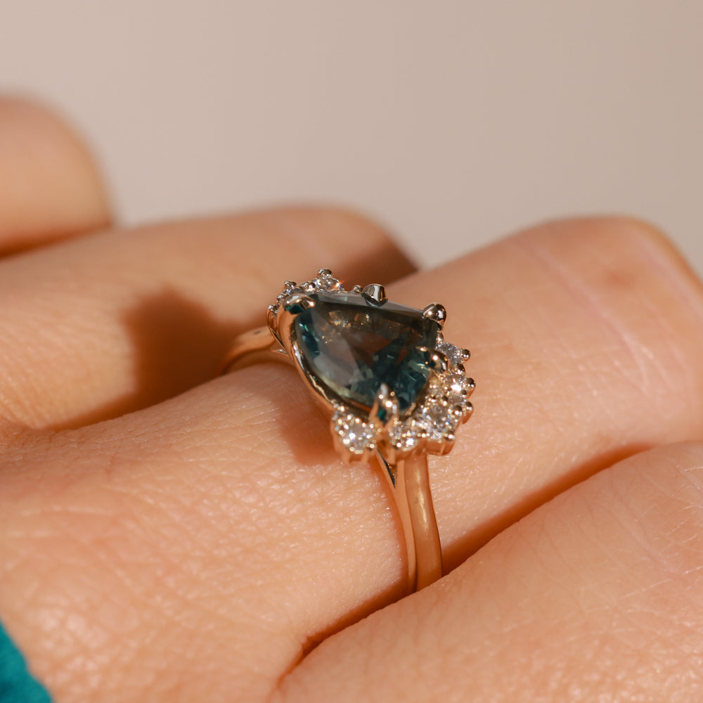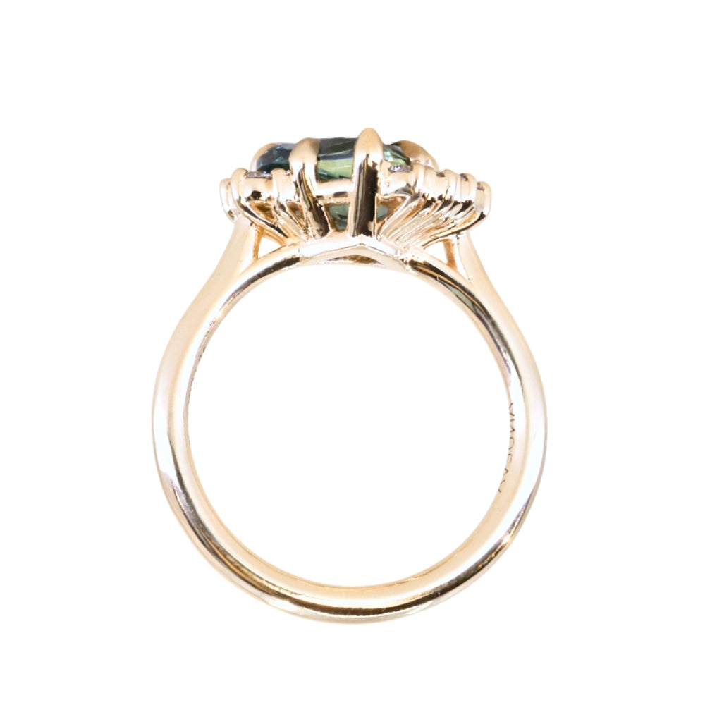 The mountain-inspired style that sells out fast! Our low profile "mountainscape" rings typically feature a trillion center sapphire and asymmetrical clustered diamonds on either side; like your favorite mountain peak and its rolling foothills! This one features a one-of-a-kind sapphire mined in Montana with a color-shifting blue teal color, and natural white brilliant cut diamonds. The setting is cast in 14k recycled yellow gold and sits low to the hand, stacking well with curved bands or straight bands with a slight gap.