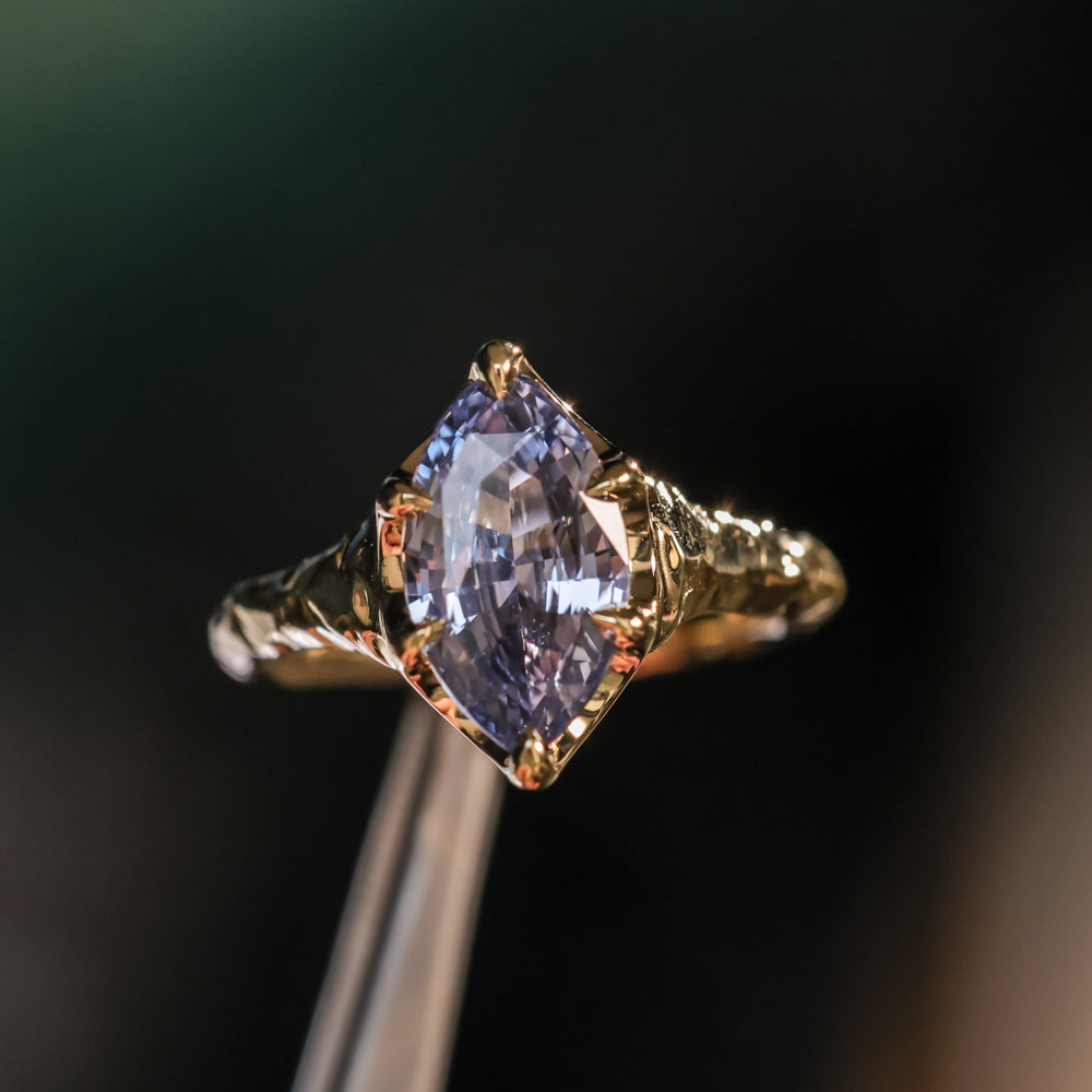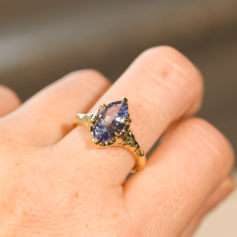 At the center of this showstopper of a ring is an unheated marquise sapphire from Madagascar weighting 3.16ct in a purple-blue hue. Created in an antique style with chunky, hand carved Evergreen texture, this solitaire sits low to the hand, and would stack best with curved or pointed bands. We can also make one custom for you to nest with this, OR we can provide suggestions like the bands pictured in the stack examples.