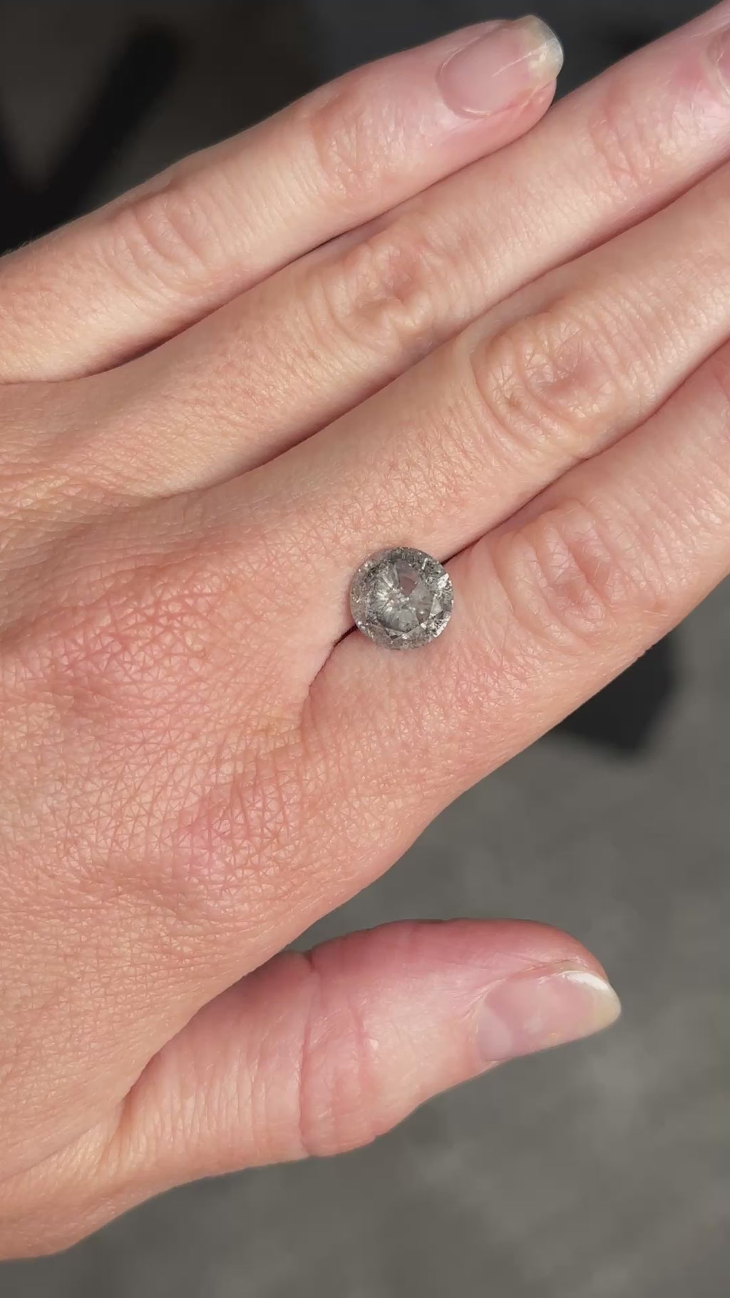 3.19CT ROUND SALT AND PEPPER DIAMOND, DARK GREY OPAQUE, 9.18X5.86MM. Heavily included, glowy instead of sparkling. The outer rim of dark inclusions and lighter grey inclusions in the middle.  Natural, earth-mined.